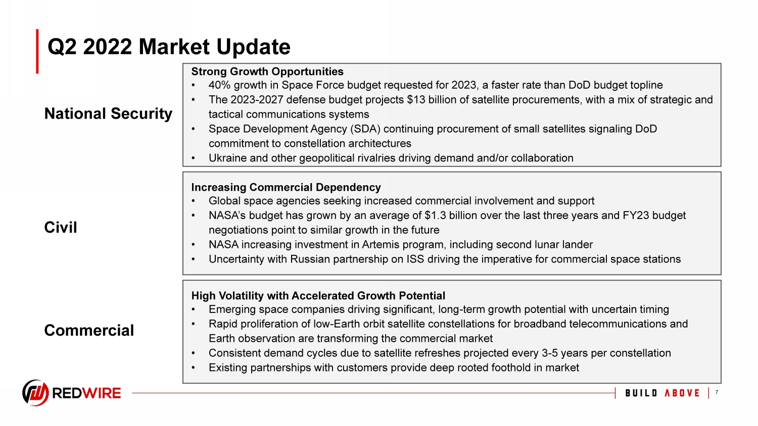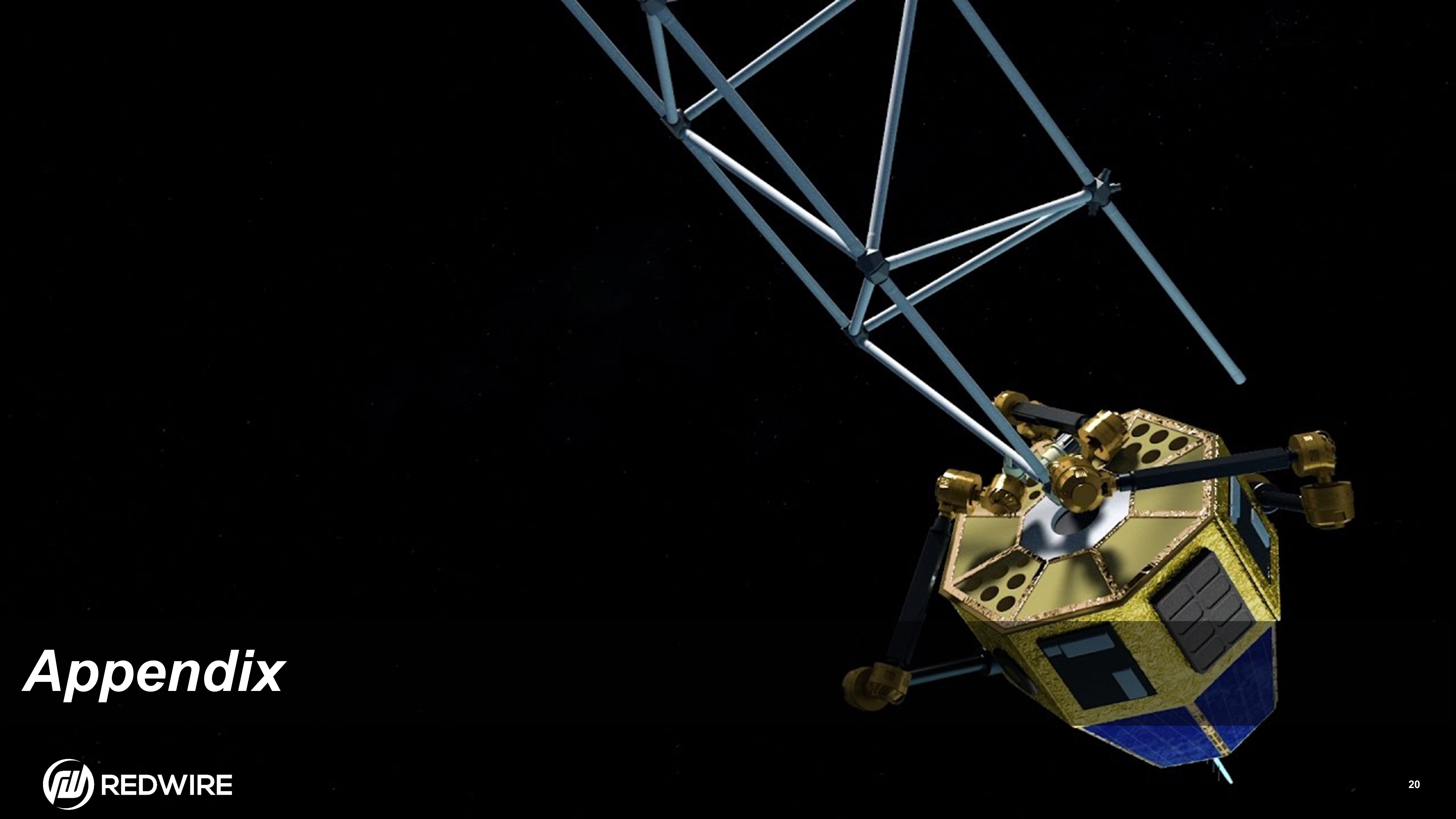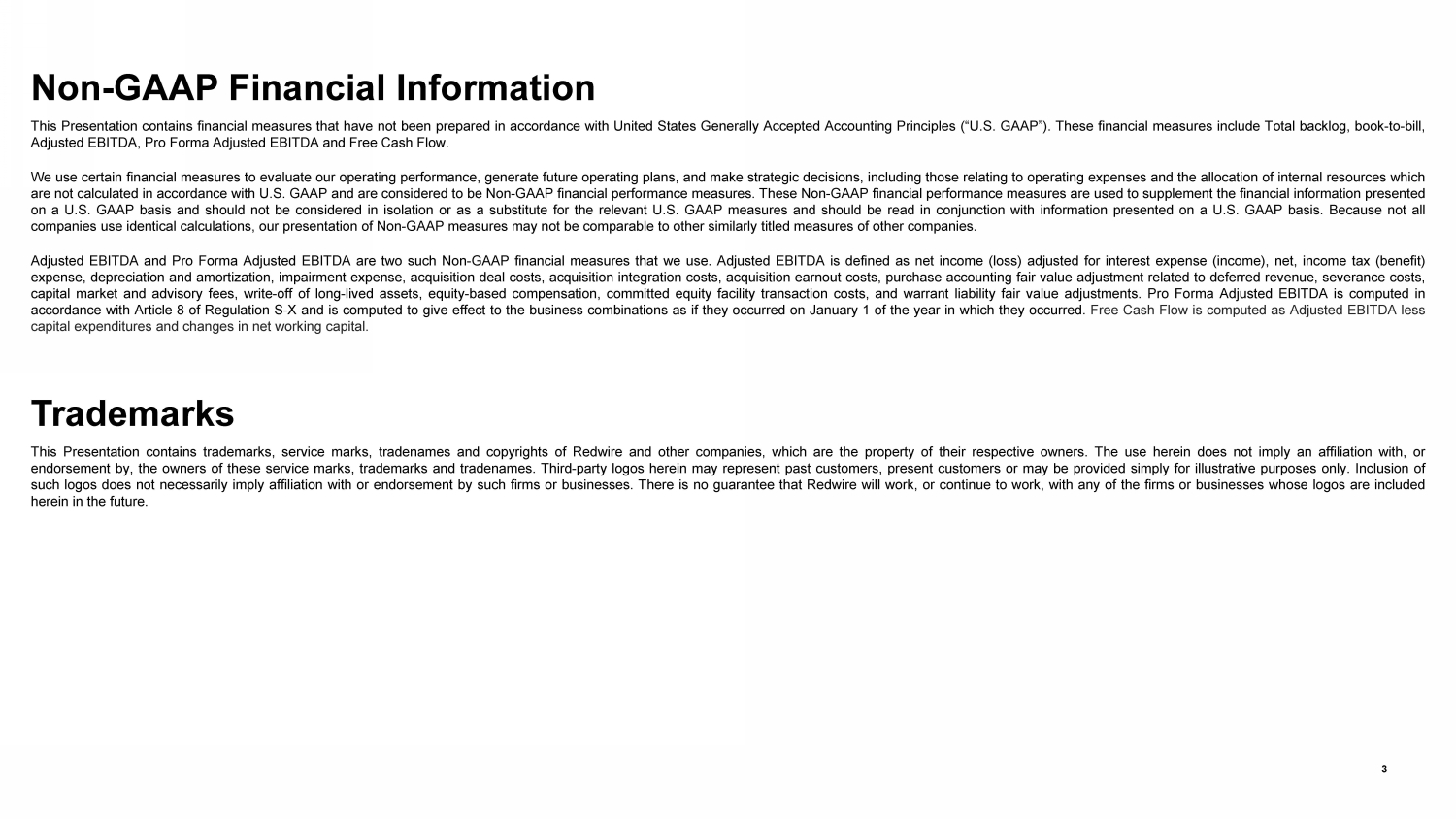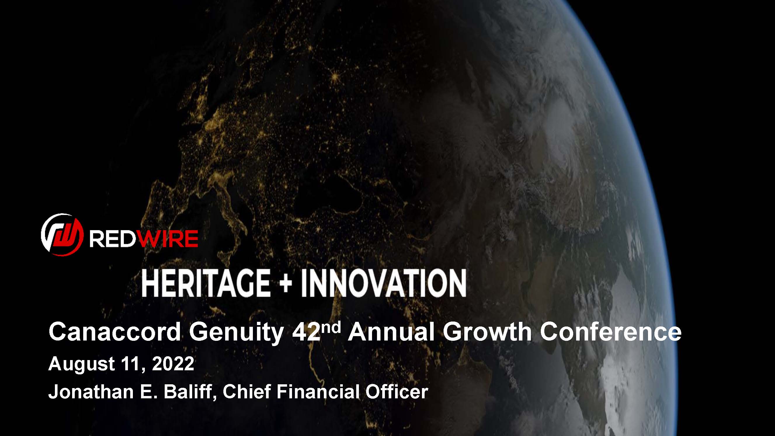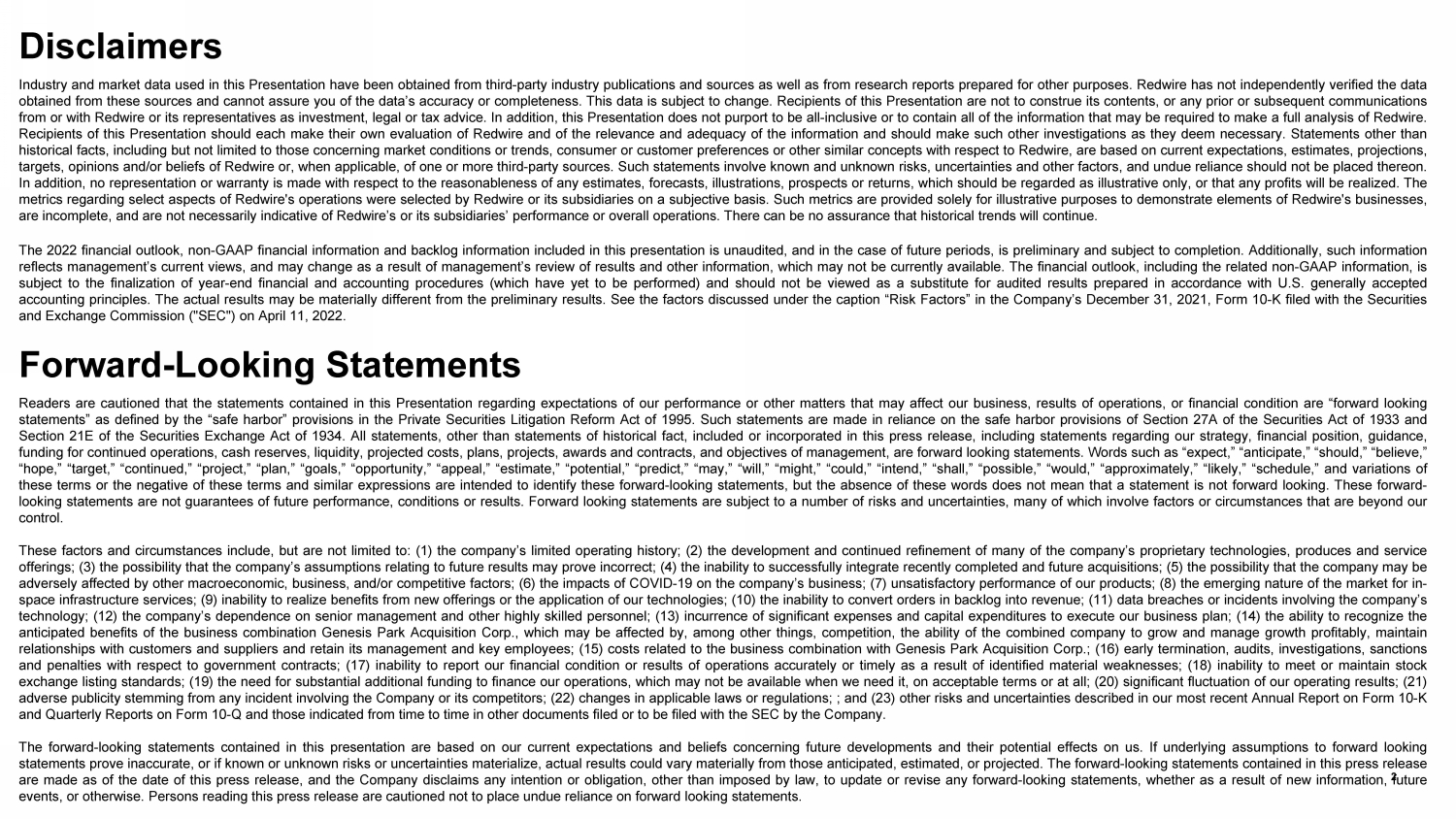 Disclaimers Industry and market data used in this Presentation have been obtained from third - party industry publications and sources as well as from research reports prepared for other purposes . Redwire has not independently verified the data obtained from these sources and cannot assure you of the data’s accuracy or completeness . This data is subject to change . Recipients of this Presentation are not to construe its contents, or any prior or subsequent communications from or with Redwire or its representatives as investment, legal or tax advice . In addition, this Presentation does not purport to be all - inclusive or to contain all of the information that may be required to make a full analysis of Redwire . Recipients of this Presentation should each make their own evaluation of Redwire and of the relevance and adequacy of the information and should make such other investigations as they deem necessary . Statements other than historical facts, including but not limited to those concerning market conditions or trends, consumer or customer preferences or other similar concepts with respect to Redwire, are based on current expectations, estimates, projections, targets, opinions and/or beliefs of Redwire or, when applicable, of one or more third - party sources . Such statements involve known and unknown risks, uncertainties and other factors, and undue reliance should not be placed thereon . In addition, no representation or warranty is made with respect to the reasonableness of any estimates, forecasts, illustrations, prospects or returns, which should be regarded as illustrative only, or that any profits will be realized . The metrics regarding select aspects of Redwire's operations were selected by Redwire or its subsidiaries on a subjective basis . Such metrics are provided solely for illustrative purposes to demonstrate elements of Redwire's businesses, are incomplete, and are not necessarily indicative of Redwire’s or its subsidiaries’ performance or overall operations . There can be no assurance that historical trends will continue . The 2022 financial outlook, non - GAAP financial information and backlog information included in this presentation is unaudited, and in the case of future periods, is preliminary and subject to completion . Additionally, such information reflects management’s current views, and may change as a result of management’s review of results and other information, which may not be currently available . The financial outlook, including the related non - GAAP information, is subject to the finalization of year - end financial and accounting procedures (which have yet to be performed) and should not be viewed as a substitute for audited results prepared in accordance with U . S . generally accepted accounting principles . The actual results may be materially different from the preliminary results . See the factors discussed under the caption “Risk Factors” in the Company’s December 31 , 2021 , Form 10 - K filed with the Securities and Exchange Commission ("SEC") on April 11 , 2022 . Forward - Looking Statements Readers are cautioned that the statements contained in this Presentation regarding expectations of our performance or other matters that may affect our business, results of operations, or financial condition are “forward looking statements” as defined by the “safe harbor” provisions in the Private Securities Litigation Reform Act of 1995 . Such statements are made in reliance on the safe harbor provisions of Section 27 A of the Securities Act of 1933 and Section 21 E of the Securities Exchange Act of 1934 . All statements, other than statements of historical fact, included or incorporated in this press release, including statements regarding our strategy, financial position, guidance, funding for continued operations, cash reserves, liquidity, projected costs, plans, projects, awards and contracts, and objectives of management, are forward looking statements . Words such as “expect,” “anticipate,” “should,” “believe,” “hope,” “target,” “continued,” “project,” “plan,” “goals,” “opportunity,” “appeal,” “estimate,” “potential,” “predict,” “may,” “will,” “might,” “could,” “intend,” “shall,” “possible,” “would,” “approximately,” “likely,” “schedule,” and variations of these terms or the negative of these terms and similar expressions are intended to identify these forward - looking statements, but the absence of these words does not mean that a statement is not forward looking . These forward - looking statements are not guarantees of future performance, conditions or results . Forward looking statements are subject to a number of risks and uncertainties, many of which involve factors or circumstances that are beyond our control . These factors and circumstances include, but are not limited to : ( 1 ) the company’s limited operating history ; ( 2 ) the development and continued refinement of many of the company’s proprietary technologies, produces and service offerings ; ( 3 ) the possibility that the company’s assumptions relating to future results may prove incorrect ; ( 4 ) the inability to successfully integrate recently completed and future acquisitions ; ( 5 ) the possibility that the company may be adversely affected by other macroeconomic, business, and/or competitive factors ; ( 6 ) the impacts of COVID - 19 on the company’s business ; ( 7 ) unsatisfactory performance of our products ; ( 8 ) the emerging nature of the market for in - space infrastructure services ; ( 9 ) inability to realize benefits from new offerings or the application of our technologies ; ( 10 ) the inability to convert orders in backlog into revenue ; ( 11 ) data breaches or incidents involving the company’s technology ; ( 12 ) the company’s dependence on senior management and other highly skilled personnel ; ( 13 ) incurrence of signific