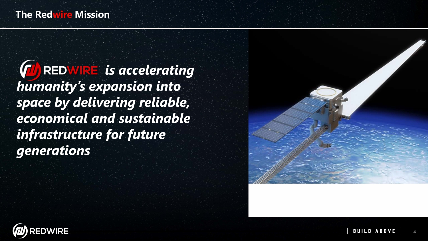 Non - GAAP Financial Information This Presentation contains financial measures that have not been prepared in accordance with United States Generally Accepted Accounting Principles (“U . S . GAAP”) . These financial measures include Total backlog, book - to - bill, Adjusted EBITDA, Pro Forma Adjusted EBITDA and Free Cash Flow . We use certain financial measures to evaluate our operating performance, generate future operating plans, and make strategic decisions, including those relating to operating expenses and the allocation of internal resources which are not calculated in accordance with U . S . GAAP and are considered to be Non - GAAP financial performance measures . These Non - GAAP financial performance measures are used to supplement the financial information presented on a U . S . GAAP basis and should not be considered in isolation or as a substitute for the relevant U . S . GAAP measures and should be read in conjunction with information presented on a U . S . GAAP basis . Because not all companies use identical calculations, our presentation of Non - GAAP measures may not be comparable to other similarly titled measures of other companies . Adjusted EBITDA and Pro Forma Adjusted EBITDA are two such Non - GAAP financial measures that we use . Adjusted EBITDA is defined as net income (loss) adjusted for interest expense (income), net, income tax (benefit) expense, depreciation and amortization, impairment expense, acquisition deal costs, acquisition integration costs, acquisition earnout costs, purchase accounting fair value adjustment related to deferred revenue, severance costs, capital market and advisory fees, write - off of long - lived assets, equity - based compensation, committed equity facility transaction costs, and warrant liability fair value adjustments . Pro Forma Adjusted EBITDA is computed in accordance with Article 8 of Regulation S - X and is computed to give effect to the business combinations as if they occurred on January 1 of the year in which they occurred . Free Cash Flow is computed as Adjusted EBITDA less capital expenditures and changes in net working capital . Trademarks This Presentation contains trademarks, service marks, tradenames and copyrights of Redwire and other companies, which are the property of their respective owners . The use herein does not imply an affiliation with, or endorsement by, the owners of these service marks, trademarks and tradenames . Third - party logos herein may represent past customers, present customers or may be provided simply for illustrative purposes only . Inclusion of such logos does not necessarily imply affiliation with or endorsement by such firms or businesses . There is no guarantee that Redwire will work, or continue to work, with any of the firms or businesses whose logos are included herein in the future . 3