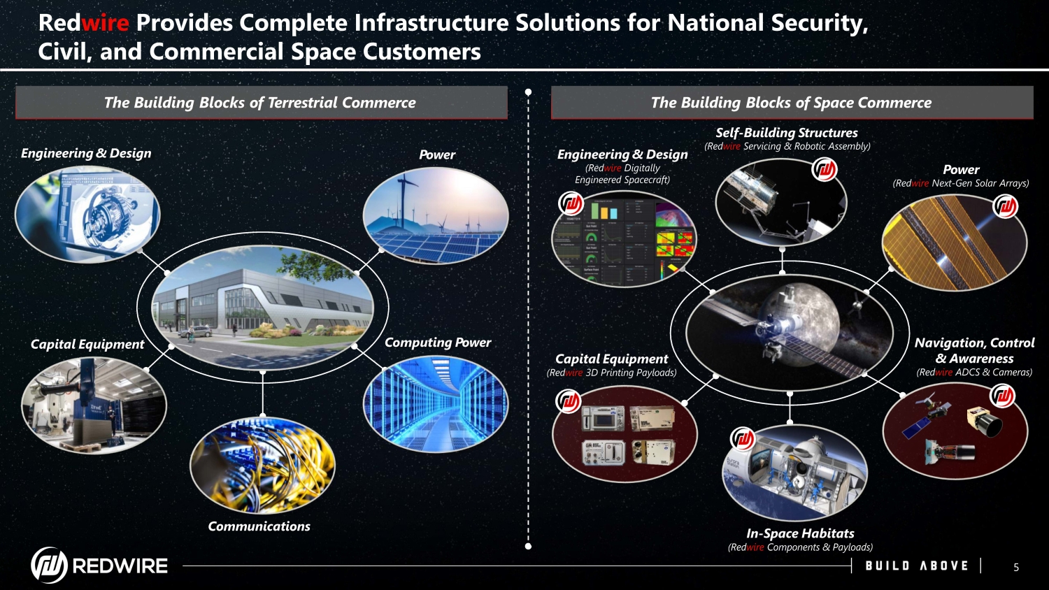 Red wire Provides Complete Infrastructure Solutions for National Security, Civil, and Commercial Space Customers The Building Blocks of Terrestrial Commerce Engineering & Design C ap i ta l E q ui pm ent P o w e r C o m p u t in g P o w e r Power (Red wire Next - Gen Solar Arrays) Capital Equipment (Red wire 3D Printing Payloads) Engineering & Design (Red wire Digitally Engineered Spacecraft) N a vi gat i o n , C o n t r o l & Awareness (Red wire ADCS & Cameras) Communications In - Space Habitats (Red wire Components & Payloads) The Building Blocks of Space Commerce Self - Building Structures (Red wire Servicing & Robotic Assembly) 5