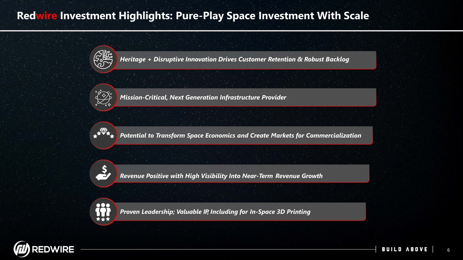 Heritage + Disruptive Innovation Drives Customer Retention & Robust Backlog Red wire Investment Highlights: Pure - Play Space Investment With Scale Potential to Transform Space Economics and Create Markets for Commercialization Mission - Critical, Next Generation Infrastructure Provider Revenue Positive with High Visibility Into Near - Term Revenue Growth Proven Leadership; Valuable IP, Including for In - Space 3D Printing 6