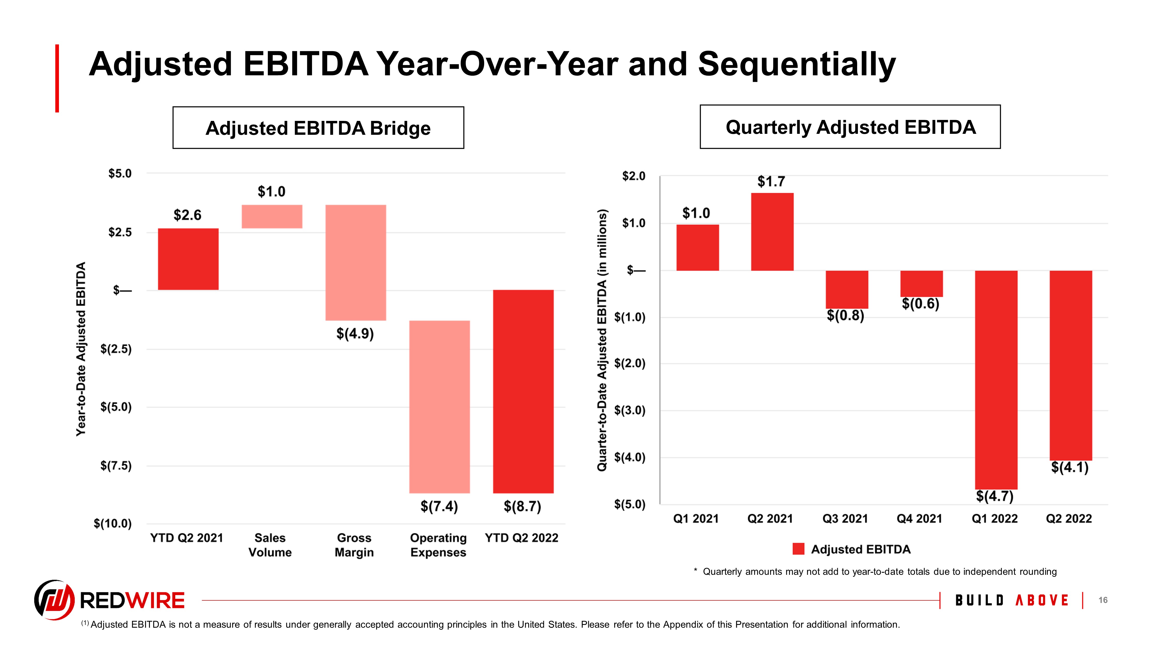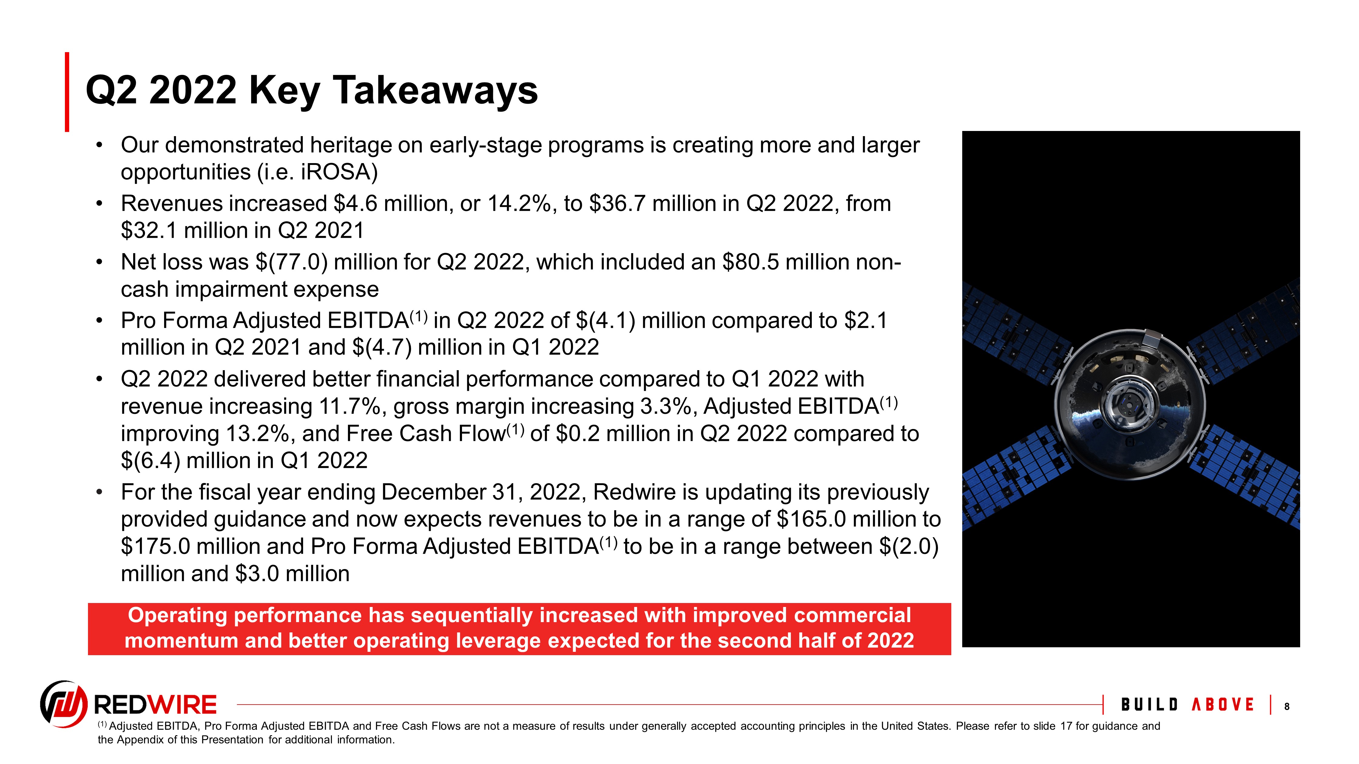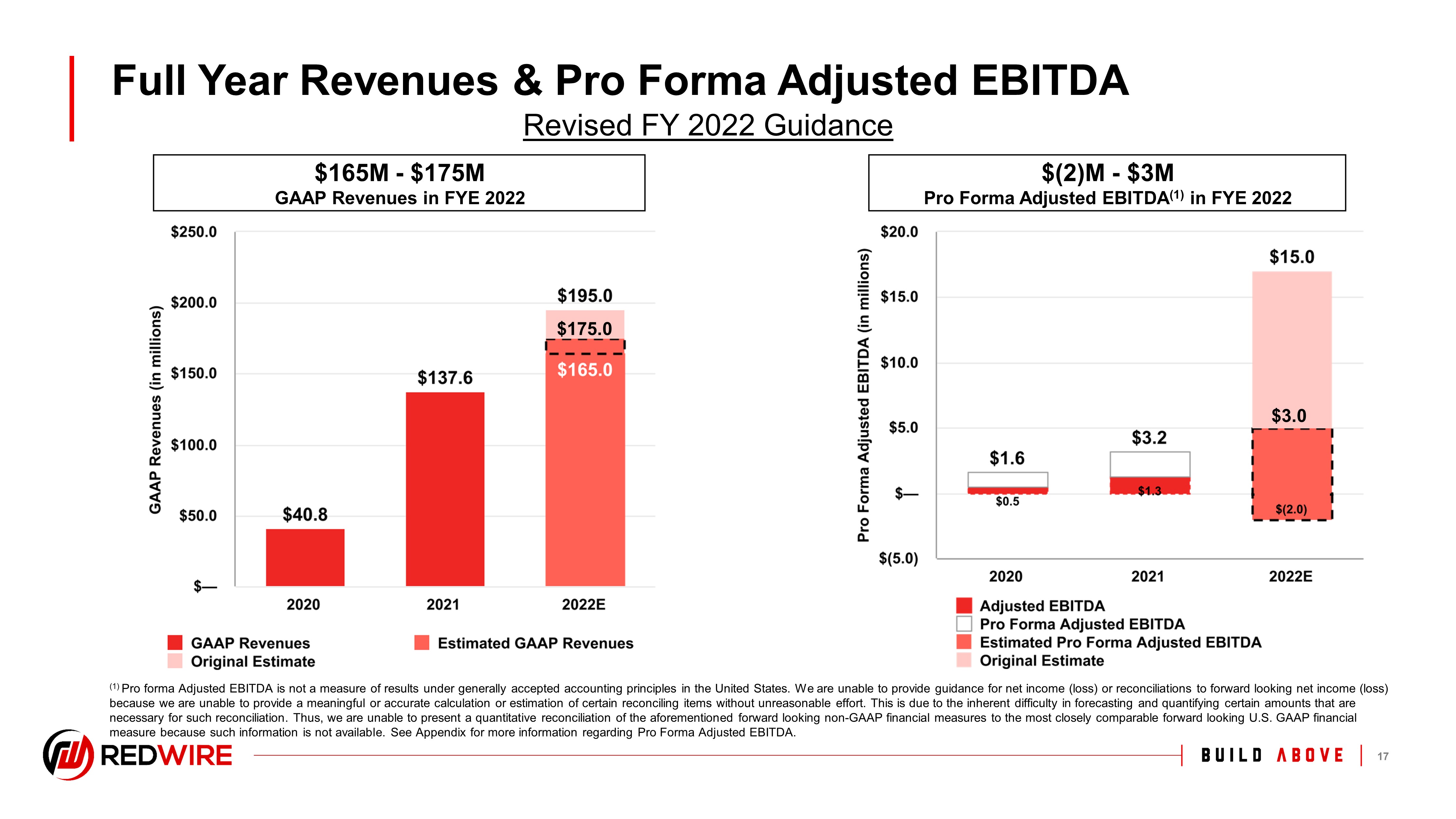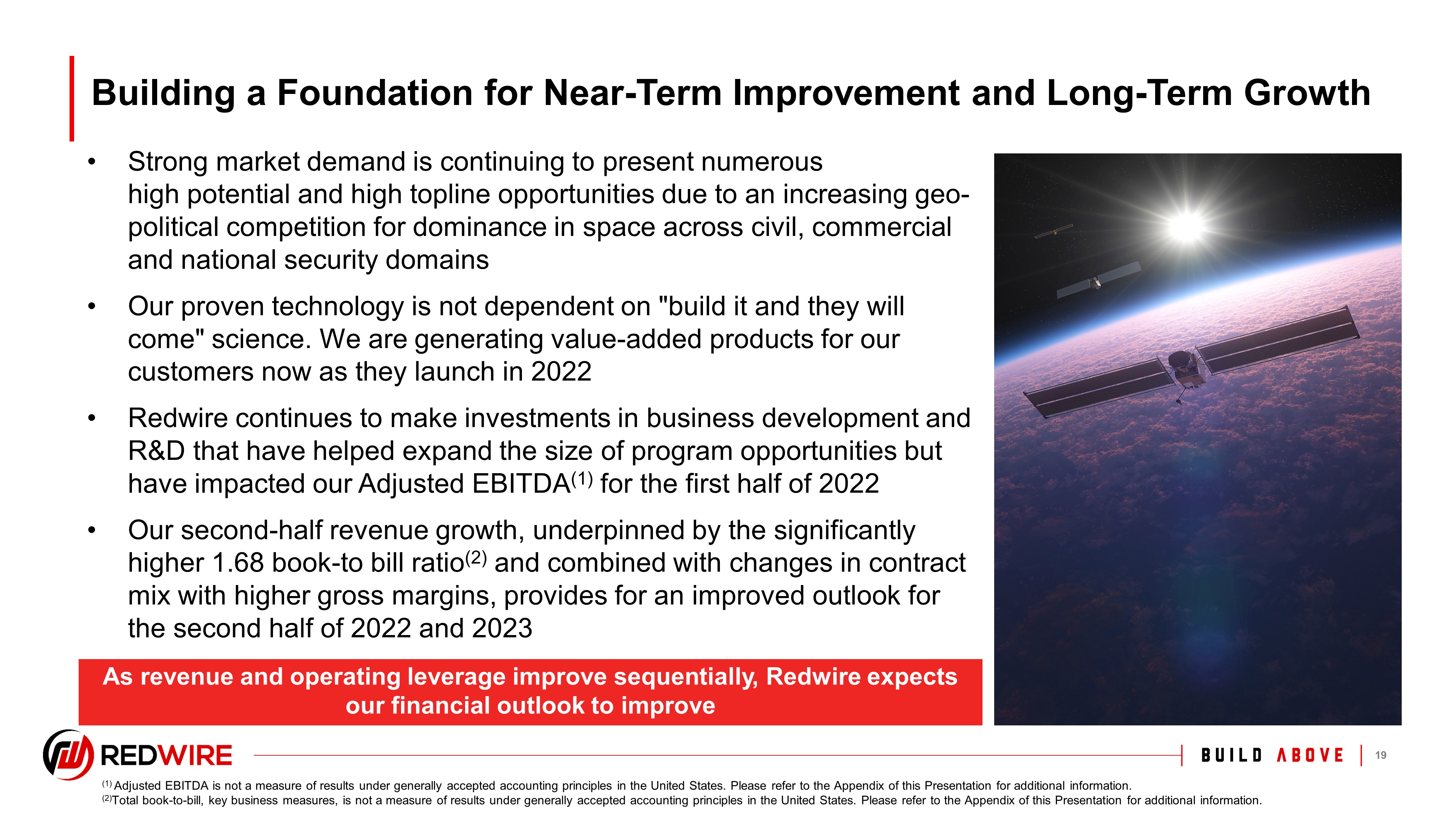 1. Insert Footnote 16 • Strong market demand is continuing to present numerous high potential and high topline opportunities due to an increasing geo - political competition for dominance in space across civil, commercial and national security domains • Our proven technology is not dependent on "build it and they will come" science. We are generating value - added products for our customers now as they launch in 2022 • Redwire continues to make investments in business development and R&D that have helped expand the size of program opportunities but have impacted our Adjusted EBITDA (1) for the first half of 2022 • Our second - half revenue growth, underpinned by the significantly higher 1.68 book - to bill ratio (2) and combined with changes in contract mix with higher gross margins, provides for an improved outlook for the second half of 2022 and 2023 Building a Foundation for Near - Term Improvement and Long - Term Growth As revenue and operating leverage improve sequentially, Redwire expects our financial outlook to improve (1) Adjusted EBITDA is not a measure of results under generally accepted accounting principles in the United States. Please refer to the Appendix of this Presentation for additional information. (2) Total book - to - bill, key business measures, is not a measure of results under generally accepted accounting principles in the Uni ted States. Please refer to the Appendix of this Presentation for additional information.