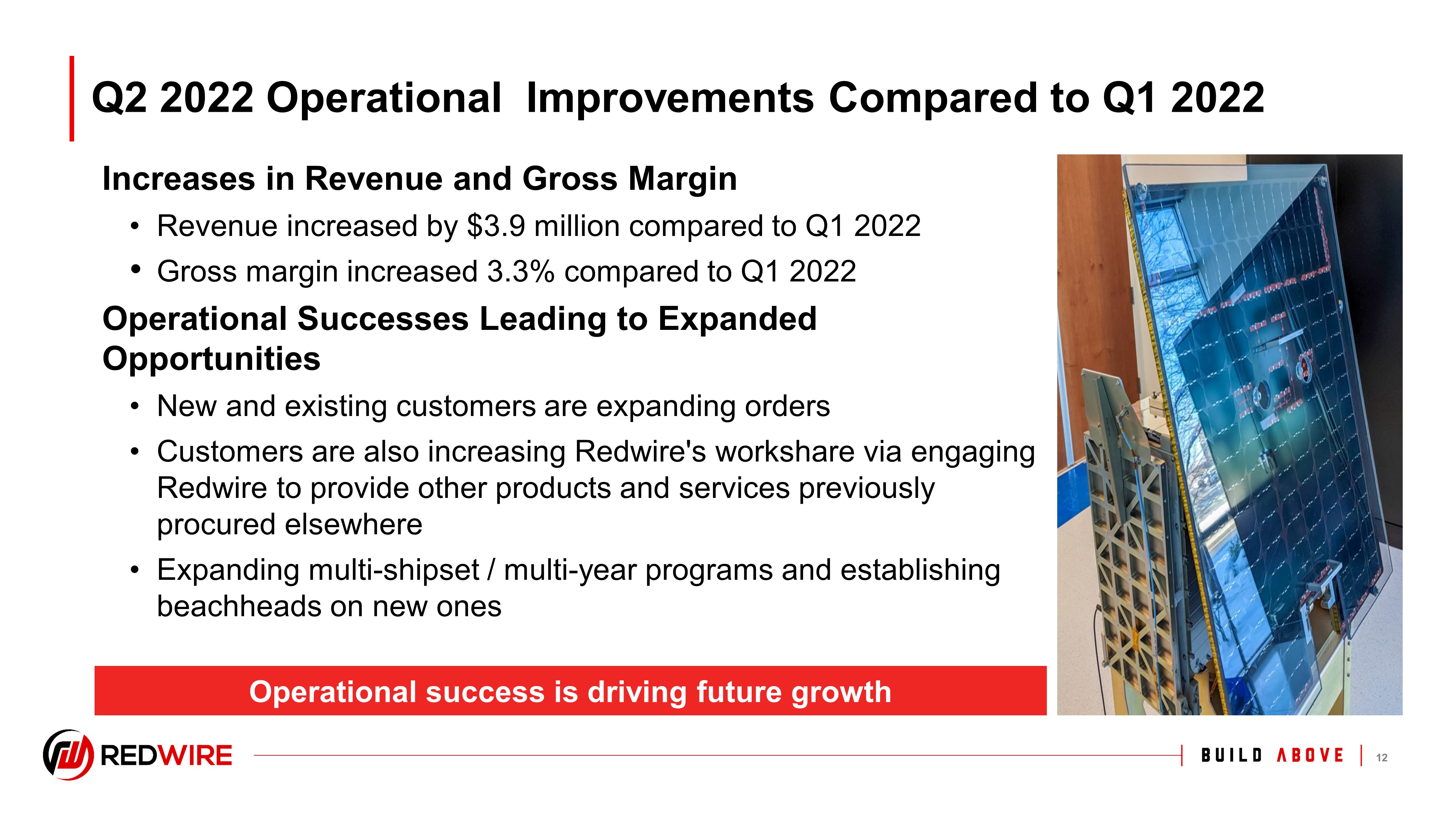 1. Insert Footnote 9 Q2 2022 Operational Improvements Compared to Q1 2022 Increases in Revenue and Gross Margin • Revenue increased by $3.9 million compared to Q1 2022 • Gross margin increased 3.3% compared to Q1 2022 Operational Successes Leading to Expanded Opportunities • New and existing customers are expanding orders • Customers are also increasing Redwire's workshare via engaging Redwire to provide other products and services previously procured elsewhere • Expanding multi - shipset / multi - year programs and establishing beachheads on new ones Operational success is driving future growth