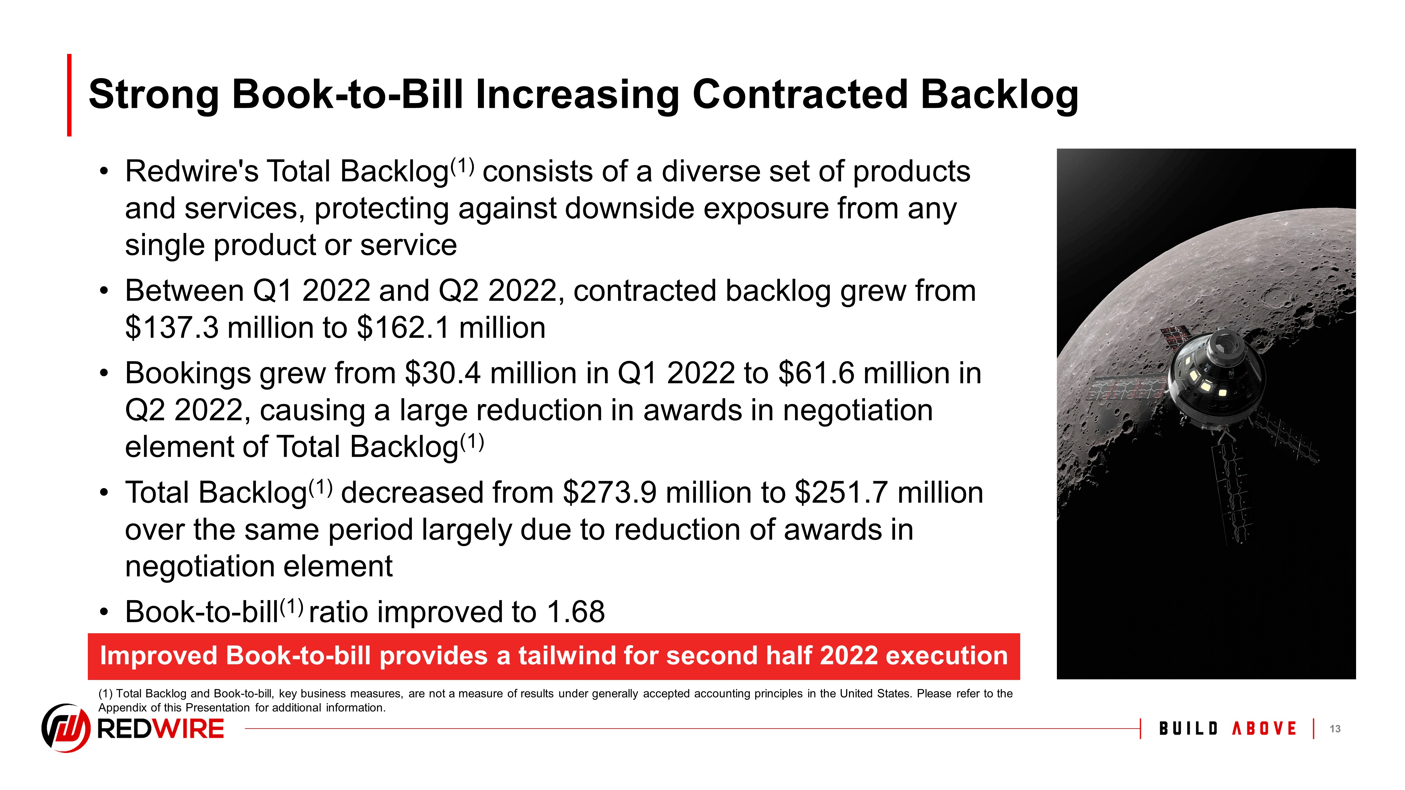 1. Insert Footnote 10 Strong Book - to - Bill Increasing Contracted Backlog • Redwire's Total Backlog (1) consists of a diverse set of products and services, protecting against downside exposure from any single product or service • Between Q1 2022 and Q2 2022, contracted backlog grew from $137.3 million to $162.1 million • Bookings grew from $30.4 million in Q1 2022 to $61.6 million in Q2 2022, causing a large reduction in awards in negotiation element of Total Backlog (1) • Total Backlog (1) decreased from $273.9 million to $251.7 million over the same period largely due to reduction of awards in negotiation element • Book - to - bill (1) ratio improved to 1.68 Improved Book - to - bill provides a tailwind for second half 2022 execution (1) Total Backlog and Book - to - bill, key business measures, are not a measure of results under generally accepted accounting prin ciples in the United States. Please refer to the Appendix of this Presentation for additional information.