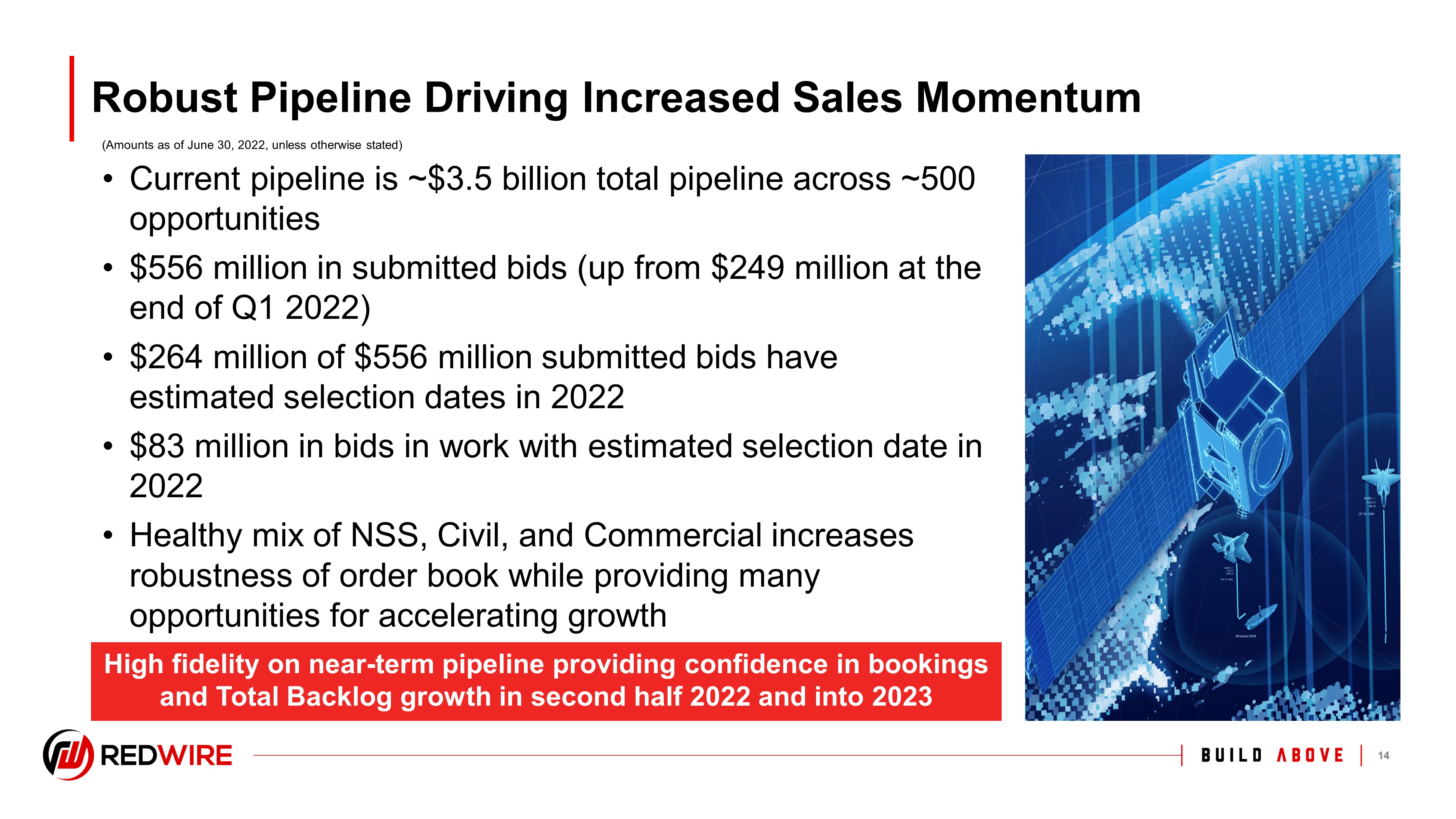 1. Insert Footnote 11 Robust Pipeline Driving Increased Sales Momentum • Current pipeline is ~$3.5 billion total pipeline across ~500 opportunities • $556 million in submitted bids (up from $249 million at the end of Q1 2022) • $264 million of $556 million submitted bids have estimated selection dates in 2022 • $83 million in bids in work with estimated selection date in 2022 • Healthy mix of NSS, Civil, and Commercial increases robustness of order book while providing many opportunities for accelerating growth High fidelity on near - term pipeline providing confidence in bookings and Total Backlog growth in second half 2022 and into 2023 (Amounts as of June 30, 2022, unless otherwise stated)