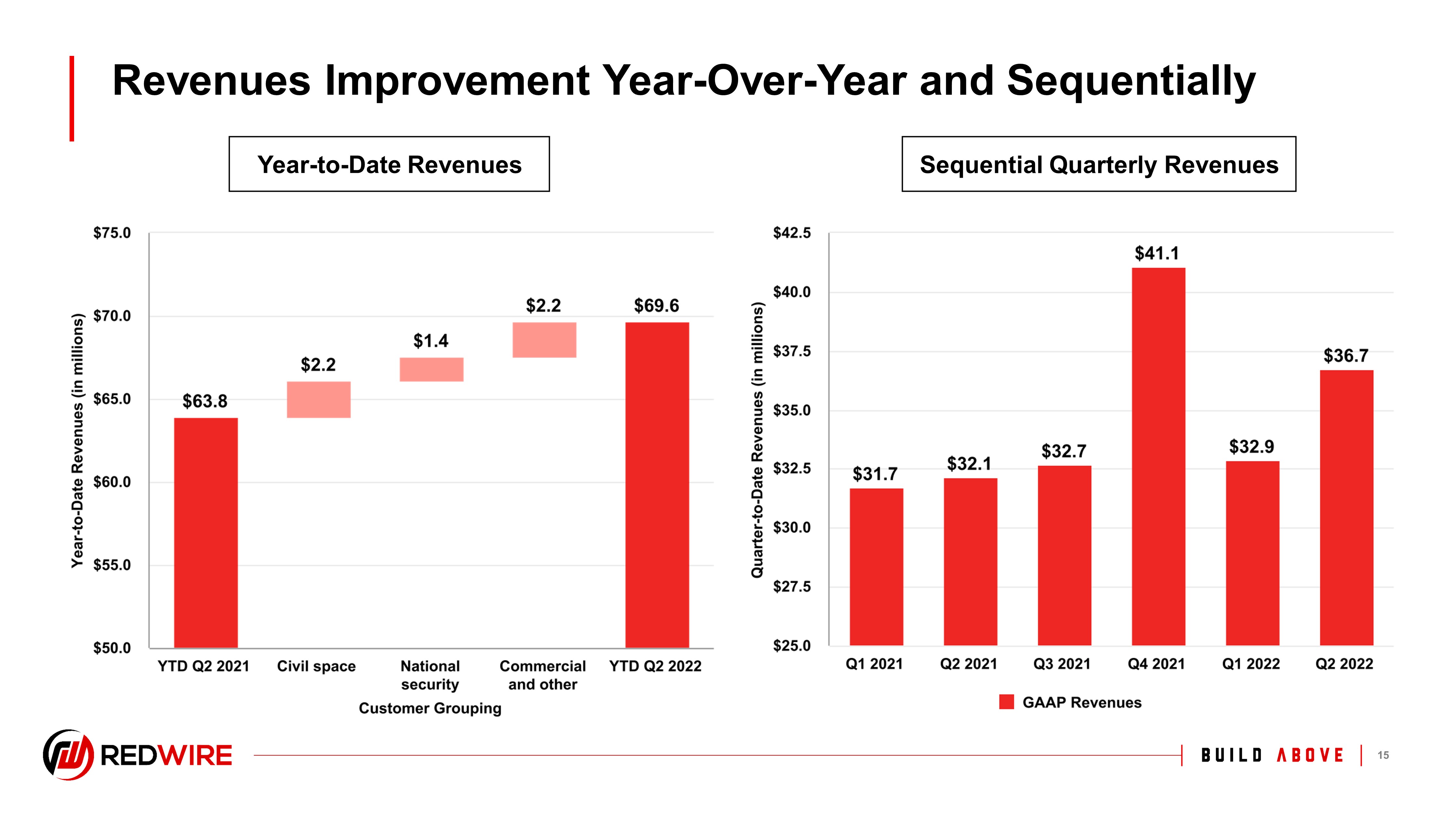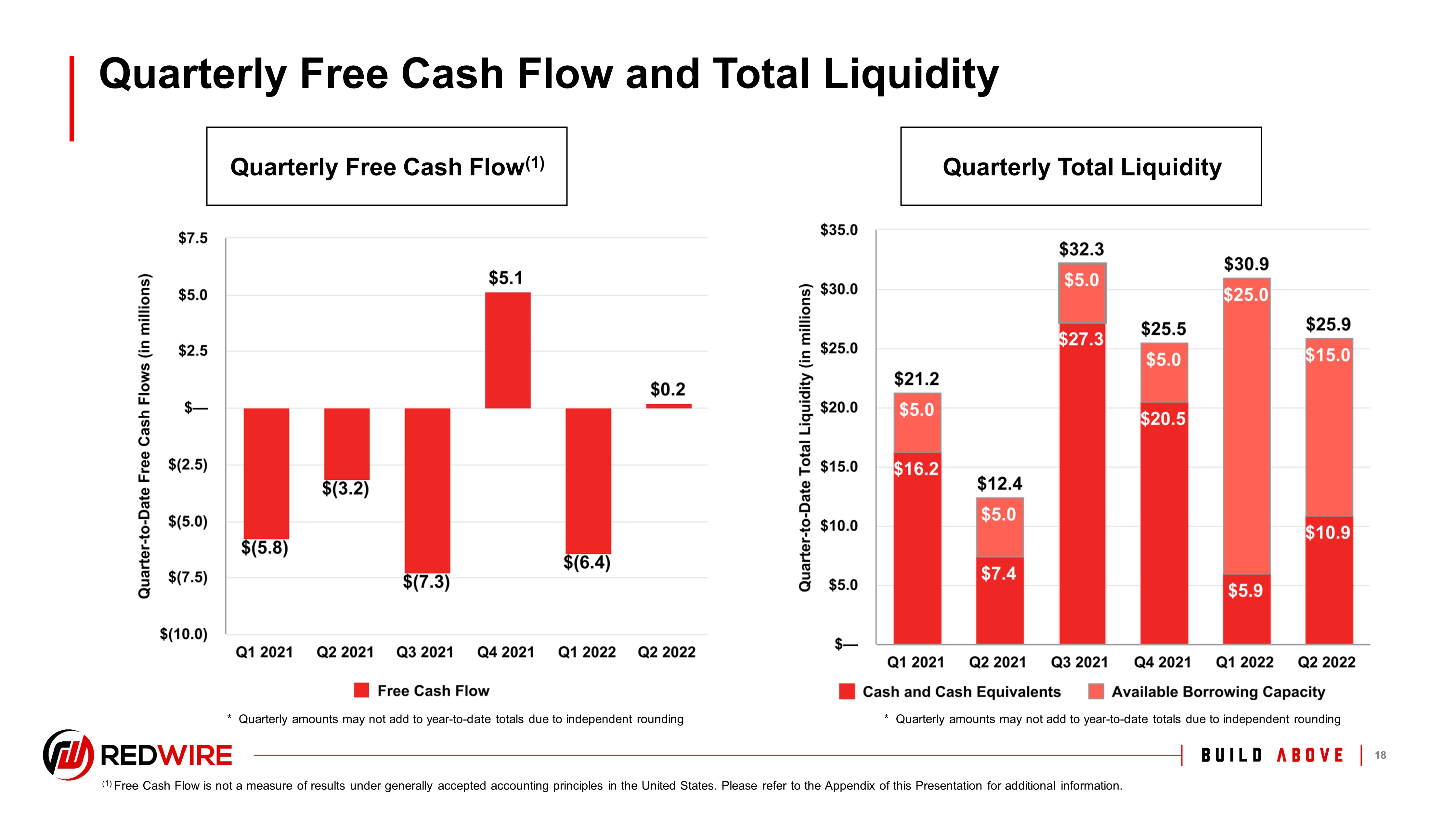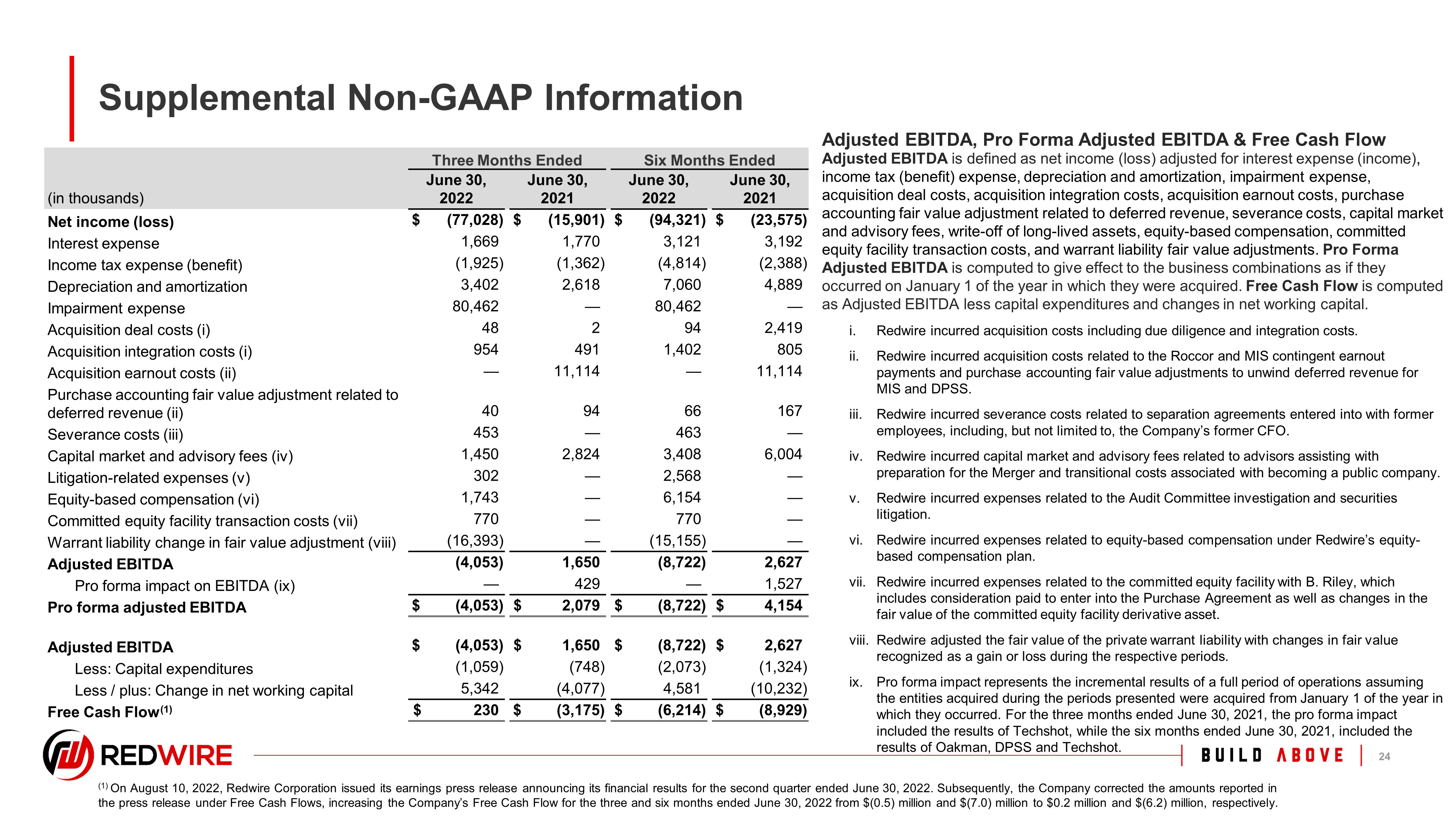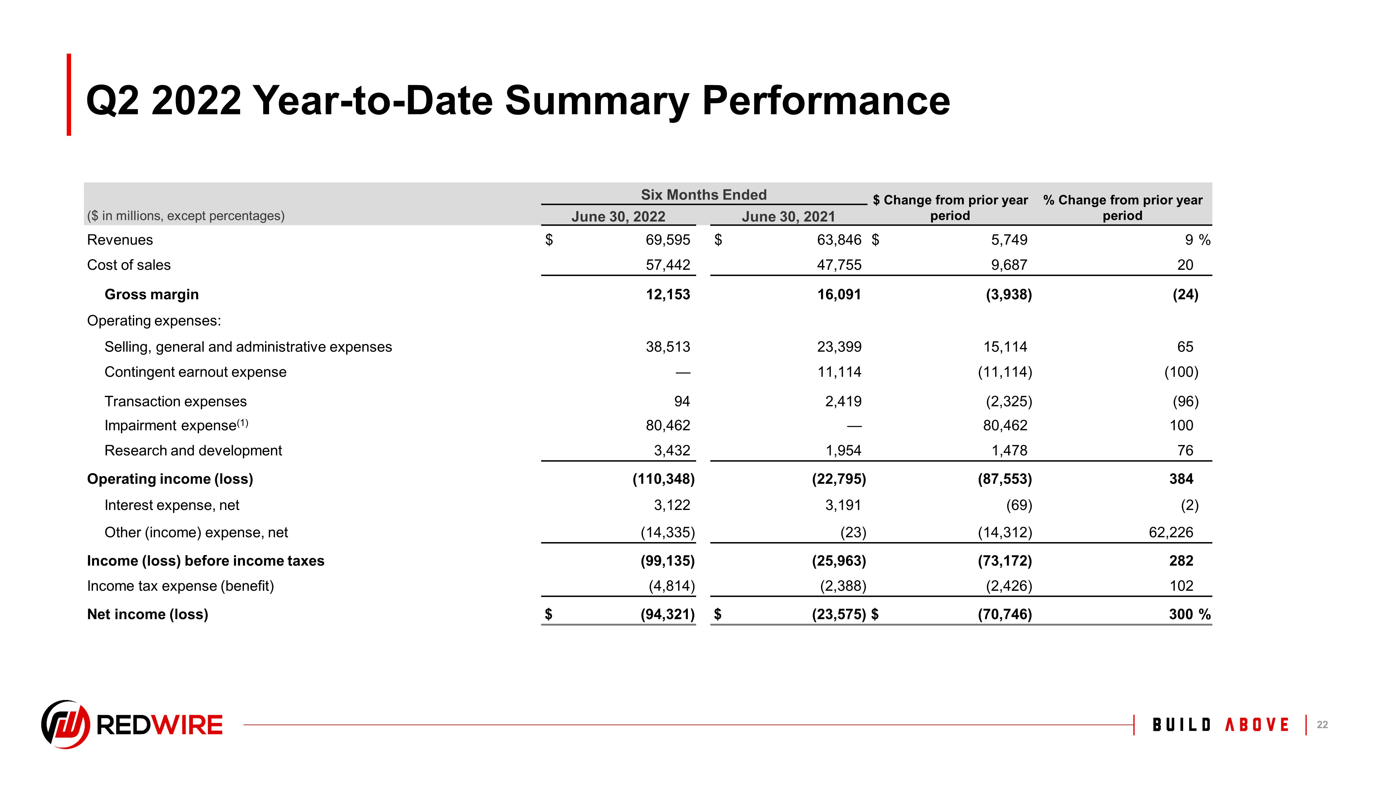 1. Insert Footnote Supplemental Non - GAAP Information 21 Adjusted EBITDA, Pro Forma Adjusted EBITDA & Free Cash Flow Three Months Ended Six Months Ended (in thousands) June 30, 2022 June 30, 2021 June 30, 2022 June 30, 2021 Net income (loss) $ (77,028) $ (15,901) $ (94,321) $ (23,575) Interest expense 1,669 1,770 3,121 3,192 Income tax expense (benefit) (1,925) (1,362) (4,814) (2,388) Depreciation and amortization 3,402 2,618 7,060 4,889 Impairment expense 80,462 — 80,462 — Acquisition deal costs (i) 48 2 94 2,419 Acquisition integration costs (i) 954 491 1,402 805 Acquisition earnout costs (ii) — 11,114 — 11,114 Purchase accounting fair value adjustment related to deferred revenue (ii) 40 94 66 167 Severance costs (iii) 453 — 463 — Capital market and advisory fees (iv) 1,450 2,824 3,408 6,004 Litigation - related expenses (v) 302 — 2,568 — Equity - based compensation (vi) 1,743 — 6,154 — Committed equity facility transaction costs (vii) 770 — 770 — Warrant liability change in fair value adjustment (viii) (16,393) — (15,155) — Adjusted EBITDA (4,053) 1,650 (8,722) 2,627 Pro forma impact on EBITDA (ix) — 429 — 1,527 Pro forma adjusted EBITDA $ (4,053) $ 2,079 $ (8,722) $ 4,154 Adjusted EBITDA $ (4,053) $ 1,650 $ (8,722) $ 2,627 Less: Capital expenditures (1,059) (748) (2,073) (1,324) Less / plus: Change in net working capital 5,342 (4,077) 4,581 (10,232) Free Cash Flow (1) $ 230 $ (3,175) $ (6, 214 ) $ (8,929) Adjusted EBITDA is defined as net income (loss) adjusted for interest expense (income) , income tax (benefit) expense, depreciation and amortization, impairment expense, acquisition deal costs, acquisition integration costs, acquisition earnout costs, purchase accounting fair value adjustment related to deferred revenue, severance costs, capital market and advisory fees, write - off of long - lived assets, equity - based compensation, committed equity facility transaction costs, and warrant liability fair value adjustments. Pro Forma Adjusted EBITDA is computed to give effect to the business combinations as if they occurred on January 1 of the year in which they were acquired. Free Cash Flow is computed as Adjusted EBITDA less capital expenditures and changes in net working capital. i. Redwire incurred acquisition costs including due diligence and integration costs. ii. Redwire incurred acquisition costs related to the Roccor and MIS contingent earnout payments and purchase accounting fair value adjustments to unwind deferred revenue for MIS and DPSS. iii. Redwire incurred severance costs related to separation agreements entered into with former employees, including, but not limited to, the Company’s former CFO. iv. Redwire incurred capital market and advisory fees related to advisors assisting with preparation for the Merger and transitional costs associated with becoming a public company. v. Redwire incurred expenses related to the Audit Committee investigation and securities litigation. vi. Redwire incurred expenses related to equity - based compensation under Redwire’s equity - based compensation plan. vii. Redwire incurred expenses related to the committed equity facility with B. Riley, which includes consideration paid to enter into the Purchase Agreement as well as changes in the fair value of the committed equity facility derivative asset. viii. Redwire adjusted the fair value of the private warrant liability with changes in fair value recognized as a gain or loss during the respective periods. ix. Pro forma impact represents the incremental results of a full period of operations assuming the entities acquired during the periods presented were acquired from January 1 of the year in which they occurred. For the three months ended June 30, 2021, the pro forma impact included the results of Techshot, while the six months ended June 30, 2021, included the results of Oakman, DPSS and Techshot. (1) On August 10, 2022, Redwire Corporation issued its earnings press release announcing its financial results for the second qua rte r ended June 30, 2022. Subsequently, the Company updated the amounts reported in the press release under Free Cash Flows, increasing the Company’s Free Cash Flow for the three and six months ended June 30, 202 2 from $(0.5) million and $(7.0) million to $0.2 million and $(6.2) million, respectively.