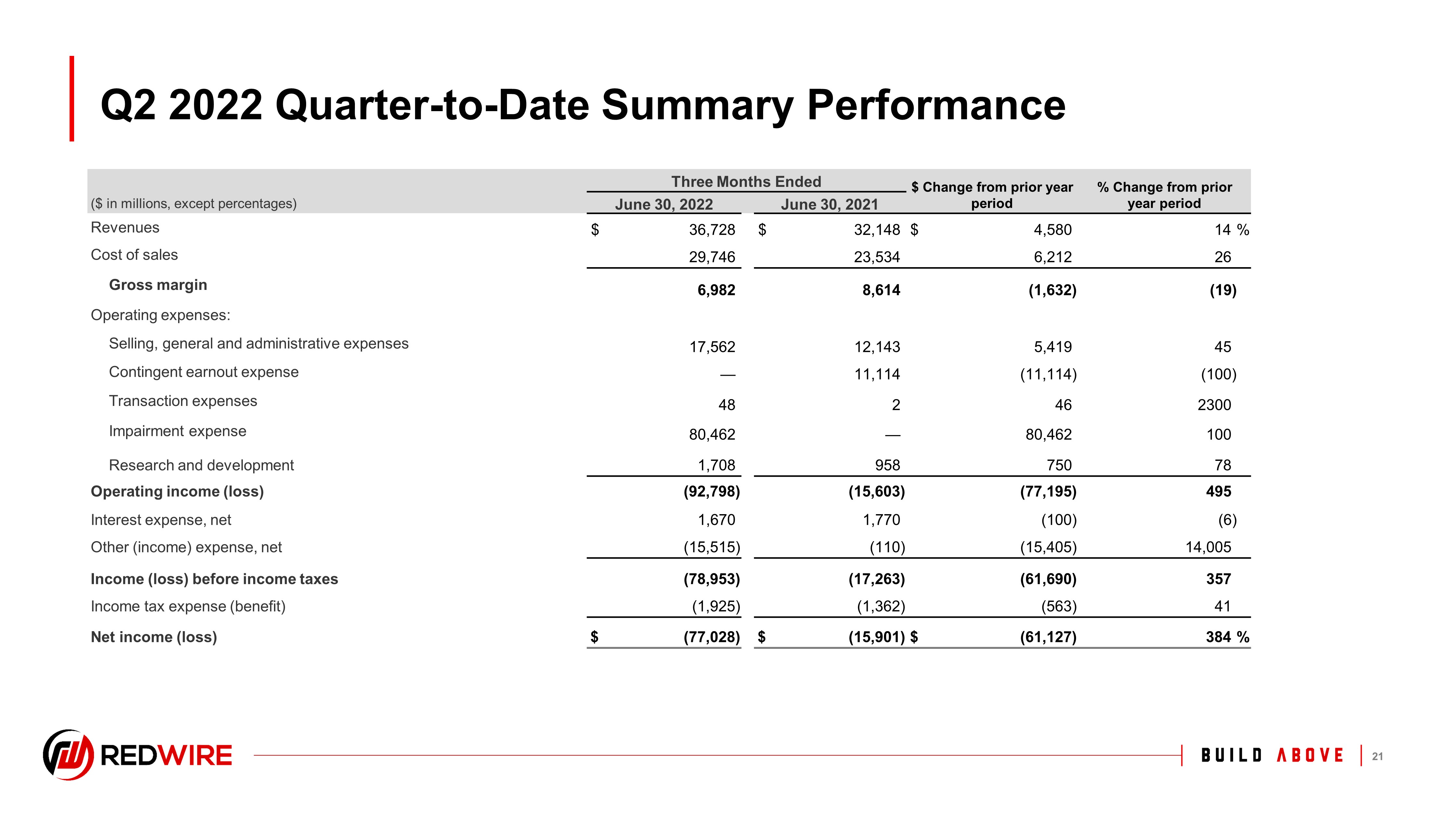 1. Insert Footnote Q2 2022 Year - to - Date Summary Performance 19 Six Months Ended $ Change from prior year period % Change from prior year period ($ in millions, except percentages) June 30, 2022 June 30, 2021 Revenues $ 69,595 $ 63,846 $ 5,749 9 % Cost of sales 57,442 47,755 9,687 20 Gross margin 12,153 16,091 (3,938) (24) Operating expenses: Selling, general and administrative expenses 38,513 23,399 15,114 65 Contingent earnout expense — 11,114 (11,114) (100) Transaction expenses 94 2,419 (2,325) (96) Impairment expense (1) 80,462 — 80,462 100 Research and development 3,432 1,954 1,478 76 Operating income (loss) (110,348) (22,795) (87,553) 384 Interest expense, net 3,122 3,191 (69) (2) Other (income) expense, net (14,335) (23) (14,312) 62,226 Income (loss) before income taxes (99,135) (25,963) (73,172) 282 Income tax expense (benefit) (4,814) (2,388) (2,426) 102 Net income (loss) $ (94,321) $ (23,575) $ (70,746) 300 %