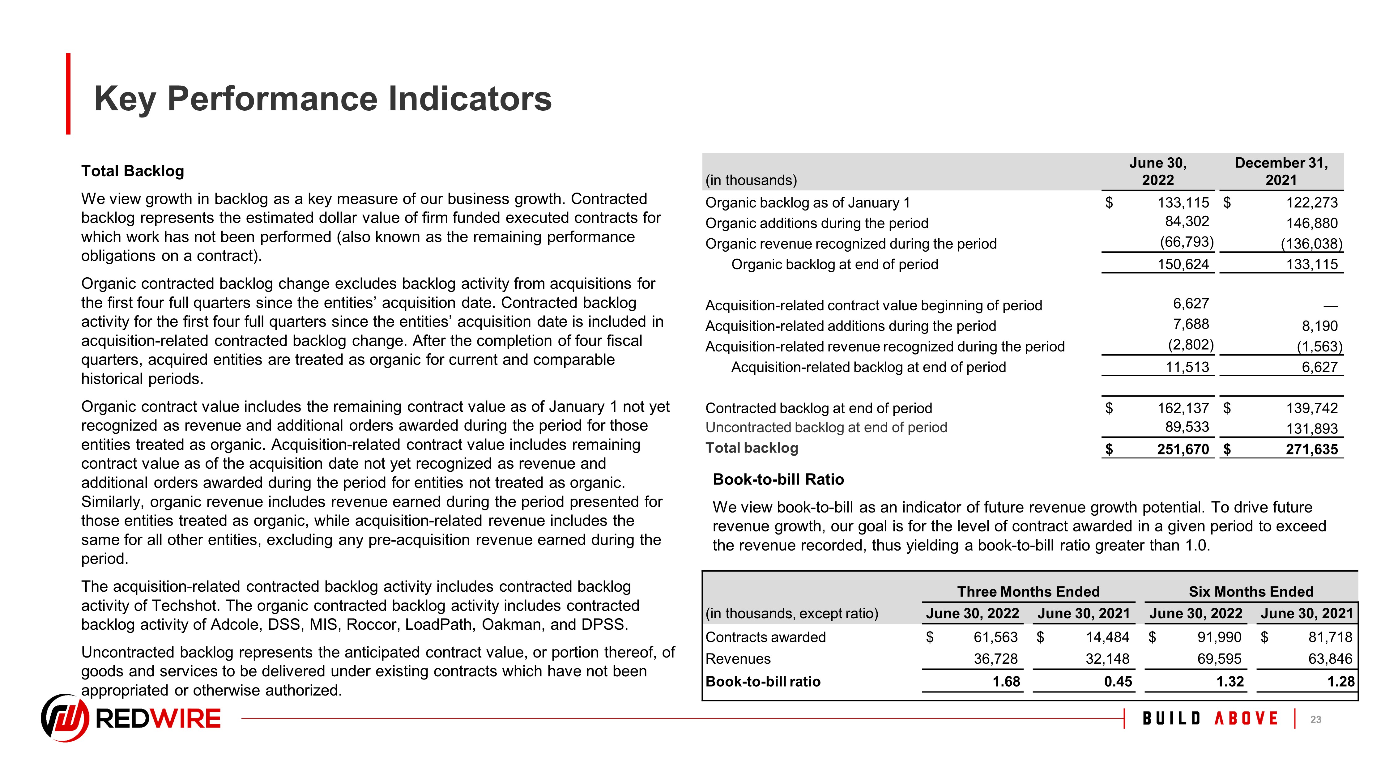 1. Insert Footnote Total Backlog We view growth in backlog as a key measure of our business growth. Contracted backlog represents the estimated dollar value of firm funded executed contracts for which work has not been performed (also known as the remaining performance obligations on a contract). Organic contracted backlog change excludes backlog activity from acquisitions for the first four full quarters since the entities’ acquisition date. Contracted backlog activity for the first four full quarters since the entities’ acquisition date is included in acquisition - related contracted backlog change. After the completion of four fiscal quarters, acquired entities are treated as organic for current and comparable historical periods. Organic contract value includes the remaining contract value as of January 1 not yet recognized as revenue and additional orders awarded during the period for those entities treated as organic. Acquisition - related contract value includes remaining contract value as of the acquisition date not yet recognized as revenue and additional orders awarded during the period for entities not treated as organic. Similarly, organic revenue includes revenue earned during the period presented for those entities treated as organic, while acquisition - related revenue includes the same for all other entities, excluding any pre - acquisition revenue earned during the period. The acquisition - related contracted backlog activity includes contracted backlog activity of Techshot. The organic contracted backlog activity includes contracted backlog activity of Adcole, DSS, MIS, Roccor, LoadPath, Oakman, and DPSS. Uncontracted backlog represents the anticipated contract value, or portion thereof, of goods and services to be delivered under existing contracts which have not been appropriated or otherwise authorized. Key Performance Indicators 20 (in thousands) June 30, 2022 December 31, 2021 Organic backlog as of January 1 $ 133,115 $ 122,273 Organic additions during the period 84,302 146,880 Organic revenue recognized during the period (66,793) (136,038) Organic backlog at end of period 150,624 133,115 Acquisition - related contract value beginning of period 6,627 — Acquisition - related additions during the period 7,688 8,190 Acquisition - related revenue recognized during the period (2,802) (1,563) Acquisition - related backlog at end of period 11,513 6,627 Contracted backlog at end of period $ 162,137 $ 139,742 Uncontracted backlog at end of period 89,533 131,893 Total backlog $ 251,670 $ 271,635 Three Months Ended Six Months Ended (in thousands, except ratio) June 30, 2022 June 30, 2021 June 30, 2022 June 30, 2021 Contracts awarded $ 61,563 $ 14,484 $ 91,990 $ 81,718 Revenues 36,728 32,148 69,595 63,846 Book - to - bill ratio 1.68 0.45 1.32 1.28 Book - to - bill Ratio We view book - to - bill as an indicator of future revenue growth potential. To drive future revenue growth, our goal is for the level of contract awarded in a given period to exceed the revenue recorded, thus yielding a book - to - bill ratio greater than 1.0.