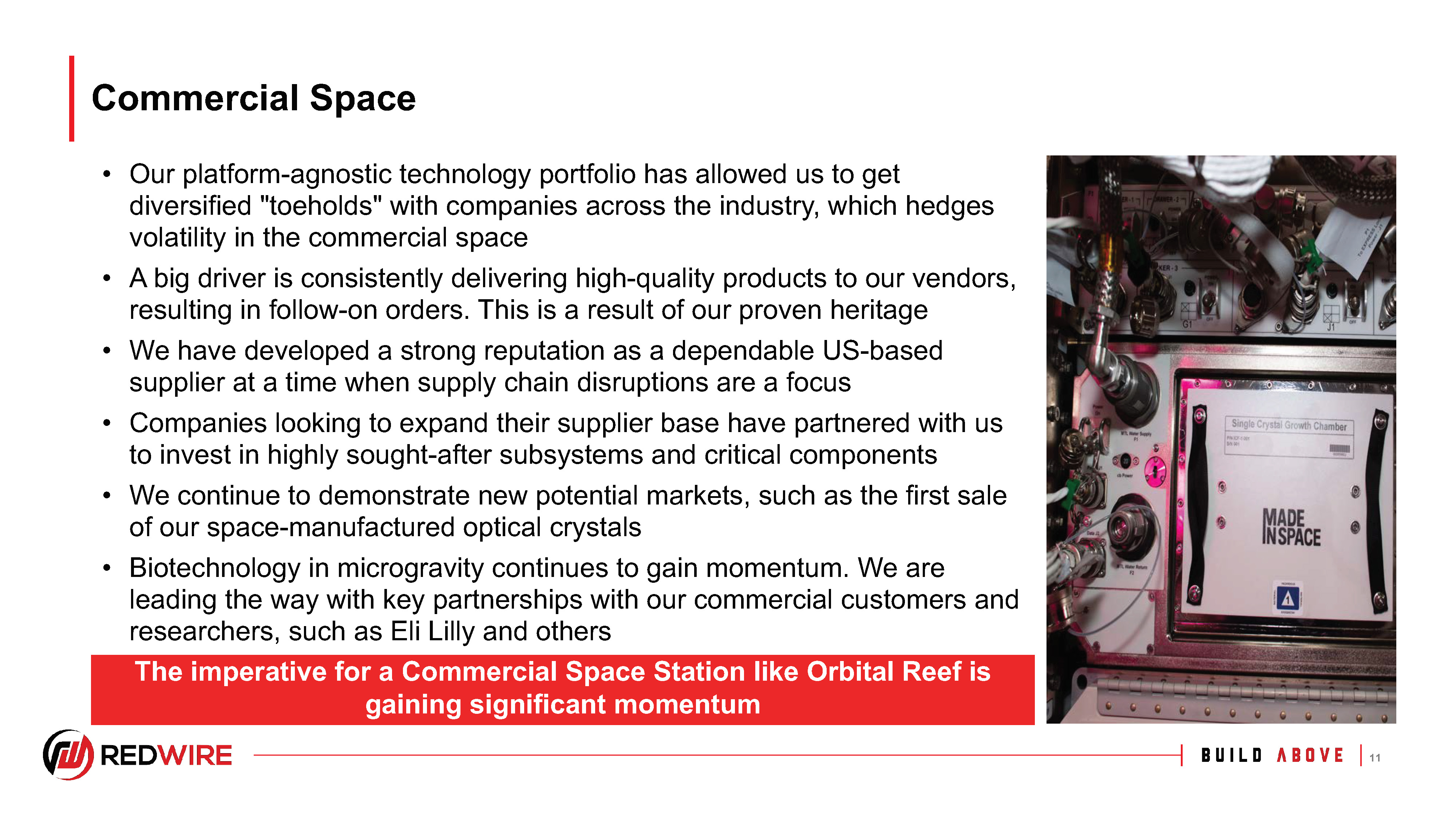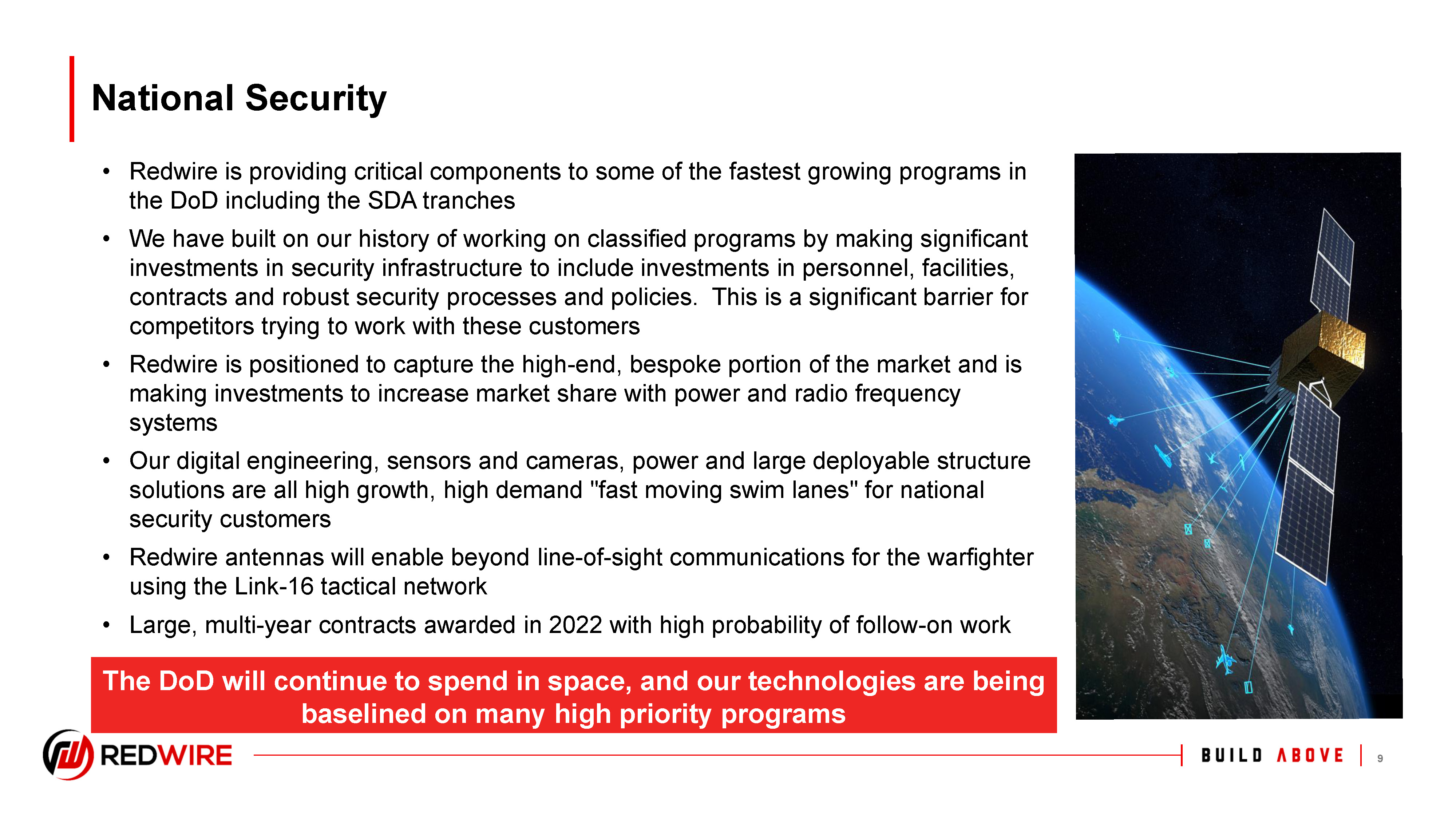 1. Insert Footnote 9 National Security • Redwire is providing critical components to some of the fastest growing programs in the DoD including the SDA tranches • We have built on our history of working on classified programs by making significant investments in security infrastructure to include investments in personnel, facilities, contracts and robust security processes and policies. This is a significant barrier for competitors trying to work with these customers • Redwire is positioned to capture the high-end, bespoke portion of the market and is making investments to increase market share with power and radio frequency systems • Our digital engineering, sensors and cameras, power and large deployable structure solutions are all high growth, high demand "fast moving swim lanes" for national security customers • Redwire antennas will enable beyond line-of-sight communications for the warfighter using the Link-16 tactical network • Large, multi-year contracts awarded in 2022 with high probability of follow-on work The DoD will continue to spend in space, and our technologies are being baselined on many high priority programs