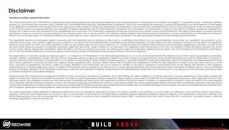 Disclaimer DisclaimersandOther Important Information This investor presentation (this “Presentation”) is provided for informational purposes only and has been prepared to assist interested parties in making their own evaluation with respect to a potential business combination between Redwire, LLC and Genesis Park Acquisition Corp. (“Genesis Park”) and related transactions (the “Potential Business Combination”) and for no other purpose. By reviewing or reading this Presentation, you will be deemed to have agreed to the obligations and restrictions set out below. Without the express prior written consent of Genesis Park and Redwire, this Presentation and any information contained within it may not be (i) reproduced (in whole or in part), (ii) copied at any time, (iii) used for any purpose other than your evaluation of Redwire, Genesis Park and the Potential Business Combination or (iv ) provided to any other person, in whole or in part, directly or indirectly, except your employees and advisors with a need to know who are advised of the confidentiality of the information. This Presentation supersedes and replaces all previous oral or written communications relating to the subject matter hereof. No person has been authorized to make any statement concerning Genesis Park or Redwire other than as will be set forth in the offering materials related to the Potential Business Combination, and any representation or information not contained therein may not be relied upon. An investment in Redwire should be made only after careful review of the information contained in the offering materials related to the Potential Business Combination. This Presentation and any oral statements made in connection with this Presentation do not constitute an offer to sell, or a solicitation of an offer to buy, or a recommendation to purchase, any securities in any jurisdiction, or the solicitation of any proxy, vote, consent or approval in any jurisdiction in connection with the Potential Business Combination or any related transactions, nor shall there be any sale, issuance or transfer of any securities in any jurisdiction where, or to any person to whom, such offer, solicitation or sale may be unlawful under the laws of such jurisdiction. This Presentation does not constitute either advice or a recommendation regarding any securities. Any offer to sell securities will be made only pursuant to a definitive Subscription Agreement and will be made in reliance on an exemption from registration under the Securities Act of 1933, as amended, for offers and sales of securities that do not involve a public offering. Genesis Park and Redwire reserve the right to withdraw or amend for any reason any offering and to reject any Subscription Agreement for any reason. The communication of this Presentation is restricted by law; it is not intended for distributionto, or use byany person inany jurisdictionwhere suchdistributionor use wouldbe contraryto local law or regulation. No representations or warranties, express or implied are given in, or in respect of, this Presentation. To the fullest extent permitted by law, in no circumstances will Genesis Park, Redwire or any of their respective subsidiaries, stockholders, members, affiliates, representatives, partners, directors, officers, employees, advisors or agents be responsible or liable for any direct, indirect or consequential loss or loss of profit arising from the use of this Presentation, its contents, its omissions, reliance on the information contained within it, or on opinions communicated in relation thereto or otherwise arising in connection therewith. Industry and market data used in this Presentation have been obtained from third- party industry publications and sources as well as from research reports prepared for other purposes. Neither Genesis Park nor Redwire has independently verified the data obtained from these sources and cannot assure you of the data’s accuracy or completeness. This data is subject to change. Recipients of this Presentation are not to construe its contents, or any prior or subsequent communications from or with Genesis Park, Redwire or their respective representatives as investment, legal or tax advice. In addition, this Presentation does not purport to be all-inclusive or to contain all of the information that may be required to make a full analysis of Redwire, Genesis Park or the Potential Business Combination. Recipients of this Presentation should each make their own evaluation of Redwire, Genesis Park and the Potential Business Combination and of the relevance and adequacy of the information and should make suchother investigations as theydeem necessary. Statements other than historical facts, including but not limited to those concerning (i) the Business Combination, (ii) the PIPE Offering, (iii) market conditions, or (iv) trends, consumer or customer preferences or other similar concepts with respect to Genesis Park, Redwire or the Business Combination, are based on current expectations, estimates, projections, targets, opinions and/or beliefs of Genesis Park and the applicable Companies or, when applicable, of one or more third-party sources. Such statements involve known and unknown risks, uncertainties and other factors, and undue reliance should not be placed thereon. In addition, no representation or warranty is made with respect to the reasonableness of any estimates, forecasts, illustrations, prospects or returns, which should be regarded as illustrative only, or that any profits will be realized. The metrics regarding select aspects of Genesis Park’s and Redwire's operations were selected by Genesis Park and Redwire on a subjective basis. Such metrics are provided solely for illustrative purposes to demonstrate elements of Genesis Park’s and Redwire's businesses, are incomplete, and are not necessarily indicative of Genesis Park’s and Companies’ performance or overall operations. There can be no assuranc