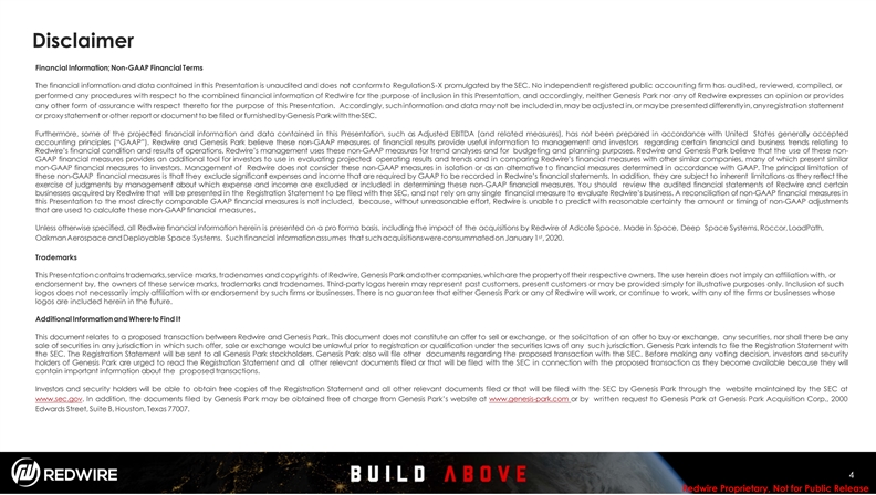 Disclaimer Forward-LookingStatements This Presentation contains certain forward-looking statements within the meaning of the federal securities laws with respect to the Potential Business Combination, including statements regarding the benefits of the Potential Business Combination, the anticipated timing of the Potential Business Combination, the products and services offered by Redwire and the markets in which it operates, and Redwire’s projected future results. These forward-looking statements generally are identified by the words “believe,” “project,” “expect,” “anticipate,” “estimate,” “intend,” “strategy,” “future,” “opportunity,” “plan,” “may,” “should,” “will,” “would,” “will be,” “will continue,” “will likely result,” and similar expressions. Forward looking statements are predictions, projections and other statements about future events that are based on current expectations and assumptions and, as a result, are subject to risks and uncertainties. Many factors could cause actual future events to differ materially from the forward-looking statements in this Presentation, including, but not limited to: (i) the occurrence of any event, change or other circumstances that could give rise to the termination of negotiations and any subsequent definitive agreements with respect to the Business Combination, (ii) the outcome of any legal proceedings that may be instituted against Genesis Park, the combined company or others following the announcement of the Business Combination and any definitive agreements with respect thereto, (iii) the inability to complete the Business Combination due to the failure to obtain approval of the shareholders of Genesis Park, to obtain financing to complete the Business Combination or to satisfy other conditions to closing, (iv) changes to the proposed structure of the Business Combination that may be required or appropriate as a result of applicable laws or regulations or as a condition to obtaining regulatory approval of the Business Combination, (v) the ability to meet stock exchange listing standards following the consummation of the Business Combination, (vi) the risk that the Business Combination disrupts current plans and operations of Redwire as a result of the announcement and consummation of the Business Combination, (vii) the ability to recognize the anticipated benefits of the Business Combination, which may be affected by, among other things, competition, the ability of the combined company to grow and manage growth profitably, maintain relationships with customers and suppliers and retain its management and key employees, (viii) costs related to the Business Combination, (ix) changes in applicable laws or regulations, (x) the possibility that Redwire may be adversely affected by other economic, business, and/or competitive factors, (xi) estimates of expenses and profitability, (xii) the limited operating history, and history of net losses, of Redwire, which may never achieve profitability, (xiii) the ability of Redwire to successfully develop their technology and services, (ivx) the ability to compete with existing or new companies that could cause downward pressure on prices, fewer customer orders, reduced margins, the inability to take advantage of new business opportunities, and the loss of market share, (xv) the ability to successfully select, execute or integrate future acquisitions into the business, which could result in material adverse effects to operations and financial conditions, (xvi) the possibility that the current pandemic outbreak of a novel strain of coronavirus, also known as COVID-19, may continue to adversely affect Redwire’s business, (xvii) the possibility of adverse publicity stemming from any incident involving Redwire or its competitors that could have a material adverse effect on Redwire’s business, financial condition and results of operations, (xviii) the ability to adapt to and satisfy customer demands in a timely and cost-effective manner, (xix) the ability to respond to commercial industry cycles in terms of cost structure, manufacturing capacity, and/or personnel needs, (xx) any delays in the development, design, engineering and manufacturing of Redwire’s products and services may adversely affect Redwire’s business, financial condition and results of operations, (xxi) the possibility that the market for in-space infrastructure services does not achieve the growth potential the Company expects or grows more slowly than the Company expects, and (xxii) other risks and uncertainties set forth in the section entitled “Risk Factors” and “Cautionary Note Regarding Forward-Looking Statements” in Genesis Park’s Quarterly Report on Form 10-Q for the quarter ended September 30, 2020. The foregoing list of factors is not exhaustive. You should carefully consider the foregoing factors and the other risks and uncertainties described in the documents filed by Genesis Park from time to time with the U.S. Securities and Exchange Commission (the “SEC”), including the “Risk Factors” section in the registration statement on Form S-4 and the proxy statement included therein (the “Registration Statement”) that Genesis Park intends to file relating to the Potential Business Combination and the “Risk Factors” section of other documents that Genesis Park files with the SEC from time to time. These filings identify and address other important risks and uncertainties that could cause actual events and results to differ materially from those contained in the forward-looking statements. Forward-looking statements speak only as of the date they are made. Readers are cautioned not to put undue reliance on forward-looking statements, and Genesis Park and Redwire assume no obligation and do not intend to update or revise these forward-looking statements, whether as a result of new information, future events, or otherwise. Neither Genesis 