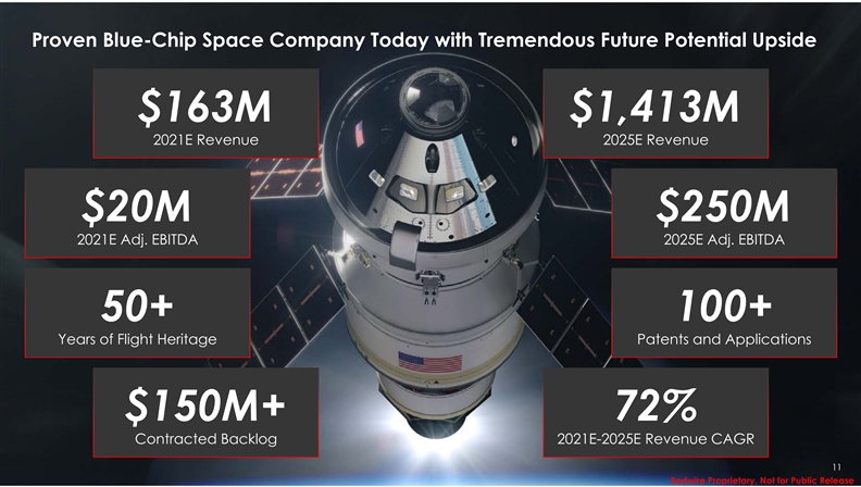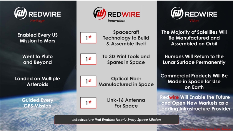 Heritage Innovation Vision Spacecraft The Majority of Satellites Will Enabled Every US st Technology to Build Be Manufactured and 1 Mission to Mars & Assemble Itself Assembled on Orbit Went to Pluto To 3D Print Tools and Humans Will Return to the st 1 and Beyond Spares in Space Lunar Surface Permanently Commercial Products Will Be Landed on Multiple Optical Fiber st Made in Space for Use 1 Asteroids Manufactured in Space on Earth Redwire Will Enable the Future Guided Every Link-16 Antenna st and Open New Markets as a 1 GPS Mission For Space Leading Infrastructure Provider Infrastructure that Enables Nearly Every Space Mission 10 Jefferies LLC / October 2020 Redwire Proprietary, Not for Public Release Redwire Proprietary, Not for Public ReleaseHeritage Innovation Vision Spacecraft The Majority of Satellites Will Enabled Every US st Technology to Build Be Manufactured and 1 Mission to Mars & Assemble Itself Assembled on Orbit Went to Pluto To 3D Print Tools and Humans Will Return to the st 1 and Beyond Spares in Space Lunar Surface Permanently Commercial Products Will Be Landed on Multiple Optical Fiber st Made in Space for Use 1 Asteroids Manufactured in Space on Earth Redwire Will Enable the Future Guided Every Link-16 Antenna st and Open New Markets as a 1 GPS Mission For Space Leading Infrastructure Provider Infrastructure that Enables Nearly Every Space Mission 10 Jefferies LLC / October 2020 Redwire Proprietary, Not for Public Release Redwire Proprietary, Not for Public Release