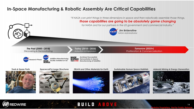 Redwire Delivers Infrastructure that Enables a Full Spectrum of Activity in Space Redwire Develops and Manufactures a Wide Array of Space … Enabling the Space Missions of Today and Tomorrow Infrastructure Solutions… Human Spaceflight Satellites International Space Station GPS Satellites Guidance Large Solar Navigation and Arrays Control Systems Additive Manufacturing of Spares and Advanced Deployable Booms, Space-Capable Microgravity Additive Materials Solar Arrays and Robotics Manufacturing Facilities Antennas Orion Spacecraft Archinaut Human-Rated Camera Additively Systems Manufactured Structures Robotic Assembly Arm Forward Growth in Key Strategic Focus Areas On-Orbit Servicing, LEO Assembly & Manufacturing Commercialization Integrated Next- Advanced In-Space Spacecraft Sensors and Digitally-Engineered Space Generation Spacecraft Camera Systems Components Spacecraft Domain Awareness Advanced Sensors and Components 13 Jefferies LLC / October 2020 Redwire Proprietary, Not for Public ReleaseRedwire Delivers Infrastructure that Enables a Full Spectrum of Activity in Space Redwire Develops and Manufactures a Wide Array of Space … Enabling the Space Missions of Today and Tomorrow Infrastructure Solutions… Human Spaceflight Satellites International Space Station GPS Satellites Guidance Large Solar Navigation and Arrays Control Systems Additive Manufacturing of Spares and Advanced Deployable Booms, Space-Capable Microgravity Additive Materials Solar Arrays and Robotics Manufacturing Facilities Antennas Orion Spacecraft Archinaut Human-Rated Camera Additively Systems Manufactured Structures Robotic Assembly Arm Forward Growth in Key Strategic Focus Areas On-Orbit Servicing, LEO Assembly & Manufacturing Commercialization Integrated Next- Advanced In-Space Spacecraft Sensors and Digitally-Engineered Space Generation Spacecraft Camera Systems Components Spacecraft Domain Awareness Advanced Sensors and Components 13 Jefferies LLC / October 2020 Redwire Proprietary, Not for Public Release
