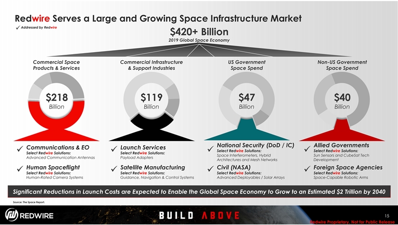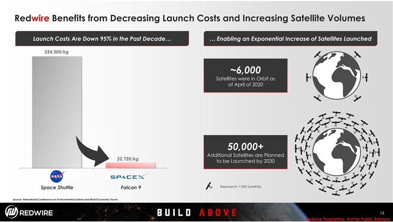 Redwire Serves a Large and Growing Space Infrastructure Market Addressed by Redwire ü $420+ Billion 2019 Global Space Economy Commercial Space Commercial Infrastructure US Government Non-US Government Products & Services & Support Industries Space Spend Space Spend $218 $119 $47 $40 Billion Billion Billion Billion National Security (DoD / IC) Allied Governments Communications & EO Launch Services Select Redwire Solutions: Select Redwire Solutions: üüüü Select Redwire Solutions: Select Redwire Solutions: Space Interferometers, Hybrid Sun Sensors and CubeSat Tech Advanced Communication Antennas Payload Adapters Architectures and Mesh Networks Development Human Spaceflight Satellite Manufacturing Civil (NASA) Foreign Space Agencies üüüü Select Redwire Solutions: Select Redwire Solutions: Select Redwire Solutions: Select Redwire Solutions: Human-Rated Camera Systems Guidance, Navigation & Control Systems Advanced Deployables / Solar Arrays Space-Capable Robotic Arms Significant Reductions in Launch Costs are Expected to Enable the Global Space Economy to Grow to an Estimated $2 Trillion by 2040 Source: The Space Report. 15 Jefferies LLC / October 2020 Redwire Proprietary, Not for Public ReleaseRedwire Serves a Large and Growing Space Infrastructure Market Addressed by Redwire ü $420+ Billion 2019 Global Space Economy Commercial Space Commercial Infrastructure US Government Non-US Government Products & Services & Support Industries Space Spend Space Spend $218 $119 $47 $40 Billion Billion Billion Billion National Security (DoD / IC) Allied Governments Communications & EO Launch Services Select Redwire Solutions: Select Redwire Solutions: üüüü Select Redwire Solutions: Select Redwire Solutions: Space Interferometers, Hybrid Sun Sensors and CubeSat Tech Advanced Communication Antennas Payload Adapters Architectures and Mesh Networks Development Human Spaceflight Satellite Manufacturing Civil (NASA) Foreign Space Agencies üüüü Select Redwire Solutions: Select Redwire Solutions: Select Redwire Solutions: Select Redwire Solutions: Human-Rated Camera Systems Guidance, Navigation & Control Systems Advanced Deployables / Solar Arrays Space-Capable Robotic Arms Significant Reductions in Launch Costs are Expected to Enable the Global Space Economy to Grow to an Estimated $2 Trillion by 2040 Source: The Space Report. 15 Jefferies LLC / October 2020 Redwire Proprietary, Not for Public Release