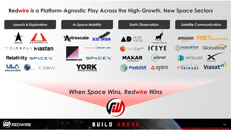 Redwire’s Industry-Leading Flight Heritage Differentiates It from New Space Peers l New Horizon Years of Flight Heritage Satellite Missions Flown 150+ 50+ Pluto Sun l Deep Space 1 l Exploration Roverl Reconnaissance l Solar Probe Plus Orbiter l Global Surveyor l STEREO l Science Lab l Odyssey l Maven l Pathfinder l Graill LRO/LCRO Mars SS l Lunar Saturn Prospector Moon Jupiter l Cassini-Huygens l Galileol JUNO Low Earth Orbit Medium Earth Orbit Beyond GEO Earth l GPSl Van Allenl Chandral MAP l GEO-EYEl Landsat l Themisl ACE l IRISl Radarsat Venus Geosynchronous Earth Orbit l ST5l WIND l ISSl SORCE Mercury l AEHFl SOO l IKAROSl ISTP/SOHOl MMS l Jasonl TRACE l GOESl SXI l Magellan l Bepi Columbo l SBIRSl Commercial l Planet C l Messenger Satellites 18 Jefferies LLC / October 2020 Redwire Proprietary, Not for Public ReleaseRedwire’s Industry-Leading Flight Heritage Differentiates It from New Space Peers l New Horizon Years of Flight Heritage Satellite Missions Flown 150+ 50+ Pluto Sun l Deep Space 1 l Exploration Roverl Reconnaissance l Solar Probe Plus Orbiter l Global Surveyor l STEREO l Science Lab l Odyssey l Maven l Pathfinder l Graill LRO/LCRO Mars SS l Lunar Saturn Prospector Moon Jupiter l Cassini-Huygens l Galileol JUNO Low Earth Orbit Medium Earth Orbit Beyond GEO Earth l GPSl Van Allenl Chandral MAP l GEO-EYEl Landsat l Themisl ACE l IRISl Radarsat Venus Geosynchronous Earth Orbit l ST5l WIND l ISSl SORCE Mercury l AEHFl SOO l IKAROSl ISTP/SOHOl MMS l Jasonl TRACE l GOESl SXI l Magellan l Bepi Columbo l SBIRSl Commercial l Planet C l Messenger Satellites 18 Jefferies LLC / October 2020 Redwire Proprietary, Not for Public Release