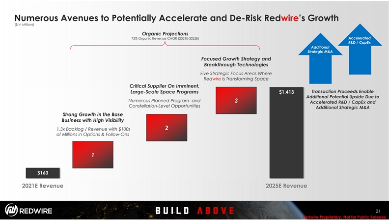 Significant Opportunity to Continue Consolidating a Fragmented Space Market Redwire Typically Retains Target Company Founders and Leverages Their Expertise and Relationships to Bolster Leadership Ranks and Expand the M&A Pipeline Mar 2020 Jun 2020 Jun 2020 Oct 2020 Dec 2020 Jan 2021 Feb 2021 Targets for Deployment of Public Currency / Transaction Proceeds Targets Key Products and Solutions Est. Rev 5 MBSE & Other Engineering Services $80+ Million 2 Reflectors & Deployable Structures $75+ Million 3 Spacecraft & Human Spaceflight Systems $60+ Million 3 Software & Software-Defined Products $55+ Million Proprietary Proprietary Deals Deals Sourced Sourced Through Increa Through Increasin sing g De Depth pth o off In Indu dustry stry R Re elatio lation nsh ships ips 2 Communications Hardware $30+ Million 2 Advanced Robotics & Manufacturing $30+ Million Total $330+ Million üü üü Fragmented Landscape Successful Track Record Buyer of Choice Execution Excellence Opportunity to consolidate tech- Extensive M&A execution and Sole pure-play new space Seasoned management and deal teams enabled, emerging space companies integration experience infrastructure company of scale with decades of operational experience 20 Jefferies LLC / October 2020 Redwire Proprietary, Not for Public ReleaseSignificant Opportunity to Continue Consolidating a Fragmented Space Market Redwire Typically Retains Target Company Founders and Leverages Their Expertise and Relationships to Bolster Leadership Ranks and Expand the M&A Pipeline Mar 2020 Jun 2020 Jun 2020 Oct 2020 Dec 2020 Jan 2021 Feb 2021 Targets for Deployment of Public Currency / Transaction Proceeds Targets Key Products and Solutions Est. Rev 5 MBSE & Other Engineering Services $80+ Million 2 Reflectors & Deployable Structures $75+ Million 3 Spacecraft & Human Spaceflight Systems $60+ Million 3 Software & Software-Defined Products $55+ Million Proprietary Proprietary Deals Deals Sourced Sourced Through Increa Through Increasin sing g De Depth pth o off In Indu dustry stry R Re elatio lation nsh ships ips 2 Communications Hardware $30+ Million 2 Advanced Robotics & Manufacturing $30+ Million Total $330+ Million üü üü Fragmented Landscape Successful Track Record Buyer of Choice Execution Excellence Opportunity to consolidate tech- Extensive M&A execution and Sole pure-play new space Seasoned management and deal teams enabled, emerging space companies integration experience infrastructure company of scale with decades of operational experience 20 Jefferies LLC / October 2020 Redwire Proprietary, Not for Public Release