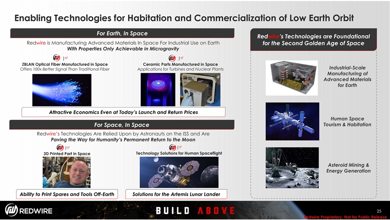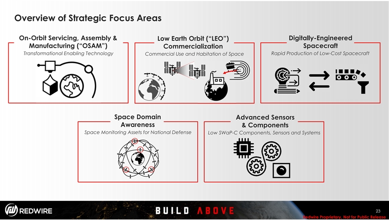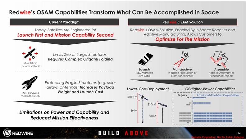Overview of Strategic Focus Areas On-Orbit Servicing, Assembly & Digitally-Engineered Low Earth Orbit (“LEO”) Manufacturing (“OSAM”) Spacecraft Commercialization Transformational Enabling Technology Rapid Production of Low-Cost Spacecraft Commercial Use and Habitation of Space Space Domain Advanced Sensors Awareness & Components Space Monitoring Assets for National Defense Low SWaP-C Components, Sensors and Systems 23 Jefferies LLC / October 2020 Redwire Proprietary, Not for Public ReleaseOverview of Strategic Focus Areas On-Orbit Servicing, Assembly & Digitally-Engineered Low Earth Orbit (“LEO”) Manufacturing (“OSAM”) Spacecraft Commercialization Transformational Enabling Technology Rapid Production of Low-Cost Spacecraft Commercial Use and Habitation of Space Space Domain Advanced Sensors Awareness & Components Space Monitoring Assets for National Defense Low SWaP-C Components, Sensors and Systems 23 Jefferies LLC / October 2020 Redwire Proprietary, Not for Public Release
