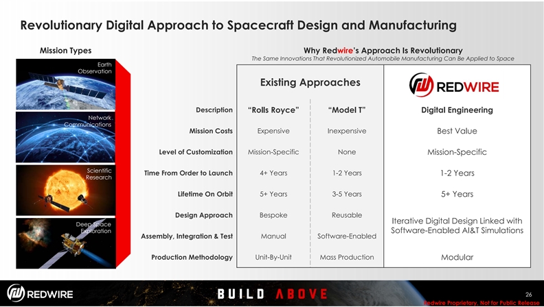 Revolutionary Digital Approach to Spacecraft Design and Manufacturing Mission Types Why Redwire’s Approach Is Revolutionary The Same Innovations That Revolutionized Automobile Manufacturing Can Be Applied to Space Earth Observation Existing Approaches Description “Rolls Royce” “Model T” Digital Engineering Network Communications Expensive Inexpensive Mission Costs Best Value Level of Customization Mission-Specific None Mission-Specific Scientific Time From Order to Launch 4+ Years 1-2 Years 1-2 Years Research Lifetime On Orbit 5+ Years 3-5 Years 5+ Years Design Approach Bespoke Reusable Iterative Digital Design Linked with Deep Space Exploration Software-Enabled AI&T Simulations Assembly, Integration & Test Manual Software-Enabled Production Methodology Unit-By-Unit Mass Production Modular 26 Jefferies LLC / October 2020 Redwire Proprietary, Not for Public ReleaseRevolutionary Digital Approach to Spacecraft Design and Manufacturing Mission Types Why Redwire’s Approach Is Revolutionary The Same Innovations That Revolutionized Automobile Manufacturing Can Be Applied to Space Earth Observation Existing Approaches Description “Rolls Royce” “Model T” Digital Engineering Network Communications Expensive Inexpensive Mission Costs Best Value Level of Customization Mission-Specific None Mission-Specific Scientific Time From Order to Launch 4+ Years 1-2 Years 1-2 Years Research Lifetime On Orbit 5+ Years 3-5 Years 5+ Years Design Approach Bespoke Reusable Iterative Digital Design Linked with Deep Space Exploration Software-Enabled AI&T Simulations Assembly, Integration & Test Manual Software-Enabled Production Methodology Unit-By-Unit Mass Production Modular 26 Jefferies LLC / October 2020 Redwire Proprietary, Not for Public Release