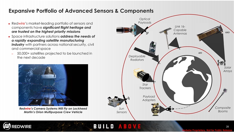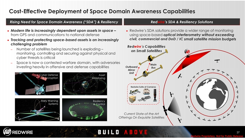 Cost-Effective Deployment of Space Domain Awareness Capabilities Rising Need for Space Domain Awareness (“SDA”) & Resiliency Redwire’s SDA & Resiliency Solutions l Modern life is increasingly dependent upon assets in space –l Redwire’s SDA solutions provide a wider range of monitoring from GPS and communications to national defense using space-based optical interferometry without exceeding civil, commercial and DoD / IC small satellite mission budgets l Tracking and protecting space-based assets is an increasingly challenging problem Redwire’s Capabilities ─ Number of satellites being launched is exploding – on Small Satellites monitoring, controlling and securing against physical and cyber threats is critical ─ Space is now a contested warfare domain, with adversaries Main Outboard investing heavily in offensive and defense capabilities Bus Mirror Unit Cyber Defense Asset & Encryption Monitoring Redwire Suite of Cameras Early Warning Resiliency Systems & Control Current State-of-the-Art Offerings On Exquisite Satellites 27 Jefferies LLC / October 2020 Redwire Proprietary, Not for Public ReleaseCost-Effective Deployment of Space Domain Awareness Capabilities Rising Need for Space Domain Awareness (“SDA”) & Resiliency Redwire’s SDA & Resiliency Solutions l Modern life is increasingly dependent upon assets in space –l Redwire’s SDA solutions provide a wider range of monitoring from GPS and communications to national defense using space-based optical interferometry without exceeding civil, commercial and DoD / IC small satellite mission budgets l Tracking and protecting space-based assets is an increasingly challenging problem Redwire’s Capabilities ─ Number of satellites being launched is exploding – on Small Satellites monitoring, controlling and securing against physical and cyber threats is critical ─ Space is now a contested warfare domain, with adversaries Main Outboard investing heavily in offensive and defense capabilities Bus Mirror Unit Cyber Defense Asset & Encryption Monitoring Redwire Suite of Cameras Early Warning Resiliency Systems & Control Current State-of-the-Art Offerings On Exquisite Satellites 27 Jefferies LLC / October 2020 Redwire Proprietary, Not for Public Release