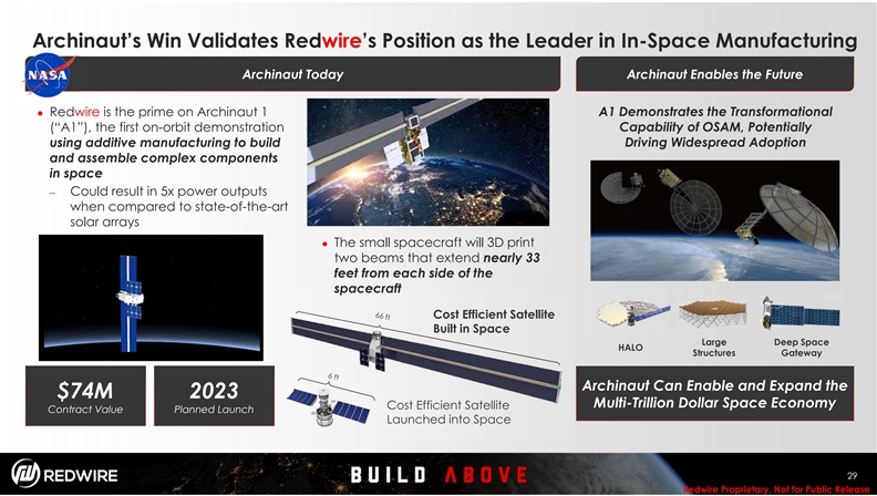 Expansive Portfolio of Advanced Sensors & Components Optical Payloads l Redwire’s market-leading portfolio of sensors and Link 16- components have significant flight heritage and Capable are trusted on the highest priority missions GEO Antennas l Space infrastructure solutions address the needs of a rapidly expanding satellite manufacturing industry with partners across national security, civil and commercial space LEO ─ 50,000+ satellites projected to be launched in Deployable the next decade Radiators Solar Arrays Star Trackers Payload Adapters Composite Redwire’s Camera Systems Will Fly on Lockheed Sun Booms Martin’s Orion Multipurpose Crew Vehicle Sensors 28 Jefferies LLC / October 2020 Redwire Proprietary, Not for Public ReleaseExpansive Portfolio of Advanced Sensors & Components Optical Payloads l Redwire’s market-leading portfolio of sensors and Link 16- components have significant flight heritage and Capable are trusted on the highest priority missions GEO Antennas l Space infrastructure solutions address the needs of a rapidly expanding satellite manufacturing industry with partners across national security, civil and commercial space LEO ─ 50,000+ satellites projected to be launched in Deployable the next decade Radiators Solar Arrays Star Trackers Payload Adapters Composite Redwire’s Camera Systems Will Fly on Lockheed Sun Booms Martin’s Orion Multipurpose Crew Vehicle Sensors 28 Jefferies LLC / October 2020 Redwire Proprietary, Not for Public Release