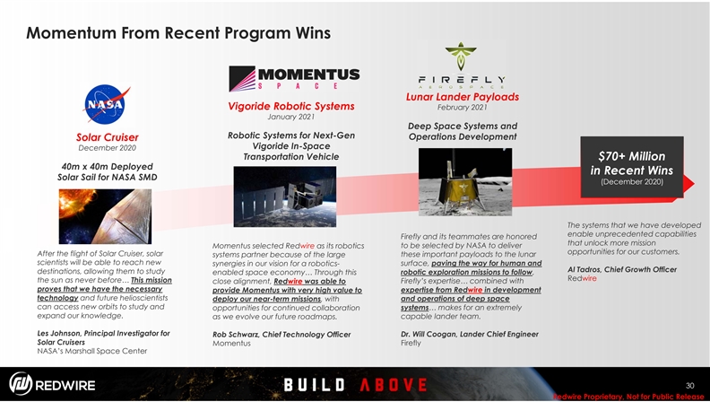 Momentum From Recent Program Wins Lunar Lander Payloads Vigoride Robotic Systems February 2021 January 2021 Deep Space Systems and Robotic Systems for Next-Gen Operations Development Solar Cruiser Vigoride In-Space December 2020 Transportation Vehicle $70+ Million 40m x 40m Deployed in Recent Wins Solar Sail for NASA SMD (December 2020) The systems that we have developed enable unprecedented capabilities Firefly and its teammates are honored that unlock more mission Momentus selected Redwire as its robotics to be selected by NASA to deliver opportunities for our customers. After the flight of Solar Cruiser, solar these important payloads to the lunar systems partner because of the large scientists will be able to reach new surface, paving the way for human and synergies in our vision for a robotics- Al Tadros, Chief Growth Officer destinations, allowing them to study robotic exploration missions to follow. enabled space economy… Through this Redwire the sun as never before… This mission Firefly’s expertise… combined with close alignment, Redwire was able to proves that we have the necessary provide Momentus with very high value to expertise from Redwire in development technology and future helioscientists deploy our near-term missions, with and operations of deep space can access new orbits to study and opportunities for continued collaboration systems… makes for an extremely expand our knowledge. as we evolve our future roadmaps. capable lander team. Les Johnson, Principal Investigator for Rob Schwarz, Chief Technology Officer Dr. Will Coogan, Lander Chief Engineer Solar Cruisers Firefly Momentus NASA’s Marshall Space Center 30 Jefferies LLC / October 2020 Redwire Proprietary, Not for Public ReleaseMomentum From Recent Program Wins Lunar Lander Payloads Vigoride Robotic Systems February 2021 January 2021 Deep Space Systems and Robotic Systems for Next-Gen Operations Development Solar Cruiser Vigoride In-Space December 2020 Transportation Vehicle $70+ Million 40m x 40m Deployed in Recent Wins Solar Sail for NASA SMD (December 2020) The systems that we have developed enable unprecedented capabilities Firefly and its teammates are honored that unlock more mission Momentus selected Redwire as its robotics to be selected by NASA to deliver opportunities for our customers. After the flight of Solar Cruiser, solar these important payloads to the lunar systems partner because of the large scientists will be able to reach new surface, paving the way for human and synergies in our vision for a robotics- Al Tadros, Chief Growth Officer destinations, allowing them to study robotic exploration missions to follow. enabled space economy… Through this Redwire the sun as never before… This mission Firefly’s expertise… combined with close alignment, Redwire was able to proves that we have the necessary provide Momentus with very high value to expertise from Redwire in development technology and future helioscientists deploy our near-term missions, with and operations of deep space can access new orbits to study and opportunities for continued collaboration systems… makes for an extremely expand our knowledge. as we evolve our future roadmaps. capable lander team. Les Johnson, Principal Investigator for Rob Schwarz, Chief Technology Officer Dr. Will Coogan, Lander Chief Engineer Solar Cruisers Firefly Momentus NASA’s Marshall Space Center 30 Jefferies LLC / October 2020 Redwire Proprietary, Not for Public Release