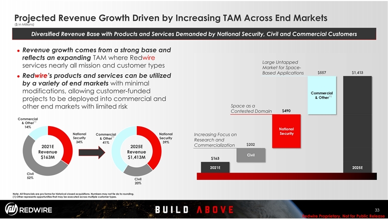 Robust Backlog Drives Near-Term Revenue Momentum $150+ Million $23+ Billion l High visibility into near-term revenue streams Contracted Backlog 2021E-2025E Unfactored Pipeline l 85%+ of 2021E revenue is in backlog or on programs where Redwire is the incumbent provider 72% $163 Million $1,413 Million CAGR 2021E Revenue 2025E Revenue 89% $20 Million $250 Million CAGR 2021E Adj. EBITDA 2025E Adj. EBITDA $163 Million 2021E Revenue 85% $17 Million $195 Million CAGR 2021E Free Cash Flow 2025E Free Cash Flow Projections Are Based on a Bottoms-Up, Probability-Weighted Pipeline with Conservative Win Rate Assumptions Well Below Recent Performance Note: All financials are pro forma for historical closed acquisitions. 32 Jefferies LLC / October 2020 Redwire Proprietary, Not for Public ReleaseRobust Backlog Drives Near-Term Revenue Momentum $150+ Million $23+ Billion l High visibility into near-term revenue streams Contracted Backlog 2021E-2025E Unfactored Pipeline l 85%+ of 2021E revenue is in backlog or on programs where Redwire is the incumbent provider 72% $163 Million $1,413 Million CAGR 2021E Revenue 2025E Revenue 89% $20 Million $250 Million CAGR 2021E Adj. EBITDA 2025E Adj. EBITDA $163 Million 2021E Revenue 85% $17 Million $195 Million CAGR 2021E Free Cash Flow 2025E Free Cash Flow Projections Are Based on a Bottoms-Up, Probability-Weighted Pipeline with Conservative Win Rate Assumptions Well Below Recent Performance Note: All financials are pro forma for historical closed acquisitions. 32 Jefferies LLC / October 2020 Redwire Proprietary, Not for Public Release
