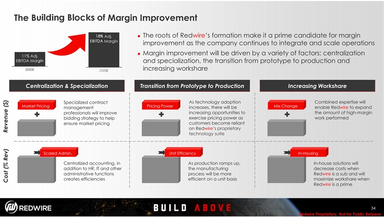 The Building Blocks of Margin Improvement l The roots of Redwire’s formation make it a prime candidate for margin 18% A 18% Ad dj. j. EBI EBIT TD DA A M Ma argin rgin improvement as the company continues to integrate and scale operations l Margin improvement will be driven by a variety of factors: centralization 11% A 11% Ad dj. j. EBI EBIT TD DA A M Ma argin rgin and specialization, the transition from prototype to production and 2020E increasing workshare 2025E Centralization & Specialization Transition from Prototype to Production Increasing Workshare As technology adoption Combined expertise will Specialized contract Market Pricing Pricing Power Mix Change management increases, there will be enable Redwire to expand professionals will improve increasing opportunities to the amount of high-margin bidding strategy to help exercise pricing power as work performed ensure market pricing customers become reliant on Redwire’s proprietary technology suite Scaled Admin. Unit Efficiency In-Housing Centralized accounting, in As production ramps up, In-house solutions will addition to HR, IT and other the manufacturing decrease costs when administrative functions process will be more Redwire is a sub and will creates efficiencies efficient on a unit basis maximize workshare when Redwire is a prime 34 Jefferies LLC / October 2020 29 Redwire Proprietary, Not for Public Release Cost (% Rev) Revenue ($)The Building Blocks of Margin Improvement l The roots of Redwire’s formation make it a prime candidate for margin 18% A 18% Ad dj. j. EBI EBIT TD DA A M Ma argin rgin improvement as the company continues to integrate and scale operations l Margin improvement will be driven by a variety of factors: centralization 11% A 11% Ad dj. j. EBI EBIT TD DA A M Ma argin rgin and specialization, the transition from prototype to production and 2020E increasing workshare 2025E Centralization & Specialization Transition from Prototype to Production Increasing Workshare As technology adoption Combined expertise will Specialized contract Market Pricing Pricing Power Mix Change management increases, there will be enable Redwire to expand professionals will improve increasing opportunities to the amount of high-margin bidding strategy to help exercise pricing power as work performed ensure market pricing customers become reliant on Redwire’s proprietary technology suite Scaled Admin. Unit Efficiency In-Housing Centralized accounting, in As production ramps up, In-house solutions will addition to HR, IT and other the manufacturing decrease costs when administrative functions process will be more Redwire is a sub and will creates efficiencies efficient on a unit basis maximize workshare when Redwire is a prime 34 Jefferies LLC / October 2020 29 Redwire Proprietary, Not for Public Release Cost (% Rev) Revenue ($)