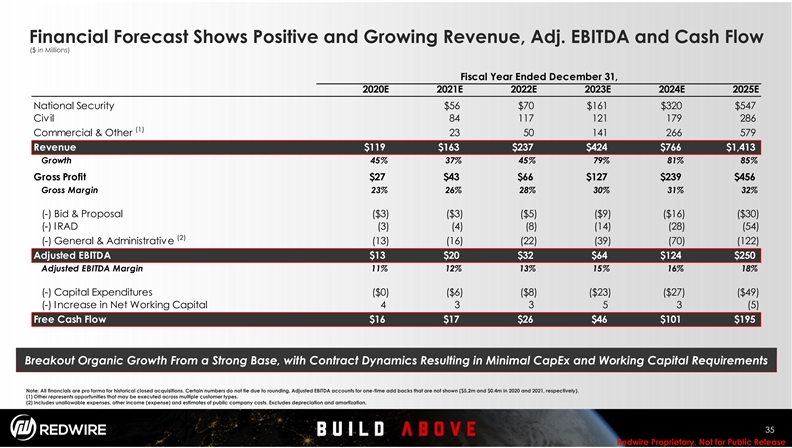 Financial Forecast Shows Positive and Growing Revenue, Adj. EBITDA and Cash Flow ($ in Millions) Fiscal Year Ended December 31, 2020E 2021E 2022E 2023E 2024E 2025E National Security $56 $70 $161 $320 $547 Civil 84 117 121 179 286 (1) Commercial & Other 23 50 141 266 579 Revenue $119 $163 $237 $424 $766 $1,413 Growth 45% 37% 45% 79% 81% 85% Gross Profit $27 $43 $66 $127 $239 $456 Gross Margin 23% 26% 28% 30% 31% 32% (-) Bid & Proposal ($3) ($3) ($5) ($9) ($16) ($30) (-) IRAD (3) (4) (8) (14) (28) (54) (2) (-) General & Administrative (13) (16) (22) (39) (70) (122) Adjusted EBITDA $13 $20 $32 $64 $124 $250 Adjusted EBITDA Margin 11% 12% 13% 15% 16% 18% (-) Capital Expenditures ($0) ($6) ($8) ($23) ($27) ($49) (-) Increase in Net Working Capital 4 3 3 5 3 (5) Free Cash Flow $16 $17 $26 $46 $101 $195 Breakout Organic Growth From a Strong Base, with Contract Dynamics Resulting in Minimal CapEx and Working Capital Requirements Note: All financials are pro forma for historical closed acquisitions. Certain numbers do not tie due to rounding. Adjusted EBITDA accounts for one-time add backs that are not shown ($5.2m and $0.4m in 2020 and 2021, respectively). (1) Other represents opportunities that may be executed across multiple customer types. (2) Includes unallowable expenses, other income (expense) and estimates of public company costs. Excludes depreciation and amortization. 35 Jefferies LLC / October 2020 Redwire Proprietary, Not for Public ReleaseFinancial Forecast Shows Positive and Growing Revenue, Adj. EBITDA and Cash Flow ($ in Millions) Fiscal Year Ended December 31, 2020E 2021E 2022E 2023E 2024E 2025E National Security $56 $70 $161 $320 $547 Civil 84 117 121 179 286 (1) Commercial & Other 23 50 141 266 579 Revenue $119 $163 $237 $424 $766 $1,413 Growth 45% 37% 45% 79% 81% 85% Gross Profit $27 $43 $66 $127 $239 $456 Gross Margin 23% 26% 28% 30% 31% 32% (-) Bid & Proposal ($3) ($3) ($5) ($9) ($16) ($30) (-) IRAD (3) (4) (8) (14) (28) (54) (2) (-) General & Administrative (13) (16) (22) (39) (70) (122) Adjusted EBITDA $13 $20 $32 $64 $124 $250 Adjusted EBITDA Margin 11% 12% 13% 15% 16% 18% (-) Capital Expenditures ($0) ($6) ($8) ($23) ($27) ($49) (-) Increase in Net Working Capital 4 3 3 5 3 (5) Free Cash Flow $16 $17 $26 $46 $101 $195 Breakout Organic Growth From a Strong Base, with Contract Dynamics Resulting in Minimal CapEx and Working Capital Requirements Note: All financials are pro forma for historical closed acquisitions. Certain numbers do not tie due to rounding. Adjusted EBITDA accounts for one-time add backs that are not shown ($5.2m and $0.4m in 2020 and 2021, respectively). (1) Other represents opportunities that may be executed across multiple customer types. (2) Includes unallowable expenses, other income (expense) and estimates of public company costs. Excludes depreciation and amortization. 35 Jefferies LLC / October 2020 Redwire Proprietary, Not for Public Release