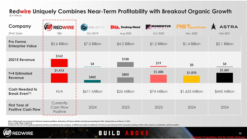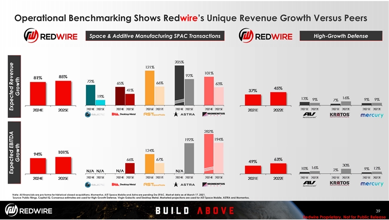 Redwire Uniquely Combines Near-Term Profitability with Breakout Organic Growth ($ in Millions) Company SPAC Date TBD Oct 2019 Aug 2020 Oct 2020 Dec 2020 Feb 2021 Pro Forma $0.6 Billion $7.5 Billion $4.2 Billion $1.2 Billion $1.4 Billion $2.1 Billion Enterprise Value $163 $100 2021E Revenue $19 $4 $4 $0 $1,501 $1,413 $1,200 $1,070 T+4 Estimated $802 $402 Revenue Cash Needed to N/A $611 Million $26 Million $74 Million $1,653 Million $445 Million (1) Break Even Currently First Year of Cash Flow 2024 2023 2023 2024 2024 Positive Cash Flow Positive Note: All financials are pro forma for historical closed acquisitions. Momentus, AST Space Mobile and Astra are pending De-SPAC. Market data as of March 17, 2021. Source: Public filings, Capital IQ. (1) Equal to the sum of all negative projected cash flow (as defined by the company, or EBITDA less CapEx if undefined) in the fiscal years following SPAC transaction (starting in 2021) until company is sustainably cash flow positive. 38 Jefferies LLC / October 2020 Redwire Proprietary, Not for Public ReleaseRedwire Uniquely Combines Near-Term Profitability with Breakout Organic Growth ($ in Millions) Company SPAC Date TBD Oct 2019 Aug 2020 Oct 2020 Dec 2020 Feb 2021 Pro Forma $0.6 Billion $7.5 Billion $4.2 Billion $1.2 Billion $1.4 Billion $2.1 Billion Enterprise Value $163 $100 2021E Revenue $19 $4 $4 $0 $1,501 $1,413 $1,200 $1,070 T+4 Estimated $802 $402 Revenue Cash Needed to N/A $611 Million $26 Million $74 Million $1,653 Million $445 Million (1) Break Even Currently First Year of Cash Flow 2024 2023 2023 2024 2024 Positive Cash Flow Positive Note: All financials are pro forma for historical closed acquisitions. Momentus, AST Space Mobile and Astra are pending De-SPAC. Market data as of March 17, 2021. Source: Public filings, Capital IQ. (1) Equal to the sum of all negative projected cash flow (as defined by the company, or EBITDA less CapEx if undefined) in the fiscal years following SPAC transaction (starting in 2021) until company is sustainably cash flow positive. 38 Jefferies LLC / October 2020 Redwire Proprietary, Not for Public Release