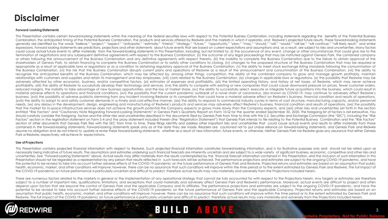 Disclaimer Forward-LookingStatements This Presentation contains certain forward-looking statements within the meaning of the federal securities laws with respect to the Potential Business Combination, including statements regarding the benefits of the Potential Business Combination, the anticipated timing of the Potential Business Combination, the products and services offered by Redwire and the markets in which it operates, and Redwire’s projected future results. These forward-looking statements generally are identified by the words “believe,” “project,” “expect,” “anticipate,” “estimate,” “intend,” “strategy,” “future,” “opportunity,” “plan,” “may,” “should,” “will,” “would,” “will be,” “will continue,” “will likely result,” and similar expressions. Forward looking statements are predictions, projections and other statements about future events that are based on current expectations and assumptions and, as a result, are subject to risks and uncertainties. Many factors could cause actual future events to differ materially from the forward-looking statements in this Presentation, including, but not limited to: (i) the occurrence of any event, change or other circumstances that could give rise to the termination of negotiations and any subsequent definitive agreements with respect to the Business Combination, (ii) the outcome of any legal proceedings that may be instituted against Genesis Park, the combined company or others following the announcement of the Business Combination and any definitive agreements with respect thereto, (iii) the inability to complete the Business Combination due to the failure to obtain approval of the shareholders of Genesis Park, to obtain financing to complete the Business Combination or to satisfy other conditions to closing, (iv) changes to the proposed structure of the Business Combination that may be required or appropriate as a result of applicable laws or regulations or as a condition to obtaining regulatory approval of the Business Combination, (v) the ability to meet stock exchange listing standards following the consummation of the Business Combination, (vi) the risk that the Business Combination disrupts current plans and operations of Redwire as a result of the announcement and consummation of the Business Combination, (vii) the ability to recognize the anticipated benefits of the Business Combination, which may be affected by, among other things, competition, the ability of the combined company to grow and manage growth profitably, maintain relationships with customers and suppliers and retain its management and key employees, (viii) costs related to the Business Combination, (ix) changes in applicable laws or regulations, (x) the possibility that Redwire may be adversely affected by other economic, business, and/or competitive factors, (xi) estimates of expenses and profitability, (xii) the limited operating history, and history of net losses, of Redwire, which may never achieve profitability, (xiii) the ability of Redwire to successfully develop their technology and services, (ivx) the ability to compete with existing or new companies that could cause downward pressure on prices, fewer customer orders, reduced margins, the inability to take advantage of new business opportunities, and the loss of market share, (xv) the ability to successfully select, execute or integrate future acquisitions into the business, which could result in material adverse effects to operations and financial conditions, (xvi) the possibility that the current pandemic outbreak of a novel strain of coronavirus, also known as COVID-19, may continue to adversely affect Redwire’s business, (xvii) the possibility of adverse publicity stemming from any incident involving Redwire or its competitors that could have a material adverse effect on Redwire’s business, financial condition and results of operations, (xviii) the ability to adapt to and satisfy customer demands in a timely and cost-effective manner, (xix) the ability to respond to commercial industry cycles in terms of cost structure, manufacturing capacity, and/or personnel needs, (xx) any delays in the development, design, engineering and manufacturing of Redwire’s products and services may adversely affect Redwire’s business, financial condition and results of operations, (xxi) the possibility that the market for in-space infrastructure services does not achieve the growth potential the Company expects or grows more slowly than the Company expects, and (xxii) other risks and uncertainties set forth in the section entitled “Risk Factors” and “Cautionary Note Regarding Forward-Looking Statements” in Genesis Park’s Quarterly Report on Form 10-Q for the quarter ended September 30, 2020. The foregoing list of factors is not exhaustive. You should carefully consider the foregoing factors and the other risks and uncertainties described in the documents filed by Genesis Park from time to time with the U.S. Securities and Exchange Commission (the “SEC”), including the “Risk Factors” section in the registration statement on Form S-4 and the proxy statement included therein (the “Registration Statement”) that Genesis Park intends to file relating to the Potential Business Combination and the “Risk Factors” section of other documents that Genesis Park files with the SEC from time to time. These filings identify and address other important risks and uncertainties that could cause actual events and results to differ materially from those contained in the forward-looking statements. Forward-looking statements speak only as of the date they are made. Readers are cautioned not to put undue reliance on forward-looking statements, and Genesis Park and Redwire assume no obligation and do not intend to update or revise these forward-looking statements, whether as a result of new information, future events, or otherwise. Neither Genesis 