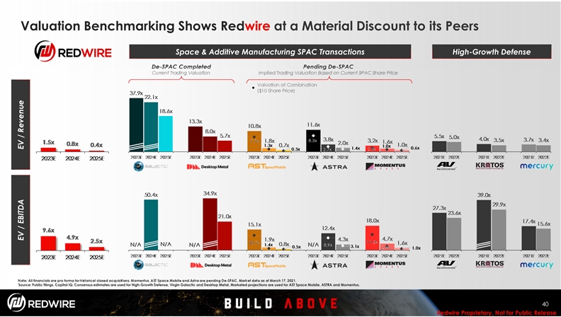 Operational Benchmarking Shows Redwire’s Unique Revenue Growth Versus Peers Space & Additive Manufacturing SPAC Transactions High-Growth Defense Note: All financials are pro forma for historical closed acquisitions. Momentus, AST Space Mobile and Astra are pending De-SPAC. Market data as of March 17, 2021. Source: Public filings, Capital IQ. Consensus estimates are used for High-Growth Defense, Virgin Galactic and Desktop Metal. Marketed projections are used for AST Space Mobile, ASTRA and Momentus. 39 Jefferies LLC / October 2020 Redwire Proprietary, Not for Public Release Expected EBITDA Expected Revenue Growth GrowthOperational Benchmarking Shows Redwire’s Unique Revenue Growth Versus Peers Space & Additive Manufacturing SPAC Transactions High-Growth Defense Note: All financials are pro forma for historical closed acquisitions. Momentus, AST Space Mobile and Astra are pending De-SPAC. Market data as of March 17, 2021. Source: Public filings, Capital IQ. Consensus estimates are used for High-Growth Defense, Virgin Galactic and Desktop Metal. Marketed projections are used for AST Space Mobile, ASTRA and Momentus. 39 Jefferies LLC / October 2020 Redwire Proprietary, Not for Public Release Expected EBITDA Expected Revenue Growth Growth