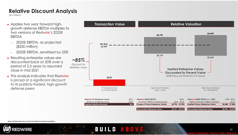 Relative Discount Analysis ($ in Millions) l Applies two year forward high- Transaction Value Relative Valuation growth defense EBITDA multiples to two versions of Redwire’s 2025E EBITDA ─ 2025E EBITDA, as projected ($250 million) ─ 2025E EBITDA, sensitized by 25% l Resulting enterprise values are ~85% discounted back at 20% over a Discount to period of 2.5 years to assumed Relative Value Implied Enterprise Values close in mid 2021 Discounted to Present Value (20% Discount Rate for 2.5 Years) l This analysis indicates that Redwire is priced at a significant discount to its publicly-traded, high-growth defense peers Redwire PF Enterprise Value $615 Redwire 2025E EBITDA $250 Redwire 2025E EBITDA (+/- 25%) $187 - $312 Mid-Point Enterprise Value 3,959 Illustrative EBITDA Multiple Range 20.0x - 30.0x Median Illustrative EBITDA Multiple 25.0x Implied Relative Discount Range of Future Enterprise Values $4,996 - $7,494 Implied Future Enterprise Value $4,684 - $7,806 84% Discounted Enterprise Value $3,167 - $4,751 Discounted Enterprise Value $2,969 - $4,949 Note: All financials are pro forma for historical closed acquisitions. 41 Jefferies LLC / October 2020 Redwire Proprietary, Not for Public ReleaseRelative Discount Analysis ($ in Millions) l Applies two year forward high- Transaction Value Relative Valuation growth defense EBITDA multiples to two versions of Redwire’s 2025E EBITDA ─ 2025E EBITDA, as projected ($250 million) ─ 2025E EBITDA, sensitized by 25% l Resulting enterprise values are ~85% discounted back at 20% over a Discount to period of 2.5 years to assumed Relative Value Implied Enterprise Values close in mid 2021 Discounted to Present Value (20% Discount Rate for 2.5 Years) l This analysis indicates that Redwire is priced at a significant discount to its publicly-traded, high-growth defense peers Redwire PF Enterprise Value $615 Redwire 2025E EBITDA $250 Redwire 2025E EBITDA (+/- 25%) $187 - $312 Mid-Point Enterprise Value 3,959 Illustrative EBITDA Multiple Range 20.0x - 30.0x Median Illustrative EBITDA Multiple 25.0x Implied Relative Discount Range of Future Enterprise Values $4,996 - $7,494 Implied Future Enterprise Value $4,684 - $7,806 84% Discounted Enterprise Value $3,167 - $4,751 Discounted Enterprise Value $2,969 - $4,949 Note: All financials are pro forma for historical closed acquisitions. 41 Jefferies LLC / October 2020 Redwire Proprietary, Not for Public Release