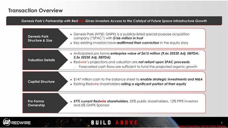 Disclaimer Financial Information;Non-GAAP Financial Terms The financial information and data contained in this Presentation is unaudited and does not conformto RegulationS-X promulgated by the SEC. No independent registered public accounting firm has audited, reviewed, compiled, or performed any procedures with respect to the combined financial information of Redwire for the purpose of inclusion in this Presentation, and accordingly, neither Genesis Park nor any of Redwire expresses an opinion or provides any other form of assurance with respect thereto for the purpose of this Presentation. Accordingly, suchinformation and data may not be included in,may be adjusted in,or maybe presented differentlyin,anyregistration statement or proxy statement or other report or document to be filedor furnishedbyGenesis Park withtheSEC. Furthermore, some of the projected financial information and data contained in this Presentation, such as Adjusted EBITDA (and related measures), has not been prepared in accordance with United States generally accepted accounting principles (“GAAP”). Redwire and Genesis Park believe these non-GAAP measures of financial results provide useful information to management and investors regarding certain financial and business trends relating to Redwire’s financial condition and results of operations. Redwire’s management uses these non-GAAP measures for trend analyses and for budgeting and planning purposes. Redwire and Genesis Park believe that the use of these non- GAAP financial measures provides an additional tool for investors to use in evaluating projected operating results and trends and in comparing Redwire’s financial measures with other similar companies, many of which present similar non-GAAP financial measures to investors. Management of Redwire does not consider these non-GAAP measures in isolation or as an alternative to financial measures determined in accordance with GAAP. The principal limitation of these non-GAAP financial measures is that they exclude significant expenses and income that are required by GAAP to be recorded in Redwire’s financial statements. In addition, they are subject to inherent limitations as they reflect the exercise of judgments by management about which expense and income are excluded or included in determining these non-GAAP financial measures. You should review the audited financial statements of Redwire and certain businesses acquired by Redwire that will be presented in the Registration Statement to be filed with the SEC, and not rely on any single financial measure to evaluate Redwire’s business. A reconciliation of non-GAAP financial measures in this Presentation to the most directly comparable GAAP financial measures is not included, because, without unreasonable effort, Redwire is unable to predict with reasonable certainty the amount or timing of non-GAAP adjustments that are used to calculate these non-GAAP financial measures. Unless otherwise specified, all Redwire financial information herein is presented on a pro forma basis, including the impact of the acquisitions by Redwire of Adcole Space, Made in Space, Deep Space Systems,Roccor,LoadPath, st OakmanAerospace andDeployable Space Systems. Suchfinancial informationassumes that suchacquisitionswereconsummatedon January1 , 2020. Trademarks This Presentationcontains trademarks,service marks, tradenames andcopyrights of Redwire,Genesis Park andother companies,whichare the propertyof their respective owners. The use herein does not imply an affiliation with, or endorsement by, the owners of these service marks, trademarks and tradenames. Third-party logos herein may represent past customers, present customers or may be provided simply for illustrative purposes only. Inclusion of such logos does not necessarily imply affiliation with or endorsement by such firms or businesses. There is no guarantee that either Genesis Park or any of Redwire will work, or continue to work, with any of the firms or businesses whose logos are included herein in the future. Additional InformationandWhereto Find It This document relates to a proposed transaction between Redwire and Genesis Park. This document does not constitute an offer to sell or exchange, or the solicitation of an offer to buy or exchange, any securities, nor shall there be any sale of securities in any jurisdiction in which such offer, sale or exchange would be unlawful prior to registration or qualification under the securities laws of any such jurisdiction. Genesis Park intends to file the Registration Statement with the SEC. The Registration Statement will be sent to all Genesis Park stockholders. Genesis Park also will file other documents regarding the proposed transaction with the SEC. Before making any voting decision, investors and security holders of Genesis Park are urged to read the Registration Statement and all other relevant documents filed or that will be filed with the SEC in connection with the proposed transaction as they become available because they will contain important information about the proposed transactions. Investors and security holders will be able to obtain free copies of the Registration Statement and all other relevant documents filed or that will be filed with the SEC by Genesis Park through the website maintained by the SEC at www.sec.gov. In addition, the documents filed by Genesis Park may be obtained free of charge from Genesis Park’s website at www.genesis-park.com or by written request to Genesis Park at Genesis Park Acquisition Corp., 2000 Edwards Street, Suite B,Houston, Texas 77007. 4 Jefferies LLC / October 2020 Redwire Proprietary, Not for Public ReleaseDisclaimer Financial Information;Non-GAAP Financial Terms The financial information and data contained in this Presentation is unaudited and does not conformto RegulationS-X promulgated by the SEC. No independent registered public accounting firm has audited, reviewed, compiled, or performed any procedures with res