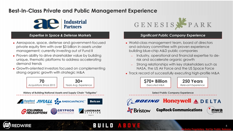 Transaction Overview Genesis Park’s Partnership with Redwire Gives Investors Access to the Catalyst of Future Space Infrastructure Growth l Genesis Park (NYSE: GNPK) is a publicly-listed special purpose acquisition Genesis Park company (“SPAC”) with $166 million in trust Structure & Size l Key existing investors have reaffirmed their conviction in the equity story l Anticipated pro forma enterprise value of $615 million (9.6x 2023E Adj. EBITDA; 2.5x 2025E Adj. EBITDA) Valuation Details l Redwire’s projections and valuation are not reliant upon SPAC proceeds – Forecasted cash flows are sufficient to fund the projected organic growth l $147 million cash to the balance sheet to enable strategic investments and M&A Capital Structure l Existing Redwire shareholders rolling a significant portion of their equity Pro Forma l 57% current Redwire shareholders, 25% public shareholders, 12% PIPE investors Ownership and 6% GNPK Sponsor 5 Jefferies LLC / October 2020 Redwire Proprietary, Not for Public ReleaseTransaction Overview Genesis Park’s Partnership with Redwire Gives Investors Access to the Catalyst of Future Space Infrastructure Growth l Genesis Park (NYSE: GNPK) is a publicly-listed special purpose acquisition Genesis Park company (“SPAC”) with $166 million in trust Structure & Size l Key existing investors have reaffirmed their conviction in the equity story l Anticipated pro forma enterprise value of $615 million (9.6x 2023E Adj. EBITDA; 2.5x 2025E Adj. EBITDA) Valuation Details l Redwire’s projections and valuation are not reliant upon SPAC proceeds – Forecasted cash flows are sufficient to fund the projected organic growth l $147 million cash to the balance sheet to enable strategic investments and M&A Capital Structure l Existing Redwire shareholders rolling a significant portion of their equity Pro Forma l 57% current Redwire shareholders, 25% public shareholders, 12% PIPE investors Ownership and 6% GNPK Sponsor 5 Jefferies LLC / October 2020 Redwire Proprietary, Not for Public Release
