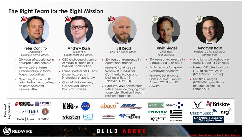 Best-In-Class Private and Public Management Experience Expertise in Space & Defense Markets Significant Public Company Experience l Aerospace, space, defense and government-focused l World-class management team, board of directors private equity firm with over $3 billion in assets under and advisory committee with proven experience management; currently investing out of Fund II building blue-chip A&D public companies l Proven ability to drive shareholder value by building ─ Industry, operational and financial expertise to de- unique, thematic platforms to address accelerating risk and accelerate organic growth demand trends ─ Strong relationships with key stakeholders such as l Growth-oriented investors focused on complementing NASA, the US Air Force and the US Space Force strong organic growth with strategic M&A l Track record of successfully executing high-profile M&A 70 30+ $70+ Billion 250 Years Acquisitions Since 2015 Years Avg. Experience Executed M&A Relevant Experience History of Building National Assets and Supply Chain “Tollgates” Select Public Company Experience Legacy Legacy 6 Jefferies LLC / October 2020 Redwire Proprietary, Not for Public ReleaseBest-In-Class Private and Public Management Experience Expertise in Space & Defense Markets Significant Public Company Experience l Aerospace, space, defense and government-focused l World-class management team, board of directors private equity firm with over $3 billion in assets under and advisory committee with proven experience management; currently investing out of Fund II building blue-chip A&D public companies l Proven ability to drive shareholder value by building ─ Industry, operational and financial expertise to de- unique, thematic platforms to address accelerating risk and accelerate organic growth demand trends ─ Strong relationships with key stakeholders such as l Growth-oriented investors focused on complementing NASA, the US Air Force and the US Space Force strong organic growth with strategic M&A l Track record of successfully executing high-profile M&A 70 30+ $70+ Billion 250 Years Acquisitions Since 2015 Years Avg. Experience Executed M&A Relevant Experience History of Building National Assets and Supply Chain “Tollgates” Select Public Company Experience Legacy Legacy 6 Jefferies LLC / October 2020 Redwire Proprietary, Not for Public Release