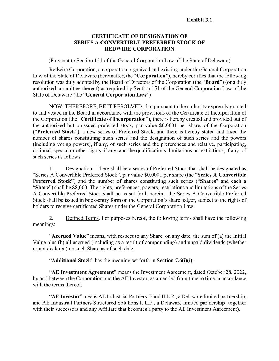 Exhibit 3.1 CERTIFICATE OF DESIGNATION OF SERIES A CONVERTIBLE PREFERRED STOCK OF REDWIRE CORPORATION (Pursuant to Section 151 of the General Corporation Law of the State of Delaware) Redwire Corporation, a corporation organized and existing under the General Corporation Law of the State of Delaware (hereinafter, the “Corporation”), hereby certifies that the following resolution was duly adopted by the Board of Directors of the Corporation (the “Board”) (or a duly authorized committee thereof) as required by Section 151 of the General Corporation Law of the State of Delaware (the “General Corporation Law”): NOW, THEREFORE, BE IT RESOLVED, that pursuant to the authority expressly granted to and vested in the Board in accordance with the provisions of the Certificate of Incorporation of the Corporation (the “Certificate of Incorporation”), there is hereby created and provided out of the authorized but unissued preferred stock, par value $0.0001 per share, of the Corporation (“Preferred Stock”), a new series of Preferred Stock, and there is hereby stated and fixed the number of shares constituting such series and the designation of such series and the powers (including voting powers), if any, of such series and the preferences and relative, participating, optional, special or other rights, if any, and the qualifications, limitations or restrictions, if any, of such series as follows: 1. Designation. There shall be a series of Preferred Stock that shall be designated as “Series A Convertible Preferred Stock”, par value $0.0001 per share (the “Series A Convertible Preferred Stock”) and the number of shares constituting such series (“Shares” and each a “Share”) shall be 88,000. The rights, preferences, powers, restrictions and limitations of the Series A Convertible Preferred Stock shall be as set forth herein. The Series A Convertible Preferred Stock shall be issued in book-entry form on the Corporation’s share ledger, subject to the rights of holders to receive certificated Shares under the General Corporation Law. 2. Defined Terms. For purposes hereof, the following terms shall have the following meanings: “Accrued Value” means, with respect to any Share, on any date, the sum of (a) the Initial Value plus (b) all accrued (including as a result of compounding) and unpaid dividends (whether or not declared) on such Share as of such date. “Additional Stock” has the meaning set forth in Section 7.6(i)(i). “AE Investment Agreement” means the Investment Agreement, dated October 28, 2022, by and between the Corporation and the AE Investor, as amended from time to time in accordance with the terms thereof. “AE Investor” means AE Industrial Partners, Fund II L.P., a Delaware limited partnership, and AE Industrial Partners Structured Solutions I, L.P., a Delaware limited partnership (together with their successors and any Affiliate that becomes a party to the AE Investment Agreement).