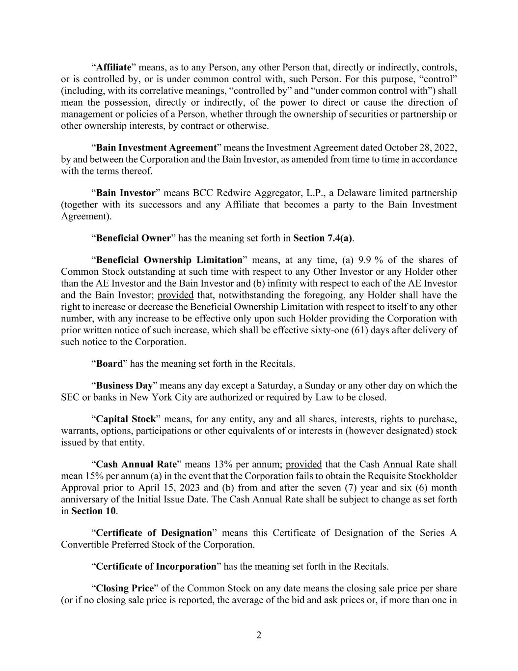 2 “Affiliate” means, as to any Person, any other Person that, directly or indirectly, controls, or is controlled by, or is under common control with, such Person. For this purpose, “control” (including, with its correlative meanings, “controlled by” and “under common control with”) shall mean the possession, directly or indirectly, of the power to direct or cause the direction of management or policies of a Person, whether through the ownership of securities or partnership or other ownership interests, by contract or otherwise. “Bain Investment Agreement” means the Investment Agreement dated October 28, 2022, by and between the Corporation and the Bain Investor, as amended from time to time in accordance with the terms thereof. “Bain Investor” means BCC Redwire Aggregator, L.P., a Delaware limited partnership (together with its successors and any Affiliate that becomes a party to the Bain Investment Agreement). “Beneficial Owner” has the meaning set forth in Section 7.4(a). “Beneficial Ownership Limitation” means, at any time, (a) 9.9 % of the shares of Common Stock outstanding at such time with respect to any Other Investor or any Holder other than the AE Investor and the Bain Investor and (b) infinity with respect to each of the AE Investor and the Bain Investor; provided that, notwithstanding the foregoing, any Holder shall have the right to increase or decrease the Beneficial Ownership Limitation with respect to itself to any other number, with any increase to be effective only upon such Holder providing the Corporation with prior written notice of such increase, which shall be effective sixty-one (61) days after delivery of such notice to the Corporation. “Board” has the meaning set forth in the Recitals. “Business Day” means any day except a Saturday, a Sunday or any other day on which the SEC or banks in New York City are authorized or required by Law to be closed. “Capital Stock” means, for any entity, any and all shares, interests, rights to purchase, warrants, options, participations or other equivalents of or interests in (however designated) stock issued by that entity. “Cash Annual Rate” means 13% per annum; provided that the Cash Annual Rate shall mean 15% per annum (a) in the event that the Corporation fails to obtain the Requisite Stockholder Approval prior to April 15, 2023 and (b) from and after the seven (7) year and six (6) month anniversary of the Initial Issue Date. The Cash Annual Rate shall be subject to change as set forth in Section 10. “Certificate of Designation” means this Certificate of Designation of the Series A Convertible Preferred Stock of the Corporation. “Certificate of Incorporation” has the meaning set forth in the Recitals. “Closing Price” of the Common Stock on any date means the closing sale price per share (or if no closing sale price is reported, the average of the bid and ask prices or, if more than one in