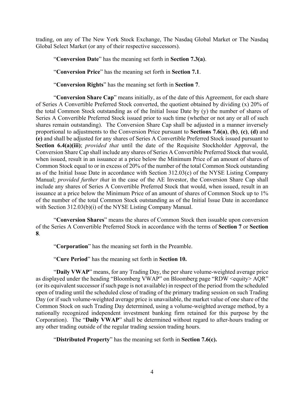 4 trading, on any of The New York Stock Exchange, The Nasdaq Global Market or The Nasdaq Global Select Market (or any of their respective successors). “Conversion Date” has the meaning set forth in Section 7.3(a). “Conversion Price” has the meaning set forth in Section 7.1. “Conversion Rights” has the meaning set forth in Section 7. “Conversion Share Cap” means initially, as of the date of this Agreement, for each share of Series A Convertible Preferred Stock converted, the quotient obtained by dividing (x) 20% of the total Common Stock outstanding as of the Initial Issue Date by (y) the number of shares of Series A Convertible Preferred Stock issued prior to such time (whether or not any or all of such shares remain outstanding). The Conversion Share Cap shall be adjusted in a manner inversely proportional to adjustments to the Conversion Price pursuant to Sections 7.6(a), (b), (c), (d) and (e) and shall be adjusted for any shares of Series A Convertible Preferred Stock issued pursuant to Section 6.4(a)(iii); provided that until the date of the Requisite Stockholder Approval, the Conversion Share Cap shall include any shares of Series A Convertible Preferred Stock that would, when issued, result in an issuance at a price below the Minimum Price of an amount of shares of Common Stock equal to or in excess of 20% of the number of the total Common Stock outstanding as of the Initial Issue Date in accordance with Section 312.03(c) of the NYSE Listing Company Manual; provided further that in the case of the AE Investor, the Conversion Share Cap shall include any shares of Series A Convertible Preferred Stock that would, when issued, result in an issuance at a price below the Minimum Price of an amount of shares of Common Stock up to 1% of the number of the total Common Stock outstanding as of the Initial Issue Date in accordance with Section 312.03(b)(i) of the NYSE Listing Company Manual. “Conversion Shares” means the shares of Common Stock then issuable upon conversion of the Series A Convertible Preferred Stock in accordance with the terms of Section 7 or Section 8. “Corporation” has the meaning set forth in the Preamble. “Cure Period” has the meaning set forth in Section 10. “Daily VWAP” means, for any Trading Day, the per share volume-weighted average price as displayed under the heading “Bloomberg VWAP” on Bloomberg page “RDW <equity> AQR” (or its equivalent successor if such page is not available) in respect of the period from the scheduled open of trading until the scheduled close of trading of the primary trading session on such Trading Day (or if such volume-weighted average price is unavailable, the market value of one share of the Common Stock on such Trading Day determined, using a volume-weighted average method, by a nationally recognized independent investment banking firm retained for this purpose by the Corporation). The “Daily VWAP” shall be determined without regard to after-hours trading or any other trading outside of the regular trading session trading hours. “Distributed Property” has the meaning set forth in Section 7.6(c).