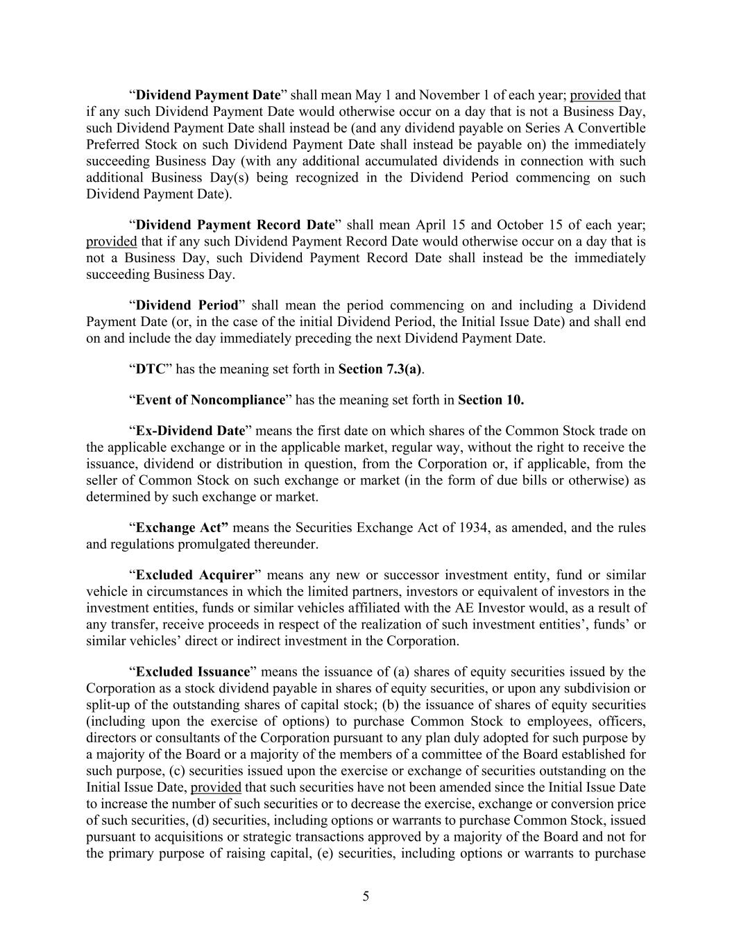 5 “Dividend Payment Date” shall mean May 1 and November 1 of each year; provided that if any such Dividend Payment Date would otherwise occur on a day that is not a Business Day, such Dividend Payment Date shall instead be (and any dividend payable on Series A Convertible Preferred Stock on such Dividend Payment Date shall instead be payable on) the immediately succeeding Business Day (with any additional accumulated dividends in connection with such additional Business Day(s) being recognized in the Dividend Period commencing on such Dividend Payment Date). “Dividend Payment Record Date” shall mean April 15 and October 15 of each year; provided that if any such Dividend Payment Record Date would otherwise occur on a day that is not a Business Day, such Dividend Payment Record Date shall instead be the immediately succeeding Business Day. “Dividend Period” shall mean the period commencing on and including a Dividend Payment Date (or, in the case of the initial Dividend Period, the Initial Issue Date) and shall end on and include the day immediately preceding the next Dividend Payment Date. “DTC” has the meaning set forth in Section 7.3(a). “Event of Noncompliance” has the meaning set forth in Section 10. “Ex-Dividend Date” means the first date on which shares of the Common Stock trade on the applicable exchange or in the applicable market, regular way, without the right to receive the issuance, dividend or distribution in question, from the Corporation or, if applicable, from the seller of Common Stock on such exchange or market (in the form of due bills or otherwise) as determined by such exchange or market. “Exchange Act” means the Securities Exchange Act of 1934, as amended, and the rules and regulations promulgated thereunder. “Excluded Acquirer” means any new or successor investment entity, fund or similar vehicle in circumstances in which the limited partners, investors or equivalent of investors in the investment entities, funds or similar vehicles affiliated with the AE Investor would, as a result of any transfer, receive proceeds in respect of the realization of such investment entities’, funds’ or similar vehicles’ direct or indirect investment in the Corporation. “Excluded Issuance” means the issuance of (a) shares of equity securities issued by the Corporation as a stock dividend payable in shares of equity securities, or upon any subdivision or split-up of the outstanding shares of capital stock; (b) the issuance of shares of equity securities (including upon the exercise of options) to purchase Common Stock to employees, officers, directors or consultants of the Corporation pursuant to any plan duly adopted for such purpose by a majority of the Board or a majority of the members of a committee of the Board established for such purpose, (c) securities issued upon the exercise or exchange of securities outstanding on the Initial Issue Date, provided that such securities have not been amended since the Initial Issue Date to increase the number of such securities or to decrease the exercise, exchange or conversion price of such securities, (d) securities, including options or warrants to purchase Common Stock, issued pursuant to acquisitions or strategic transactions approved by a majority of the Board and not for the primary purpose of raising capital, (e) securities, including options or warrants to purchase