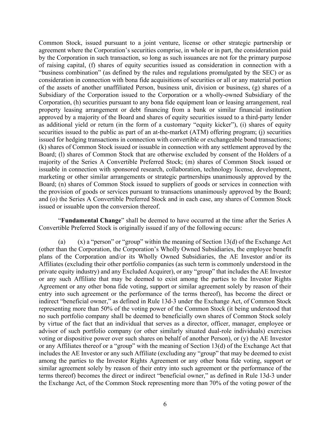 6 Common Stock, issued pursuant to a joint venture, license or other strategic partnership or agreement where the Corporation’s securities comprise, in whole or in part, the consideration paid by the Corporation in such transaction, so long as such issuances are not for the primary purpose of raising capital, (f) shares of equity securities issued as consideration in connection with a “business combination” (as defined by the rules and regulations promulgated by the SEC) or as consideration in connection with bona fide acquisitions of securities or all or any material portion of the assets of another unaffiliated Person, business unit, division or business, (g) shares of a Subsidiary of the Corporation issued to the Corporation or a wholly-owned Subsidiary of the Corporation, (h) securities pursuant to any bona fide equipment loan or leasing arrangement, real property leasing arrangement or debt financing from a bank or similar financial institution approved by a majority of the Board and shares of equity securities issued to a third-party lender as additional yield or return (in the form of a customary “equity kicker”), (i) shares of equity securities issued to the public as part of an at-the-market (ATM) offering program; (j) securities issued for hedging transactions in connection with convertible or exchangeable bond transactions; (k) shares of Common Stock issued or issuable in connection with any settlement approved by the Board; (l) shares of Common Stock that are otherwise excluded by consent of the Holders of a majority of the Series A Convertible Preferred Stock; (m) shares of Common Stock issued or issuable in connection with sponsored research, collaboration, technology license, development, marketing or other similar arrangements or strategic partnerships unanimously approved by the Board; (n) shares of Common Stock issued to suppliers of goods or services in connection with the provision of goods or services pursuant to transactions unanimously approved by the Board; and (o) the Series A Convertible Preferred Stock and in each case, any shares of Common Stock issued or issuable upon the conversion thereof. “Fundamental Change” shall be deemed to have occurred at the time after the Series A Convertible Preferred Stock is originally issued if any of the following occurs: (a) (x) a “person” or “group” within the meaning of Section 13(d) of the Exchange Act (other than the Corporation, the Corporation’s Wholly Owned Subsidiaries, the employee benefit plans of the Corporation and/or its Wholly Owned Subsidiaries, the AE Investor and/or its Affiliates (excluding their other portfolio companies (as such term is commonly understood in the private equity industry) and any Excluded Acquirer), or any “group” that includes the AE Investor or any such Affiliate that may be deemed to exist among the parties to the Investor Rights Agreement or any other bona fide voting, support or similar agreement solely by reason of their entry into such agreement or the performance of the terms thereof), has become the direct or indirect “beneficial owner,” as defined in Rule 13d-3 under the Exchange Act, of Common Stock representing more than 50% of the voting power of the Common Stock (it being understood that no such portfolio company shall be deemed to beneficially own shares of Common Stock solely by virtue of the fact that an individual that serves as a director, officer, manager, employee or advisor of such portfolio company (or other similarly situated dual-role individuals) exercises voting or dispositive power over such shares on behalf of another Person), or (y) the AE Investor or any Affiliates thereof or a “group” with the meaning of Section 13(d) of the Exchange Act that includes the AE Investor or any such Affiliate (excluding any “group” that may be deemed to exist among the parties to the Investor Rights Agreement or any other bona fide voting, support or similar agreement solely by reason of their entry into such agreement or the performance of the terms thereof) becomes the direct or indirect “beneficial owner,” as defined in Rule 13d-3 under the Exchange Act, of the Common Stock representing more than 70% of the voting power of the