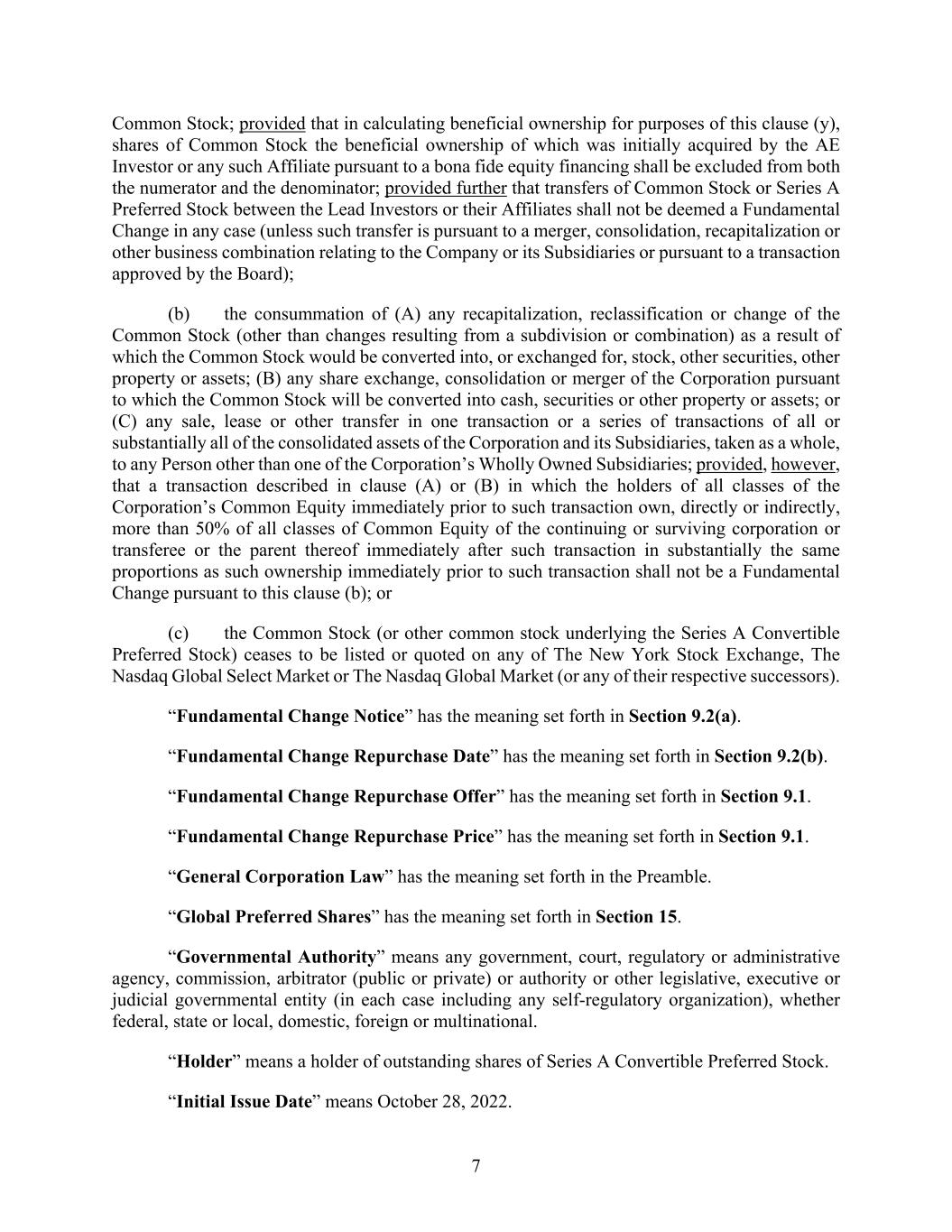 7 Common Stock; provided that in calculating beneficial ownership for purposes of this clause (y), shares of Common Stock the beneficial ownership of which was initially acquired by the AE Investor or any such Affiliate pursuant to a bona fide equity financing shall be excluded from both the numerator and the denominator; provided further that transfers of Common Stock or Series A Preferred Stock between the Lead Investors or their Affiliates shall not be deemed a Fundamental Change in any case (unless such transfer is pursuant to a merger, consolidation, recapitalization or other business combination relating to the Company or its Subsidiaries or pursuant to a transaction approved by the Board); (b) the consummation of (A) any recapitalization, reclassification or change of the Common Stock (other than changes resulting from a subdivision or combination) as a result of which the Common Stock would be converted into, or exchanged for, stock, other securities, other property or assets; (B) any share exchange, consolidation or merger of the Corporation pursuant to which the Common Stock will be converted into cash, securities or other property or assets; or (C) any sale, lease or other transfer in one transaction or a series of transactions of all or substantially all of the consolidated assets of the Corporation and its Subsidiaries, taken as a whole, to any Person other than one of the Corporation’s Wholly Owned Subsidiaries; provided, however, that a transaction described in clause (A) or (B) in which the holders of all classes of the Corporation’s Common Equity immediately prior to such transaction own, directly or indirectly, more than 50% of all classes of Common Equity of the continuing or surviving corporation or transferee or the parent thereof immediately after such transaction in substantially the same proportions as such ownership immediately prior to such transaction shall not be a Fundamental Change pursuant to this clause (b); or (c) the Common Stock (or other common stock underlying the Series A Convertible Preferred Stock) ceases to be listed or quoted on any of The New York Stock Exchange, The Nasdaq Global Select Market or The Nasdaq Global Market (or any of their respective successors). “Fundamental Change Notice” has the meaning set forth in Section 9.2(a). “Fundamental Change Repurchase Date” has the meaning set forth in Section 9.2(b). “Fundamental Change Repurchase Offer” has the meaning set forth in Section 9.1. “Fundamental Change Repurchase Price” has the meaning set forth in Section 9.1. “General Corporation Law” has the meaning set forth in the Preamble. “Global Preferred Shares” has the meaning set forth in Section 15. “Governmental Authority” means any government, court, regulatory or administrative agency, commission, arbitrator (public or private) or authority or other legislative, executive or judicial governmental entity (in each case including any self-regulatory organization), whether federal, state or local, domestic, foreign or multinational. “Holder” means a holder of outstanding shares of Series A Convertible Preferred Stock. “Initial Issue Date” means October 28, 2022.