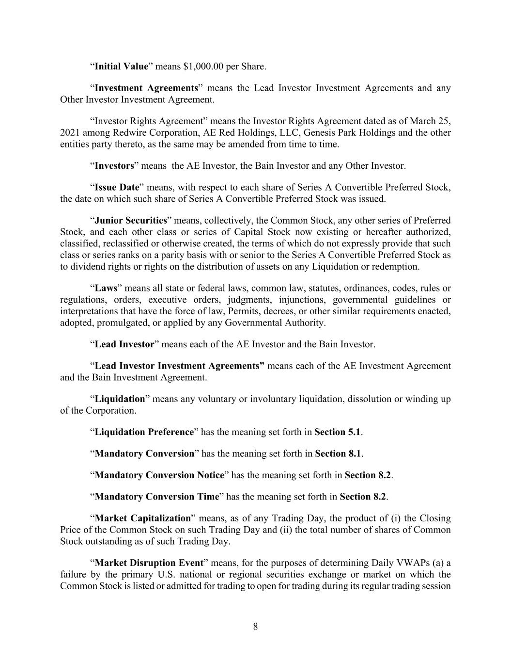 8 “Initial Value” means $1,000.00 per Share. “Investment Agreements” means the Lead Investor Investment Agreements and any Other Investor Investment Agreement. “Investor Rights Agreement” means the Investor Rights Agreement dated as of March 25, 2021 among Redwire Corporation, AE Red Holdings, LLC, Genesis Park Holdings and the other entities party thereto, as the same may be amended from time to time. “Investors” means the AE Investor, the Bain Investor and any Other Investor. “Issue Date” means, with respect to each share of Series A Convertible Preferred Stock, the date on which such share of Series A Convertible Preferred Stock was issued. “Junior Securities” means, collectively, the Common Stock, any other series of Preferred Stock, and each other class or series of Capital Stock now existing or hereafter authorized, classified, reclassified or otherwise created, the terms of which do not expressly provide that such class or series ranks on a parity basis with or senior to the Series A Convertible Preferred Stock as to dividend rights or rights on the distribution of assets on any Liquidation or redemption. “Laws” means all state or federal laws, common law, statutes, ordinances, codes, rules or regulations, orders, executive orders, judgments, injunctions, governmental guidelines or interpretations that have the force of law, Permits, decrees, or other similar requirements enacted, adopted, promulgated, or applied by any Governmental Authority. “Lead Investor” means each of the AE Investor and the Bain Investor. “Lead Investor Investment Agreements” means each of the AE Investment Agreement and the Bain Investment Agreement. “Liquidation” means any voluntary or involuntary liquidation, dissolution or winding up of the Corporation. “Liquidation Preference” has the meaning set forth in Section 5.1. “Mandatory Conversion” has the meaning set forth in Section 8.1. “Mandatory Conversion Notice” has the meaning set forth in Section 8.2. “Mandatory Conversion Time” has the meaning set forth in Section 8.2. “Market Capitalization” means, as of any Trading Day, the product of (i) the Closing Price of the Common Stock on such Trading Day and (ii) the total number of shares of Common Stock outstanding as of such Trading Day. “Market Disruption Event” means, for the purposes of determining Daily VWAPs (a) a failure by the primary U.S. national or regional securities exchange or market on which the Common Stock is listed or admitted for trading to open for trading during its regular trading session
