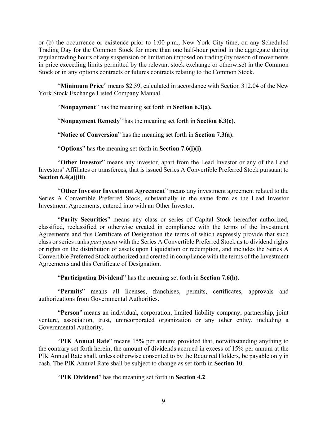 9 or (b) the occurrence or existence prior to 1:00 p.m., New York City time, on any Scheduled Trading Day for the Common Stock for more than one half-hour period in the aggregate during regular trading hours of any suspension or limitation imposed on trading (by reason of movements in price exceeding limits permitted by the relevant stock exchange or otherwise) in the Common Stock or in any options contracts or futures contracts relating to the Common Stock. “Minimum Price” means $2.39, calculated in accordance with Section 312.04 of the New York Stock Exchange Listed Company Manual. “Nonpayment” has the meaning set forth in Section 6.3(a). “Nonpayment Remedy” has the meaning set forth in Section 6.3(c). “Notice of Conversion” has the meaning set forth in Section 7.3(a). “Options” has the meaning set forth in Section 7.6(i)(i). “Other Investor” means any investor, apart from the Lead Investor or any of the Lead Investors’ Affiliates or transferees, that is issued Series A Convertible Preferred Stock pursuant to Section 6.4(a)(iii). “Other Investor Investment Agreement” means any investment agreement related to the Series A Convertible Preferred Stock, substantially in the same form as the Lead Investor Investment Agreements, entered into with an Other Investor. “Parity Securities” means any class or series of Capital Stock hereafter authorized, classified, reclassified or otherwise created in compliance with the terms of the Investment Agreements and this Certificate of Designation the terms of which expressly provide that such class or series ranks pari passu with the Series A Convertible Preferred Stock as to dividend rights or rights on the distribution of assets upon Liquidation or redemption, and includes the Series A Convertible Preferred Stock authorized and created in compliance with the terms of the Investment Agreements and this Certificate of Designation. “Participating Dividend” has the meaning set forth in Section 7.6(h). “Permits” means all licenses, franchises, permits, certificates, approvals and authorizations from Governmental Authorities. “Person” means an individual, corporation, limited liability company, partnership, joint venture, association, trust, unincorporated organization or any other entity, including a Governmental Authority. “PIK Annual Rate” means 15% per annum; provided that, notwithstanding anything to the contrary set forth herein, the amount of dividends accrued in excess of 15% per annum at the PIK Annual Rate shall, unless otherwise consented to by the Required Holders, be payable only in cash. The PIK Annual Rate shall be subject to change as set forth in Section 10. “PIK Dividend” has the meaning set forth in Section 4.2.