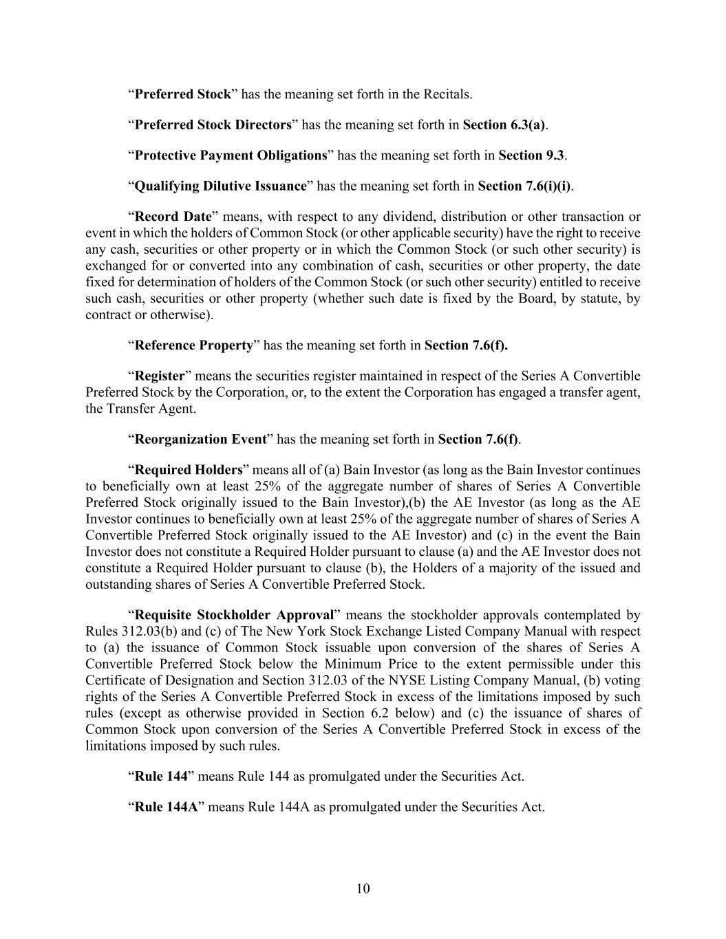 10 “Preferred Stock” has the meaning set forth in the Recitals. “Preferred Stock Directors” has the meaning set forth in Section 6.3(a). “Protective Payment Obligations” has the meaning set forth in Section 9.3. “Qualifying Dilutive Issuance” has the meaning set forth in Section 7.6(i)(i). “Record Date” means, with respect to any dividend, distribution or other transaction or event in which the holders of Common Stock (or other applicable security) have the right to receive any cash, securities or other property or in which the Common Stock (or such other security) is exchanged for or converted into any combination of cash, securities or other property, the date fixed for determination of holders of the Common Stock (or such other security) entitled to receive such cash, securities or other property (whether such date is fixed by the Board, by statute, by contract or otherwise). “Reference Property” has the meaning set forth in Section 7.6(f). “Register” means the securities register maintained in respect of the Series A Convertible Preferred Stock by the Corporation, or, to the extent the Corporation has engaged a transfer agent, the Transfer Agent. “Reorganization Event” has the meaning set forth in Section 7.6(f). “Required Holders” means all of (a) Bain Investor (as long as the Bain Investor continues to beneficially own at least 25% of the aggregate number of shares of Series A Convertible Preferred Stock originally issued to the Bain Investor),(b) the AE Investor (as long as the AE Investor continues to beneficially own at least 25% of the aggregate number of shares of Series A Convertible Preferred Stock originally issued to the AE Investor) and (c) in the event the Bain Investor does not constitute a Required Holder pursuant to clause (a) and the AE Investor does not constitute a Required Holder pursuant to clause (b), the Holders of a majority of the issued and outstanding shares of Series A Convertible Preferred Stock. “Requisite Stockholder Approval” means the stockholder approvals contemplated by Rules 312.03(b) and (c) of The New York Stock Exchange Listed Company Manual with respect to (a) the issuance of Common Stock issuable upon conversion of the shares of Series A Convertible Preferred Stock below the Minimum Price to the extent permissible under this Certificate of Designation and Section 312.03 of the NYSE Listing Company Manual, (b) voting rights of the Series A Convertible Preferred Stock in excess of the limitations imposed by such rules (except as otherwise provided in Section 6.2 below) and (c) the issuance of shares of Common Stock upon conversion of the Series A Convertible Preferred Stock in excess of the limitations imposed by such rules. “Rule 144” means Rule 144 as promulgated under the Securities Act. “Rule 144A” means Rule 144A as promulgated under the Securities Act.