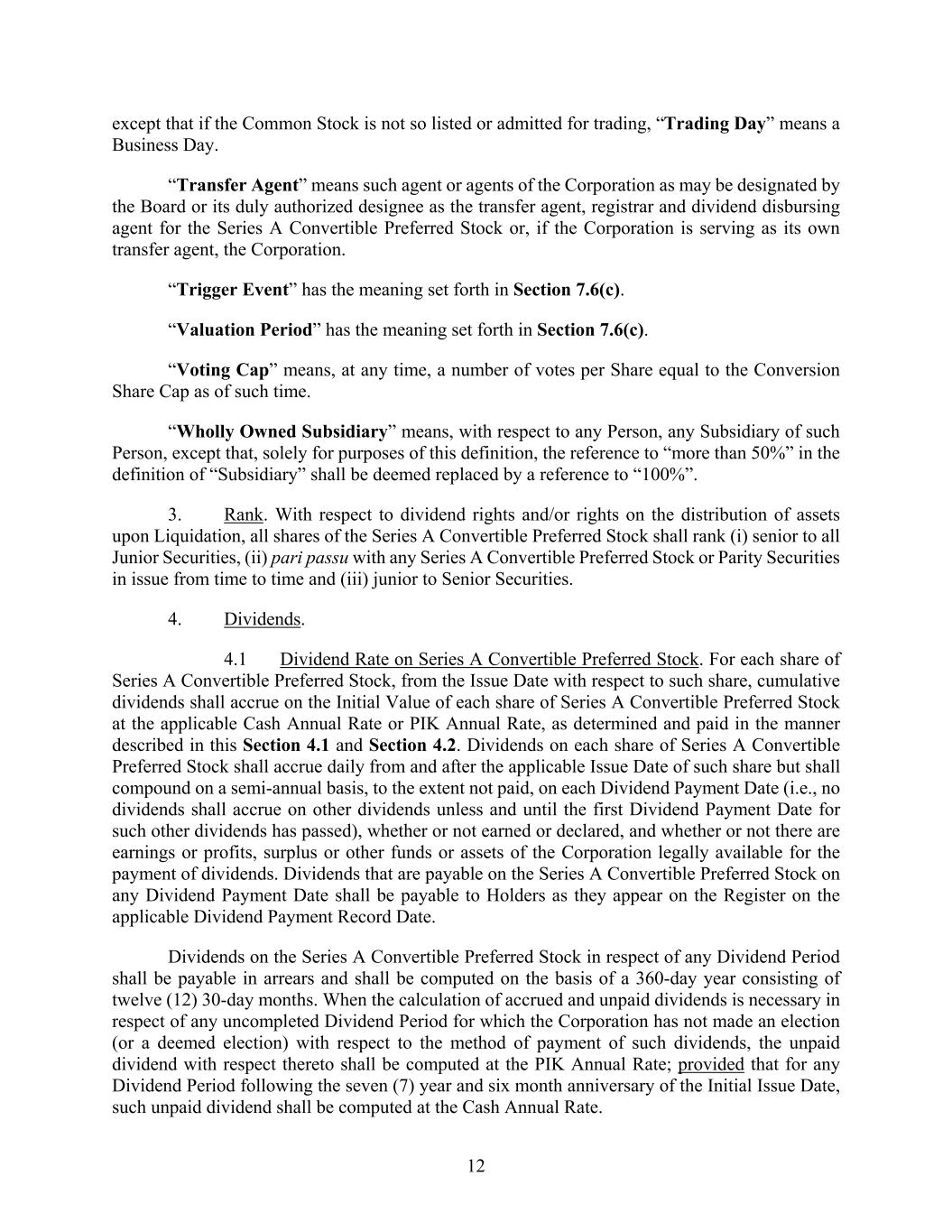 12 except that if the Common Stock is not so listed or admitted for trading, “Trading Day” means a Business Day. “Transfer Agent” means such agent or agents of the Corporation as may be designated by the Board or its duly authorized designee as the transfer agent, registrar and dividend disbursing agent for the Series A Convertible Preferred Stock or, if the Corporation is serving as its own transfer agent, the Corporation. “Trigger Event” has the meaning set forth in Section 7.6(c). “Valuation Period” has the meaning set forth in Section 7.6(c). “Voting Cap” means, at any time, a number of votes per Share equal to the Conversion Share Cap as of such time. “Wholly Owned Subsidiary” means, with respect to any Person, any Subsidiary of such Person, except that, solely for purposes of this definition, the reference to “more than 50%” in the definition of “Subsidiary” shall be deemed replaced by a reference to “100%”. 3. Rank. With respect to dividend rights and/or rights on the distribution of assets upon Liquidation, all shares of the Series A Convertible Preferred Stock shall rank (i) senior to all Junior Securities, (ii) pari passu with any Series A Convertible Preferred Stock or Parity Securities in issue from time to time and (iii) junior to Senior Securities. 4. Dividends. 4.1 Dividend Rate on Series A Convertible Preferred Stock. For each share of Series A Convertible Preferred Stock, from the Issue Date with respect to such share, cumulative dividends shall accrue on the Initial Value of each share of Series A Convertible Preferred Stock at the applicable Cash Annual Rate or PIK Annual Rate, as determined and paid in the manner described in this Section 4.1 and Section 4.2. Dividends on each share of Series A Convertible Preferred Stock shall accrue daily from and after the applicable Issue Date of such share but shall compound on a semi-annual basis, to the extent not paid, on each Dividend Payment Date (i.e., no dividends shall accrue on other dividends unless and until the first Dividend Payment Date for such other dividends has passed), whether or not earned or declared, and whether or not there are earnings or profits, surplus or other funds or assets of the Corporation legally available for the payment of dividends. Dividends that are payable on the Series A Convertible Preferred Stock on any Dividend Payment Date shall be payable to Holders as they appear on the Register on the applicable Dividend Payment Record Date. Dividends on the Series A Convertible Preferred Stock in respect of any Dividend Period shall be payable in arrears and shall be computed on the basis of a 360-day year consisting of twelve (12) 30-day months. When the calculation of accrued and unpaid dividends is necessary in respect of any uncompleted Dividend Period for which the Corporation has not made an election (or a deemed election) with respect to the method of payment of such dividends, the unpaid dividend with respect thereto shall be computed at the PIK Annual Rate; provided that for any Dividend Period following the seven (7) year and six month anniversary of the Initial Issue Date, such unpaid dividend shall be computed at the Cash Annual Rate.