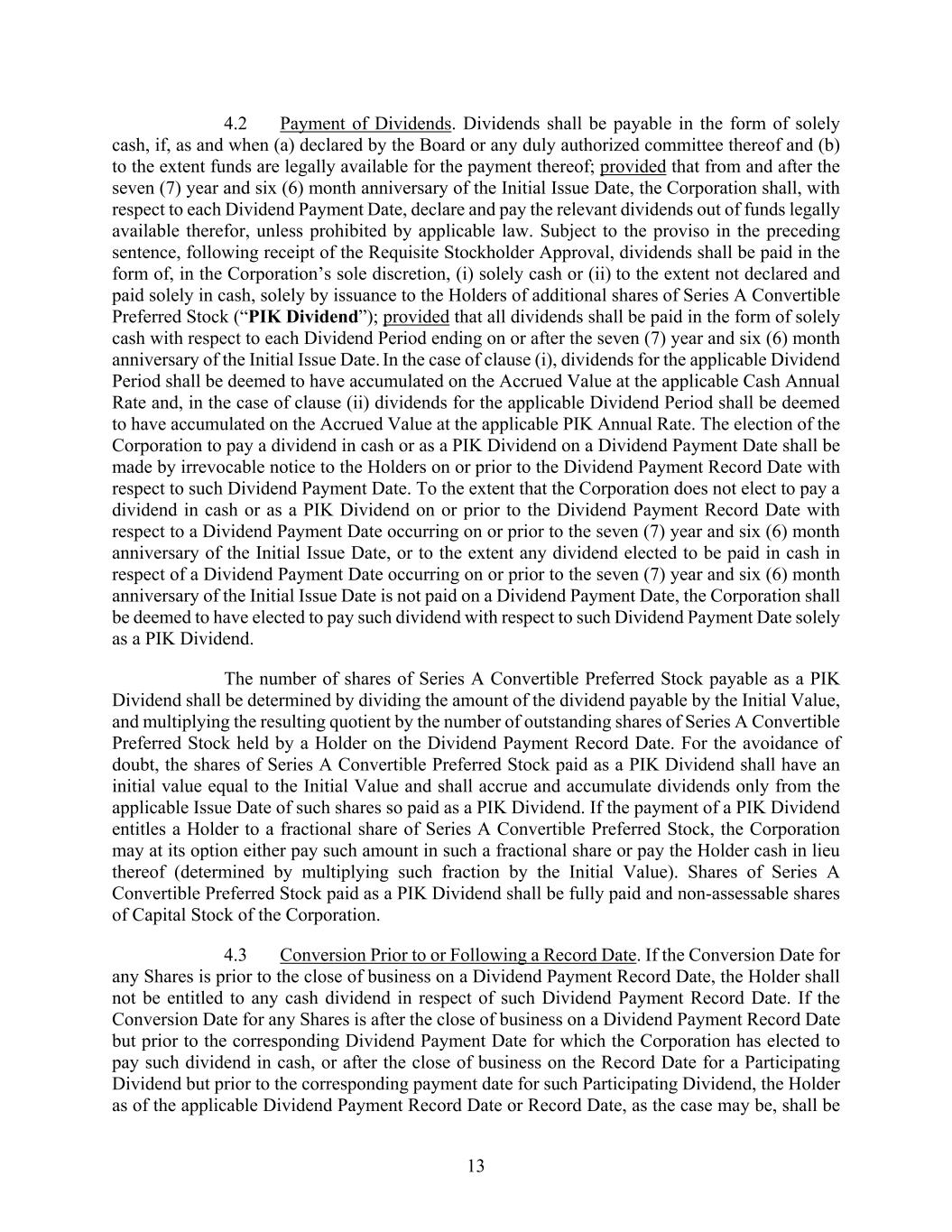 13 4.2 Payment of Dividends. Dividends shall be payable in the form of solely cash, if, as and when (a) declared by the Board or any duly authorized committee thereof and (b) to the extent funds are legally available for the payment thereof; provided that from and after the seven (7) year and six (6) month anniversary of the Initial Issue Date, the Corporation shall, with respect to each Dividend Payment Date, declare and pay the relevant dividends out of funds legally available therefor, unless prohibited by applicable law. Subject to the proviso in the preceding sentence, following receipt of the Requisite Stockholder Approval, dividends shall be paid in the form of, in the Corporation’s sole discretion, (i) solely cash or (ii) to the extent not declared and paid solely in cash, solely by issuance to the Holders of additional shares of Series A Convertible Preferred Stock (“PIK Dividend”); provided that all dividends shall be paid in the form of solely cash with respect to each Dividend Period ending on or after the seven (7) year and six (6) month anniversary of the Initial Issue Date. In the case of clause (i), dividends for the applicable Dividend Period shall be deemed to have accumulated on the Accrued Value at the applicable Cash Annual Rate and, in the case of clause (ii) dividends for the applicable Dividend Period shall be deemed to have accumulated on the Accrued Value at the applicable PIK Annual Rate. The election of the Corporation to pay a dividend in cash or as a PIK Dividend on a Dividend Payment Date shall be made by irrevocable notice to the Holders on or prior to the Dividend Payment Record Date with respect to such Dividend Payment Date. To the extent that the Corporation does not elect to pay a dividend in cash or as a PIK Dividend on or prior to the Dividend Payment Record Date with respect to a Dividend Payment Date occurring on or prior to the seven (7) year and six (6) month anniversary of the Initial Issue Date, or to the extent any dividend elected to be paid in cash in respect of a Dividend Payment Date occurring on or prior to the seven (7) year and six (6) month anniversary of the Initial Issue Date is not paid on a Dividend Payment Date, the Corporation shall be deemed to have elected to pay such dividend with respect to such Dividend Payment Date solely as a PIK Dividend. The number of shares of Series A Convertible Preferred Stock payable as a PIK Dividend shall be determined by dividing the amount of the dividend payable by the Initial Value, and multiplying the resulting quotient by the number of outstanding shares of Series A Convertible Preferred Stock held by a Holder on the Dividend Payment Record Date. For the avoidance of doubt, the shares of Series A Convertible Preferred Stock paid as a PIK Dividend shall have an initial value equal to the Initial Value and shall accrue and accumulate dividends only from the applicable Issue Date of such shares so paid as a PIK Dividend. If the payment of a PIK Dividend entitles a Holder to a fractional share of Series A Convertible Preferred Stock, the Corporation may at its option either pay such amount in such a fractional share or pay the Holder cash in lieu thereof (determined by multiplying such fraction by the Initial Value). Shares of Series A Convertible Preferred Stock paid as a PIK Dividend shall be fully paid and non-assessable shares of Capital Stock of the Corporation. 4.3 Conversion Prior to or Following a Record Date. If the Conversion Date for any Shares is prior to the close of business on a Dividend Payment Record Date, the Holder shall not be entitled to any cash dividend in respect of such Dividend Payment Record Date. If the Conversion Date for any Shares is after the close of business on a Dividend Payment Record Date but prior to the corresponding Dividend Payment Date for which the Corporation has elected to pay such dividend in cash, or after the close of business on the Record Date for a Participating Dividend but prior to the corresponding payment date for such Participating Dividend, the Holder as of the applicable Dividend Payment Record Date or Record Date, as the case may be, shall be