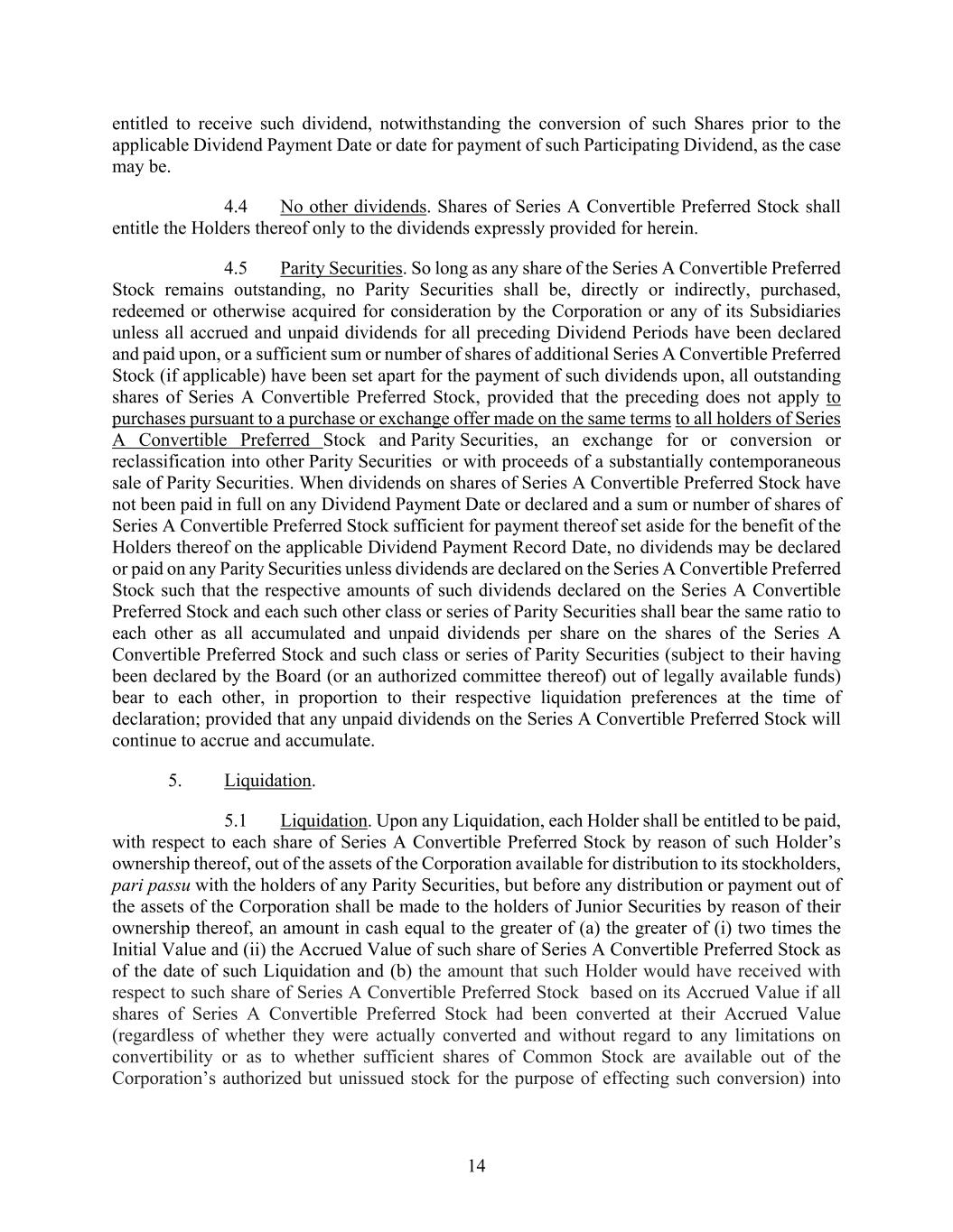 14 entitled to receive such dividend, notwithstanding the conversion of such Shares prior to the applicable Dividend Payment Date or date for payment of such Participating Dividend, as the case may be. 4.4 No other dividends. Shares of Series A Convertible Preferred Stock shall entitle the Holders thereof only to the dividends expressly provided for herein. 4.5 Parity Securities. So long as any share of the Series A Convertible Preferred Stock remains outstanding, no Parity Securities shall be, directly or indirectly, purchased, redeemed or otherwise acquired for consideration by the Corporation or any of its Subsidiaries unless all accrued and unpaid dividends for all preceding Dividend Periods have been declared and paid upon, or a sufficient sum or number of shares of additional Series A Convertible Preferred Stock (if applicable) have been set apart for the payment of such dividends upon, all outstanding shares of Series A Convertible Preferred Stock, provided that the preceding does not apply to purchases pursuant to a purchase or exchange offer made on the same terms to all holders of Series A Convertible Preferred Stock and Parity Securities, an exchange for or conversion or reclassification into other Parity Securities or with proceeds of a substantially contemporaneous sale of Parity Securities. When dividends on shares of Series A Convertible Preferred Stock have not been paid in full on any Dividend Payment Date or declared and a sum or number of shares of Series A Convertible Preferred Stock sufficient for payment thereof set aside for the benefit of the Holders thereof on the applicable Dividend Payment Record Date, no dividends may be declared or paid on any Parity Securities unless dividends are declared on the Series A Convertible Preferred Stock such that the respective amounts of such dividends declared on the Series A Convertible Preferred Stock and each such other class or series of Parity Securities shall bear the same ratio to each other as all accumulated and unpaid dividends per share on the shares of the Series A Convertible Preferred Stock and such class or series of Parity Securities (subject to their having been declared by the Board (or an authorized committee thereof) out of legally available funds) bear to each other, in proportion to their respective liquidation preferences at the time of declaration; provided that any unpaid dividends on the Series A Convertible Preferred Stock will continue to accrue and accumulate. 5. Liquidation. 5.1 Liquidation. Upon any Liquidation, each Holder shall be entitled to be paid, with respect to each share of Series A Convertible Preferred Stock by reason of such Holder’s ownership thereof, out of the assets of the Corporation available for distribution to its stockholders, pari passu with the holders of any Parity Securities, but before any distribution or payment out of the assets of the Corporation shall be made to the holders of Junior Securities by reason of their ownership thereof, an amount in cash equal to the greater of (a) the greater of (i) two times the Initial Value and (ii) the Accrued Value of such share of Series A Convertible Preferred Stock as of the date of such Liquidation and (b) the amount that such Holder would have received with respect to such share of Series A Convertible Preferred Stock based on its Accrued Value if all shares of Series A Convertible Preferred Stock had been converted at their Accrued Value (regardless of whether they were actually converted and without regard to any limitations on convertibility or as to whether sufficient shares of Common Stock are available out of the Corporation’s authorized but unissued stock for the purpose of effecting such conversion) into