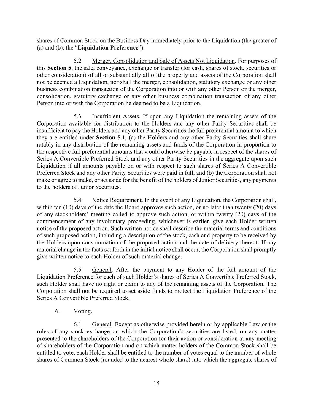 15 shares of Common Stock on the Business Day immediately prior to the Liquidation (the greater of (a) and (b), the “Liquidation Preference”). 5.2 Merger, Consolidation and Sale of Assets Not Liquidation. For purposes of this Section 5, the sale, conveyance, exchange or transfer (for cash, shares of stock, securities or other consideration) of all or substantially all of the property and assets of the Corporation shall not be deemed a Liquidation, nor shall the merger, consolidation, statutory exchange or any other business combination transaction of the Corporation into or with any other Person or the merger, consolidation, statutory exchange or any other business combination transaction of any other Person into or with the Corporation be deemed to be a Liquidation. 5.3 Insufficient Assets. If upon any Liquidation the remaining assets of the Corporation available for distribution to the Holders and any other Parity Securities shall be insufficient to pay the Holders and any other Parity Securities the full preferential amount to which they are entitled under Section 5.1, (a) the Holders and any other Parity Securities shall share ratably in any distribution of the remaining assets and funds of the Corporation in proportion to the respective full preferential amounts that would otherwise be payable in respect of the shares of Series A Convertible Preferred Stock and any other Parity Securities in the aggregate upon such Liquidation if all amounts payable on or with respect to such shares of Series A Convertible Preferred Stock and any other Parity Securities were paid in full, and (b) the Corporation shall not make or agree to make, or set aside for the benefit of the holders of Junior Securities, any payments to the holders of Junior Securities. 5.4 Notice Requirement. In the event of any Liquidation, the Corporation shall, within ten (10) days of the date the Board approves such action, or no later than twenty (20) days of any stockholders’ meeting called to approve such action, or within twenty (20) days of the commencement of any involuntary proceeding, whichever is earlier, give each Holder written notice of the proposed action. Such written notice shall describe the material terms and conditions of such proposed action, including a description of the stock, cash and property to be received by the Holders upon consummation of the proposed action and the date of delivery thereof. If any material change in the facts set forth in the initial notice shall occur, the Corporation shall promptly give written notice to each Holder of such material change. 5.5 General. After the payment to any Holder of the full amount of the Liquidation Preference for each of such Holder’s shares of Series A Convertible Preferred Stock, such Holder shall have no right or claim to any of the remaining assets of the Corporation. The Corporation shall not be required to set aside funds to protect the Liquidation Preference of the Series A Convertible Preferred Stock. 6. Voting. 6.1 General. Except as otherwise provided herein or by applicable Law or the rules of any stock exchange on which the Corporation’s securities are listed, on any matter presented to the shareholders of the Corporation for their action or consideration at any meeting of shareholders of the Corporation and on which matter holders of the Common Stock shall be entitled to vote, each Holder shall be entitled to the number of votes equal to the number of whole shares of Common Stock (rounded to the nearest whole share) into which the aggregate shares of