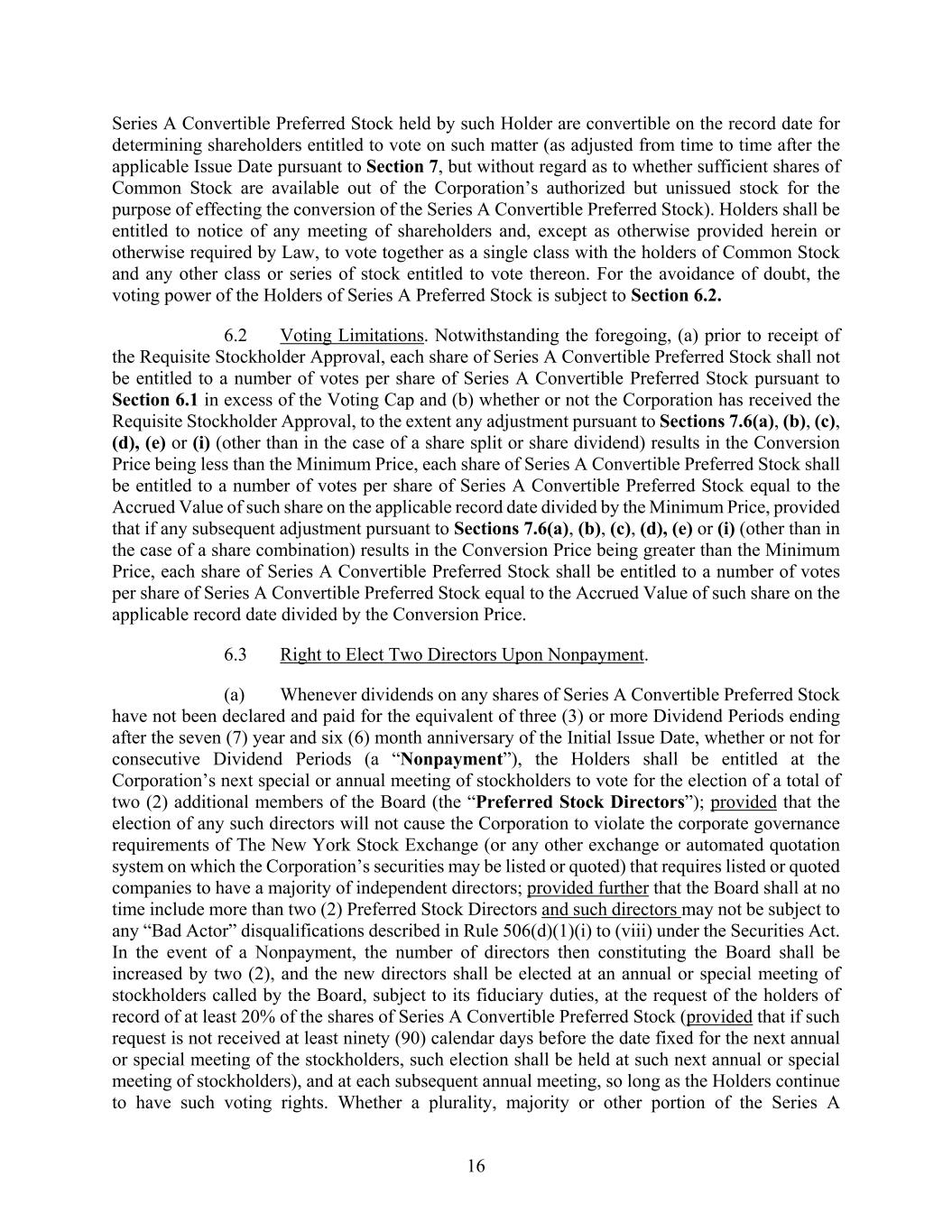16 Series A Convertible Preferred Stock held by such Holder are convertible on the record date for determining shareholders entitled to vote on such matter (as adjusted from time to time after the applicable Issue Date pursuant to Section 7, but without regard as to whether sufficient shares of Common Stock are available out of the Corporation’s authorized but unissued stock for the purpose of effecting the conversion of the Series A Convertible Preferred Stock). Holders shall be entitled to notice of any meeting of shareholders and, except as otherwise provided herein or otherwise required by Law, to vote together as a single class with the holders of Common Stock and any other class or series of stock entitled to vote thereon. For the avoidance of doubt, the voting power of the Holders of Series A Preferred Stock is subject to Section 6.2. 6.2 Voting Limitations. Notwithstanding the foregoing, (a) prior to receipt of the Requisite Stockholder Approval, each share of Series A Convertible Preferred Stock shall not be entitled to a number of votes per share of Series A Convertible Preferred Stock pursuant to Section 6.1 in excess of the Voting Cap and (b) whether or not the Corporation has received the Requisite Stockholder Approval, to the extent any adjustment pursuant to Sections 7.6(a), (b), (c), (d), (e) or (i) (other than in the case of a share split or share dividend) results in the Conversion Price being less than the Minimum Price, each share of Series A Convertible Preferred Stock shall be entitled to a number of votes per share of Series A Convertible Preferred Stock equal to the Accrued Value of such share on the applicable record date divided by the Minimum Price, provided that if any subsequent adjustment pursuant to Sections 7.6(a), (b), (c), (d), (e) or (i) (other than in the case of a share combination) results in the Conversion Price being greater than the Minimum Price, each share of Series A Convertible Preferred Stock shall be entitled to a number of votes per share of Series A Convertible Preferred Stock equal to the Accrued Value of such share on the applicable record date divided by the Conversion Price. 6.3 Right to Elect Two Directors Upon Nonpayment. (a) Whenever dividends on any shares of Series A Convertible Preferred Stock have not been declared and paid for the equivalent of three (3) or more Dividend Periods ending after the seven (7) year and six (6) month anniversary of the Initial Issue Date, whether or not for consecutive Dividend Periods (a “Nonpayment”), the Holders shall be entitled at the Corporation’s next special or annual meeting of stockholders to vote for the election of a total of two (2) additional members of the Board (the “Preferred Stock Directors”); provided that the election of any such directors will not cause the Corporation to violate the corporate governance requirements of The New York Stock Exchange (or any other exchange or automated quotation system on which the Corporation’s securities may be listed or quoted) that requires listed or quoted companies to have a majority of independent directors; provided further that the Board shall at no time include more than two (2) Preferred Stock Directors and such directors may not be subject to any “Bad Actor” disqualifications described in Rule 506(d)(1)(i) to (viii) under the Securities Act. In the event of a Nonpayment, the number of directors then constituting the Board shall be increased by two (2), and the new directors shall be elected at an annual or special meeting of stockholders called by the Board, subject to its fiduciary duties, at the request of the holders of record of at least 20% of the shares of Series A Convertible Preferred Stock (provided that if such request is not received at least ninety (90) calendar days before the date fixed for the next annual or special meeting of the stockholders, such election shall be held at such next annual or special meeting of stockholders), and at each subsequent annual meeting, so long as the Holders continue to have such voting rights. Whether a plurality, majority or other portion of the Series A