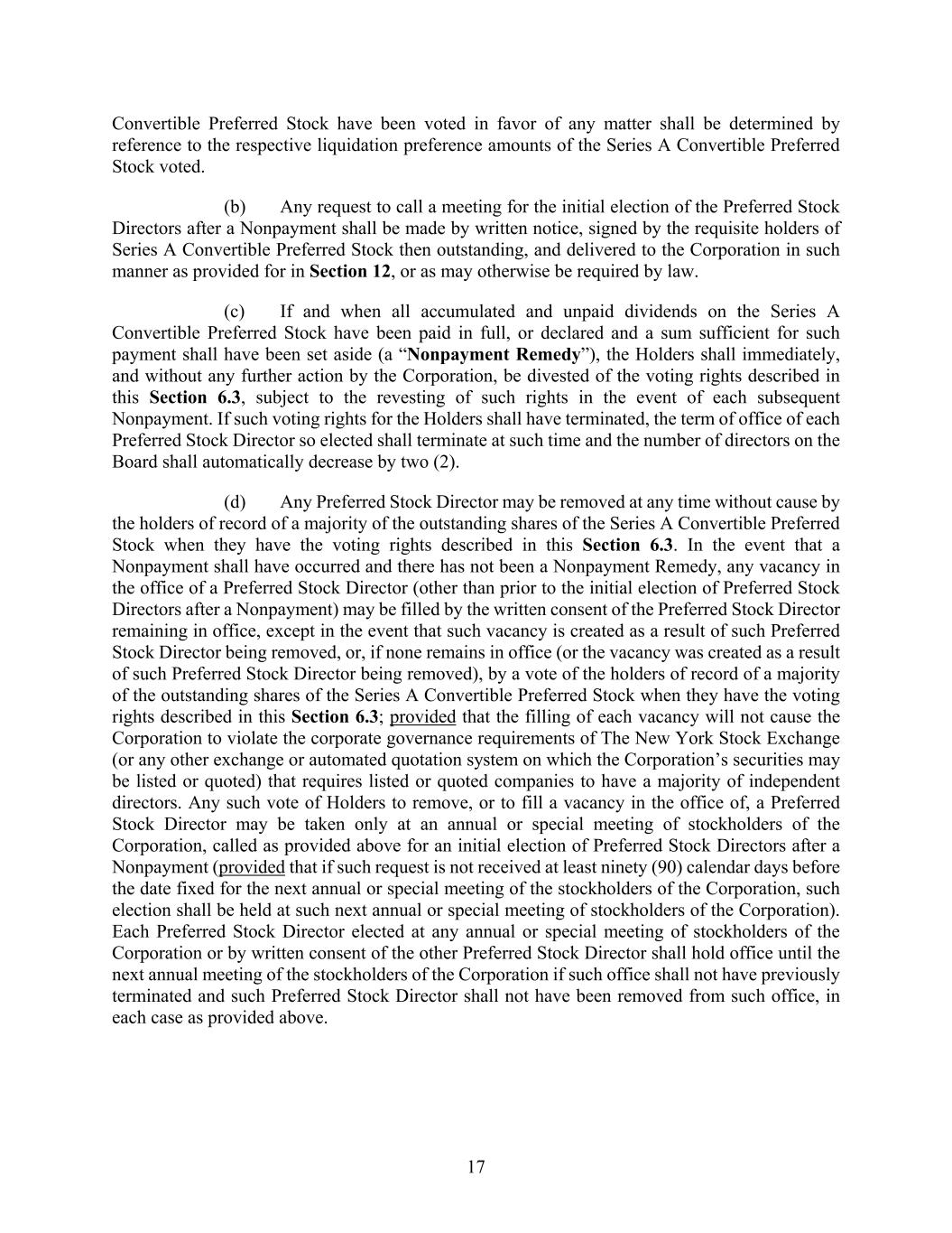 17 Convertible Preferred Stock have been voted in favor of any matter shall be determined by reference to the respective liquidation preference amounts of the Series A Convertible Preferred Stock voted. (b) Any request to call a meeting for the initial election of the Preferred Stock Directors after a Nonpayment shall be made by written notice, signed by the requisite holders of Series A Convertible Preferred Stock then outstanding, and delivered to the Corporation in such manner as provided for in Section 12, or as may otherwise be required by law. (c) If and when all accumulated and unpaid dividends on the Series A Convertible Preferred Stock have been paid in full, or declared and a sum sufficient for such payment shall have been set aside (a “Nonpayment Remedy”), the Holders shall immediately, and without any further action by the Corporation, be divested of the voting rights described in this Section 6.3, subject to the revesting of such rights in the event of each subsequent Nonpayment. If such voting rights for the Holders shall have terminated, the term of office of each Preferred Stock Director so elected shall terminate at such time and the number of directors on the Board shall automatically decrease by two (2). (d) Any Preferred Stock Director may be removed at any time without cause by the holders of record of a majority of the outstanding shares of the Series A Convertible Preferred Stock when they have the voting rights described in this Section 6.3. In the event that a Nonpayment shall have occurred and there has not been a Nonpayment Remedy, any vacancy in the office of a Preferred Stock Director (other than prior to the initial election of Preferred Stock Directors after a Nonpayment) may be filled by the written consent of the Preferred Stock Director remaining in office, except in the event that such vacancy is created as a result of such Preferred Stock Director being removed, or, if none remains in office (or the vacancy was created as a result of such Preferred Stock Director being removed), by a vote of the holders of record of a majority of the outstanding shares of the Series A Convertible Preferred Stock when they have the voting rights described in this Section 6.3; provided that the filling of each vacancy will not cause the Corporation to violate the corporate governance requirements of The New York Stock Exchange (or any other exchange or automated quotation system on which the Corporation’s securities may be listed or quoted) that requires listed or quoted companies to have a majority of independent directors. Any such vote of Holders to remove, or to fill a vacancy in the office of, a Preferred Stock Director may be taken only at an annual or special meeting of stockholders of the Corporation, called as provided above for an initial election of Preferred Stock Directors after a Nonpayment (provided that if such request is not received at least ninety (90) calendar days before the date fixed for the next annual or special meeting of the stockholders of the Corporation, such election shall be held at such next annual or special meeting of stockholders of the Corporation). Each Preferred Stock Director elected at any annual or special meeting of stockholders of the Corporation or by written consent of the other Preferred Stock Director shall hold office until the next annual meeting of the stockholders of the Corporation if such office shall not have previously terminated and such Preferred Stock Director shall not have been removed from such office, in each case as provided above.