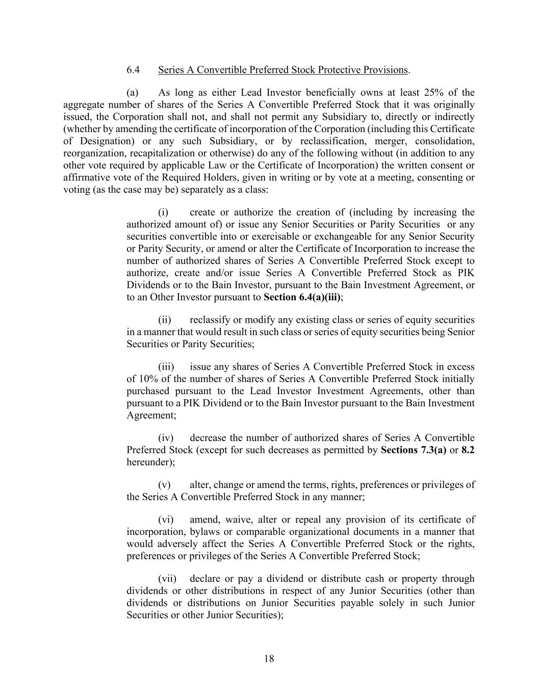 18 6.4 Series A Convertible Preferred Stock Protective Provisions. (a) As long as either Lead Investor beneficially owns at least 25% of the aggregate number of shares of the Series A Convertible Preferred Stock that it was originally issued, the Corporation shall not, and shall not permit any Subsidiary to, directly or indirectly (whether by amending the certificate of incorporation of the Corporation (including this Certificate of Designation) or any such Subsidiary, or by reclassification, merger, consolidation, reorganization, recapitalization or otherwise) do any of the following without (in addition to any other vote required by applicable Law or the Certificate of Incorporation) the written consent or affirmative vote of the Required Holders, given in writing or by vote at a meeting, consenting or voting (as the case may be) separately as a class: (i) create or authorize the creation of (including by increasing the authorized amount of) or issue any Senior Securities or Parity Securities or any securities convertible into or exercisable or exchangeable for any Senior Security or Parity Security, or amend or alter the Certificate of Incorporation to increase the number of authorized shares of Series A Convertible Preferred Stock except to authorize, create and/or issue Series A Convertible Preferred Stock as PIK Dividends or to the Bain Investor, pursuant to the Bain Investment Agreement, or to an Other Investor pursuant to Section 6.4(a)(iii); (ii) reclassify or modify any existing class or series of equity securities in a manner that would result in such class or series of equity securities being Senior Securities or Parity Securities; (iii) issue any shares of Series A Convertible Preferred Stock in excess of 10% of the number of shares of Series A Convertible Preferred Stock initially purchased pursuant to the Lead Investor Investment Agreements, other than pursuant to a PIK Dividend or to the Bain Investor pursuant to the Bain Investment Agreement; (iv) decrease the number of authorized shares of Series A Convertible Preferred Stock (except for such decreases as permitted by Sections 7.3(a) or 8.2 hereunder); (v) alter, change or amend the terms, rights, preferences or privileges of the Series A Convertible Preferred Stock in any manner; (vi) amend, waive, alter or repeal any provision of its certificate of incorporation, bylaws or comparable organizational documents in a manner that would adversely affect the Series A Convertible Preferred Stock or the rights, preferences or privileges of the Series A Convertible Preferred Stock; (vii) declare or pay a dividend or distribute cash or property through dividends or other distributions in respect of any Junior Securities (other than dividends or distributions on Junior Securities payable solely in such Junior Securities or other Junior Securities);